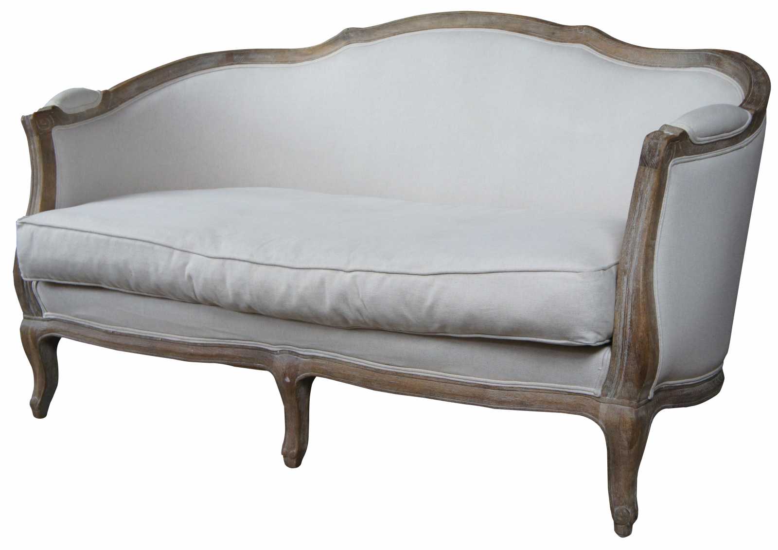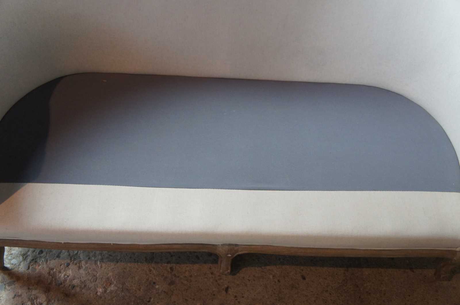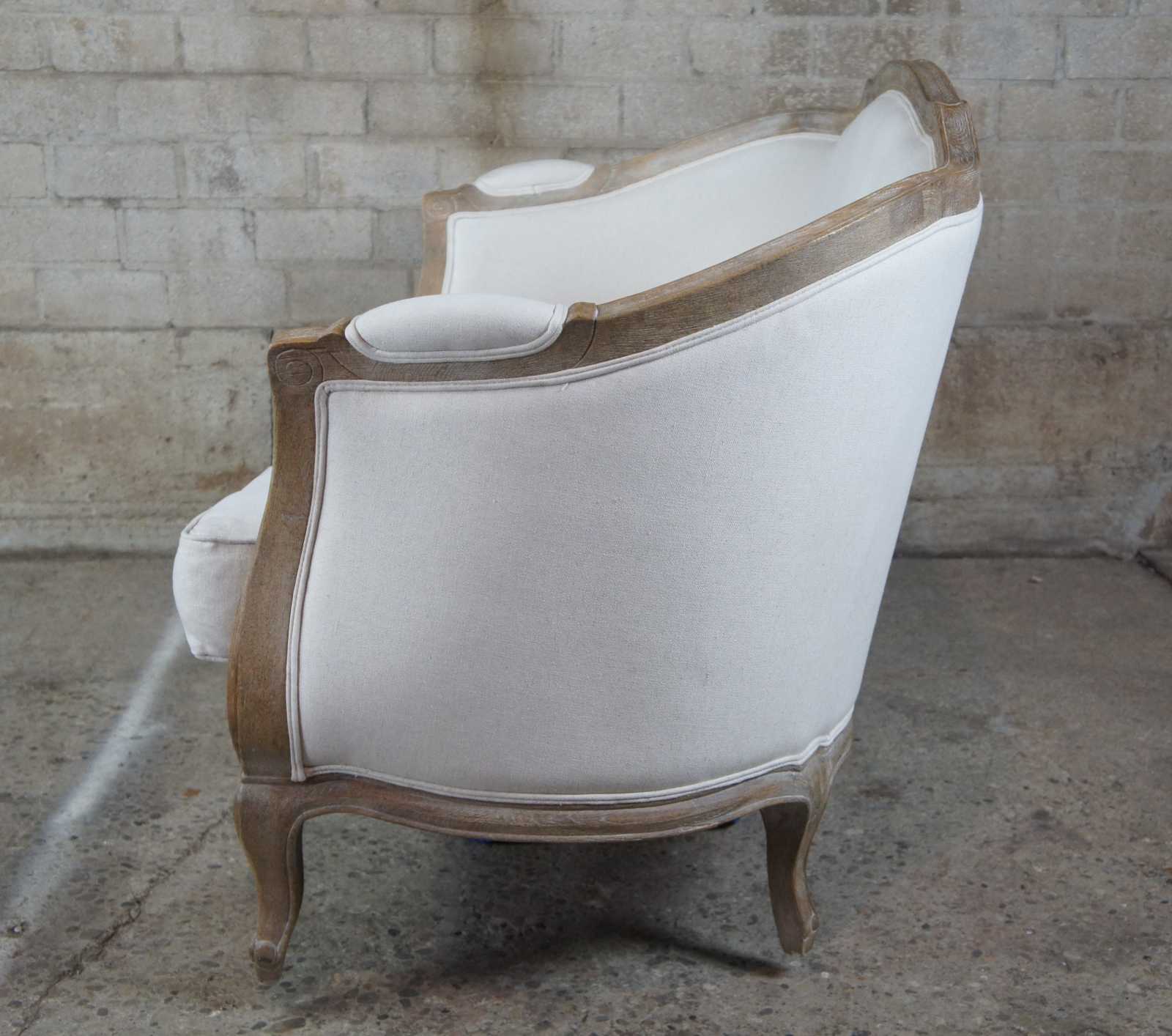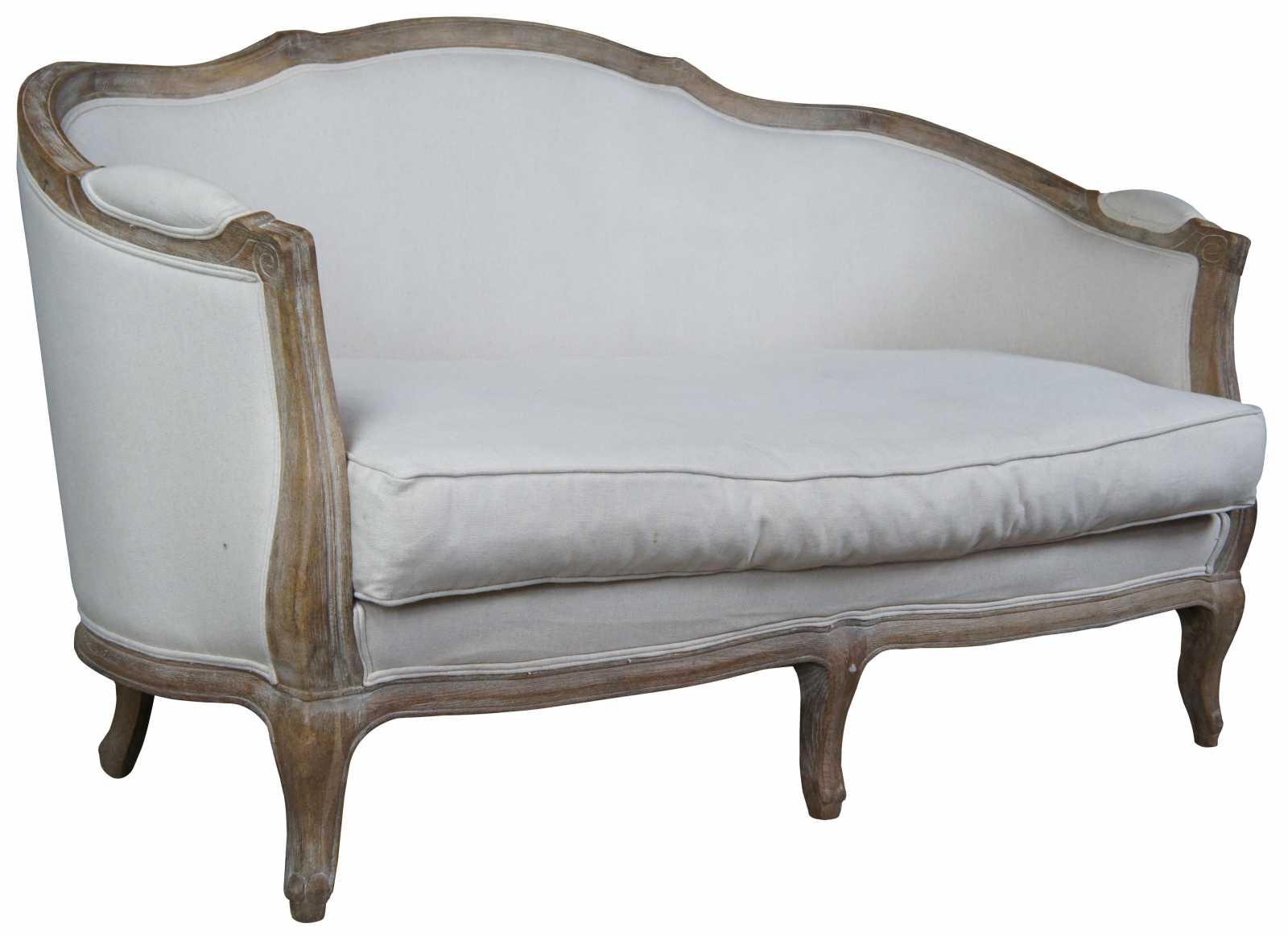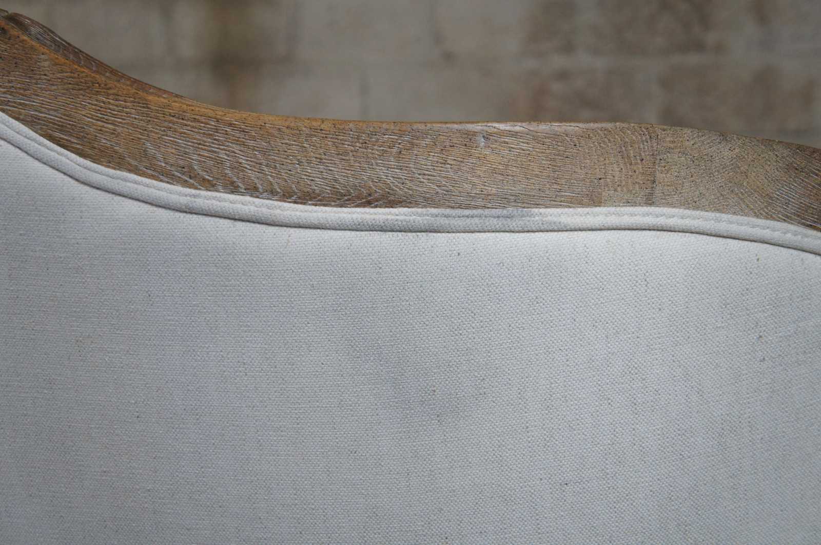 With its perfect proportions and cushioned, wrap-around back, this French settee creates a cozy retreat for a bedroom or sitting room. Limed finished, solid oak frame is crafted in the classic Louis XV style with fluted scrolling arms, serpentine skirt and cabriole legs. Circa 2010