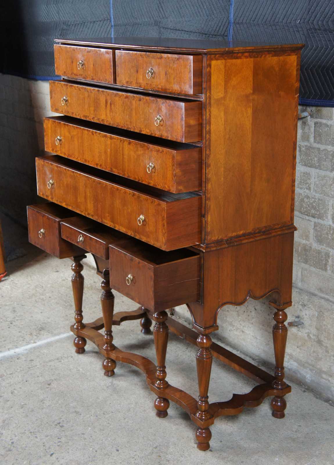 Iconic Maitland Smith William & Mary Style Highboy. Mahogany with herring-bone cross banding, two piece with upper having two over three graduated drawers, signed on inside of top center drawer, lower section with three drawers, brass knobs, baluster turned legs and scrolled stretcher base