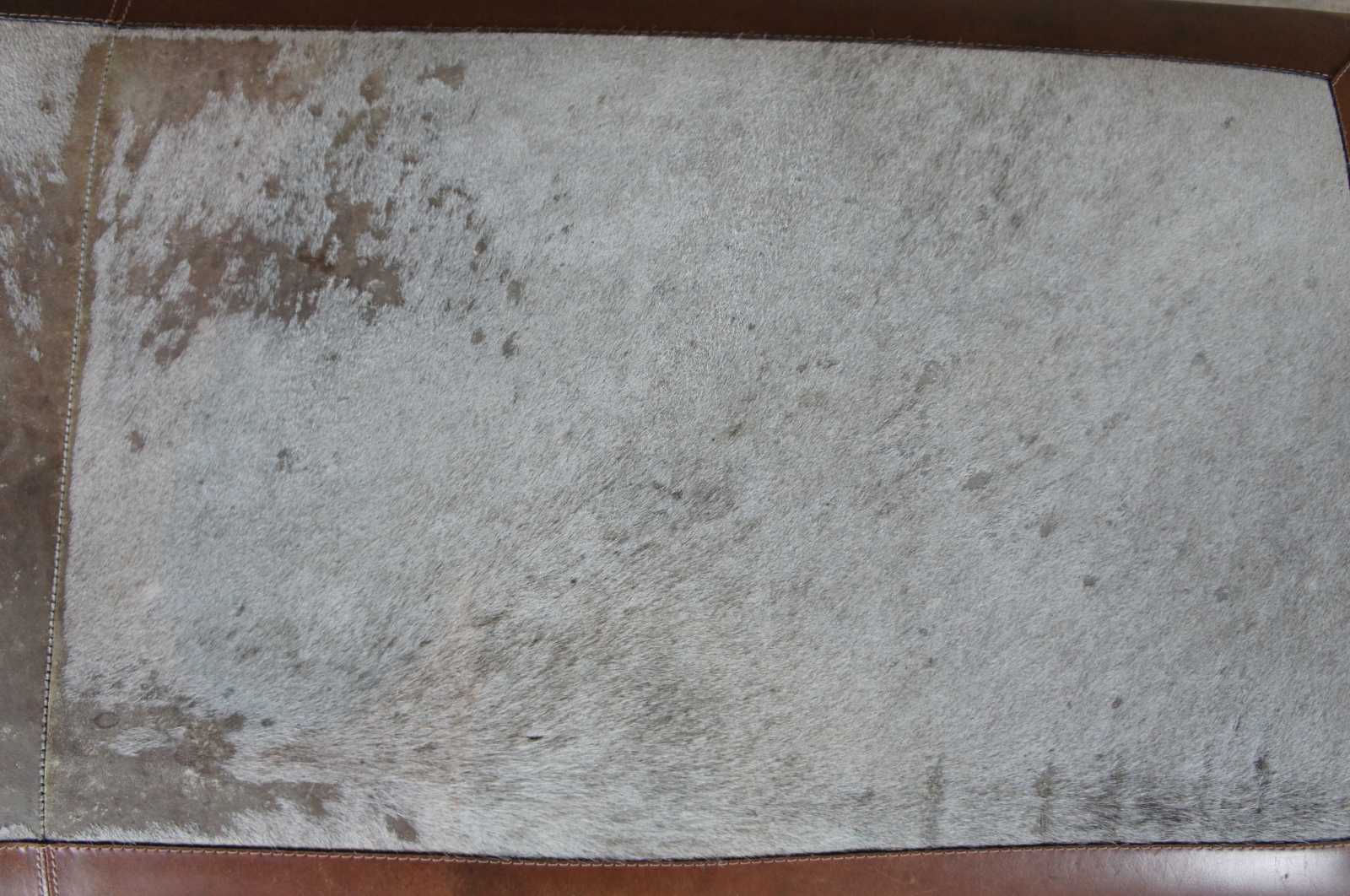 Frontgate X frame French Empire inspired bench. Upholstered in a brown leather with cowhid along the top.