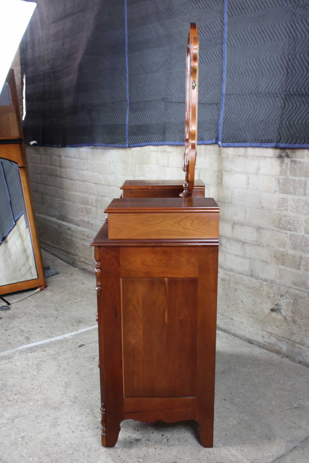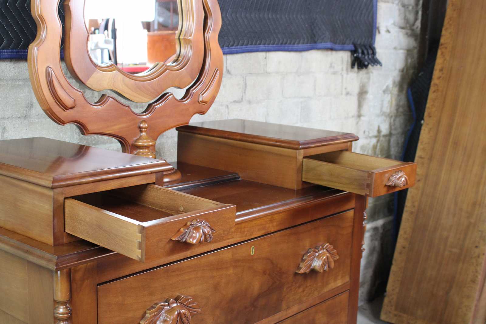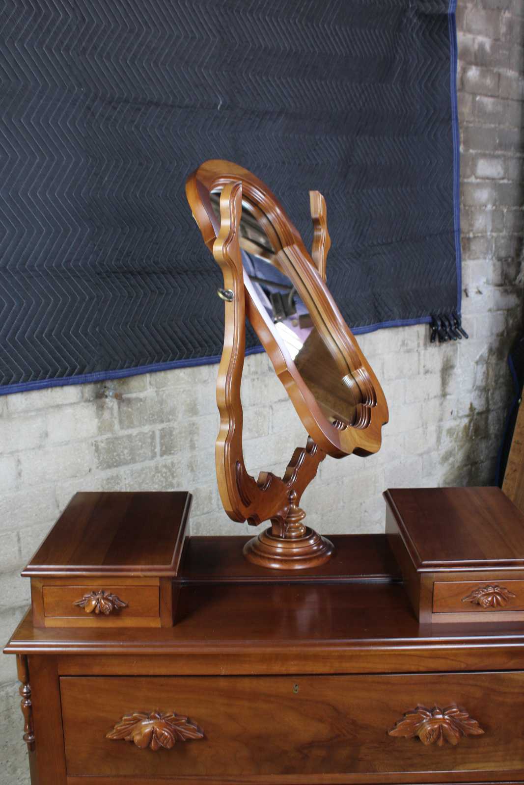 Vintage Cassady Furniture Co solid cherry victorian dresser with wishbone mirror. A Victorian reproduction featuring three dovetailed lower drawers, two glove boxes and a swivel vanity mirror. Cassady Furniture is out of Bowling Green Kentucky, circa 1980s.