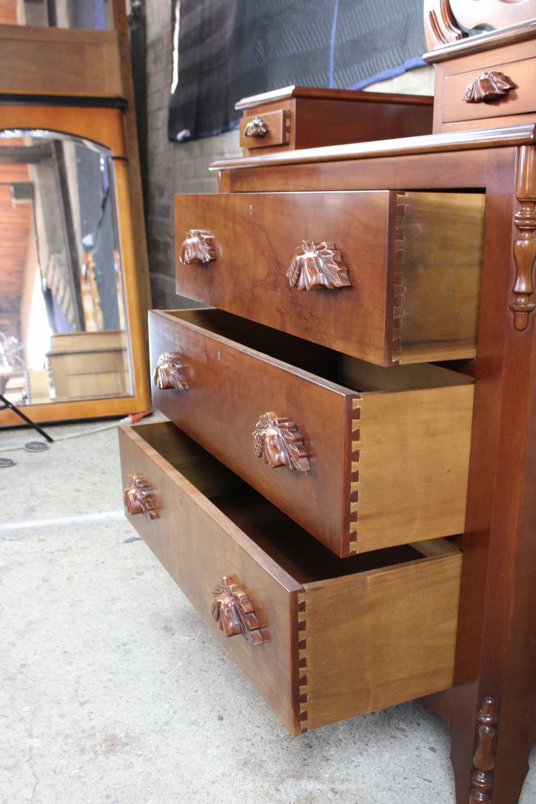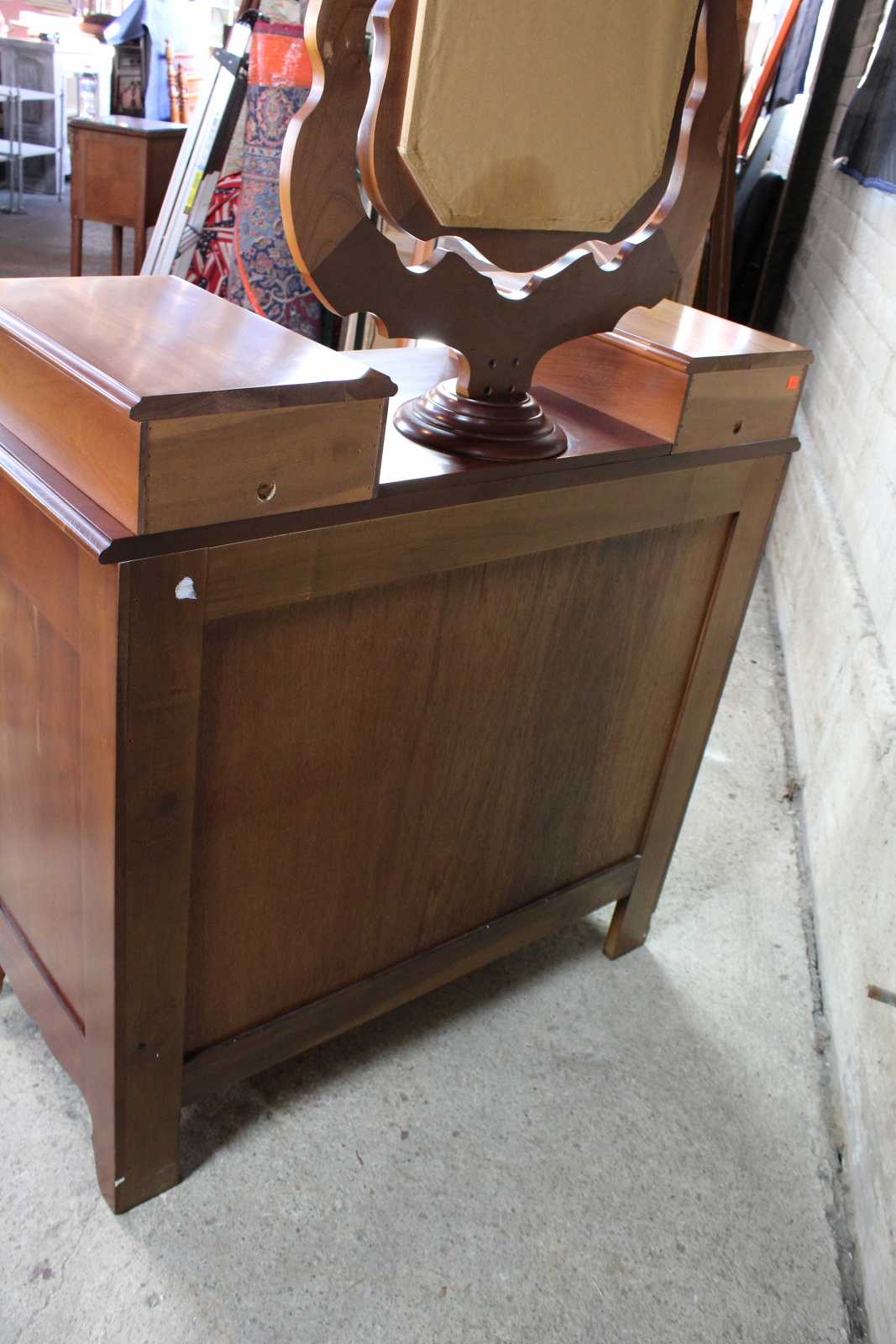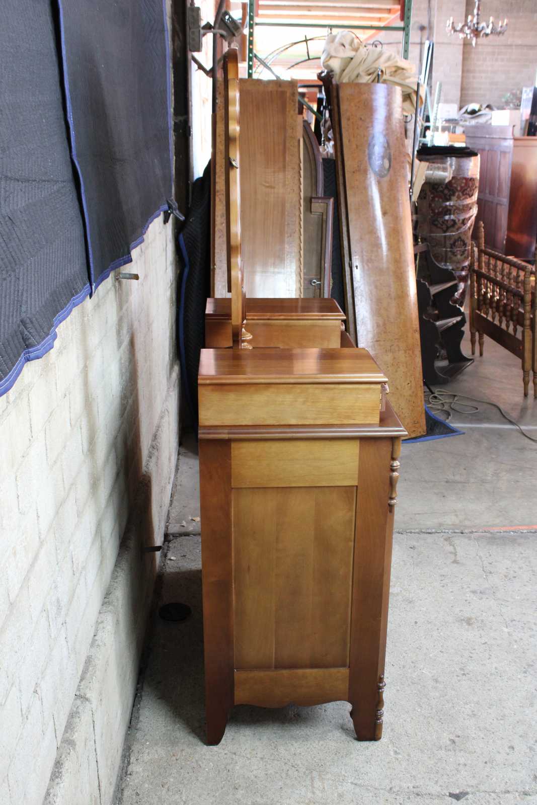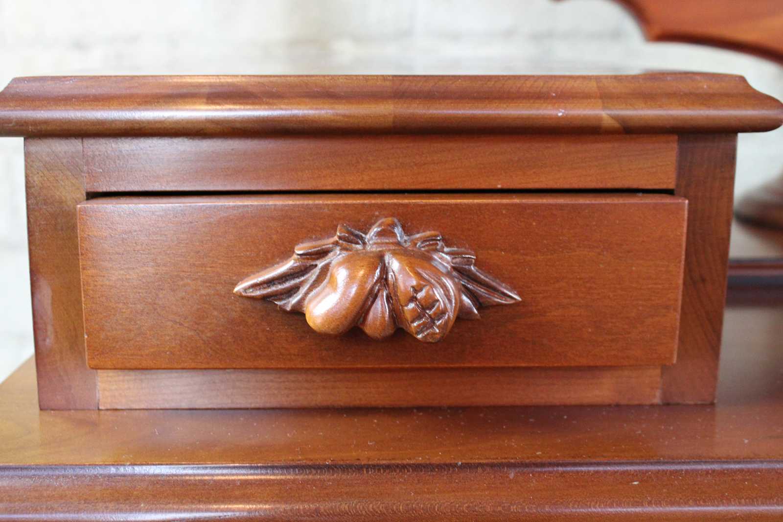 Vintage Cassady Furniture Co solid cherry victorian dresser with wishbone mirror. A Victorian reproduction featuring three dovetailed lower drawers, two glove boxes and a swivel vanity mirror. Cassady Furniture is out of Bowling Green Kentucky, circa 1980s.