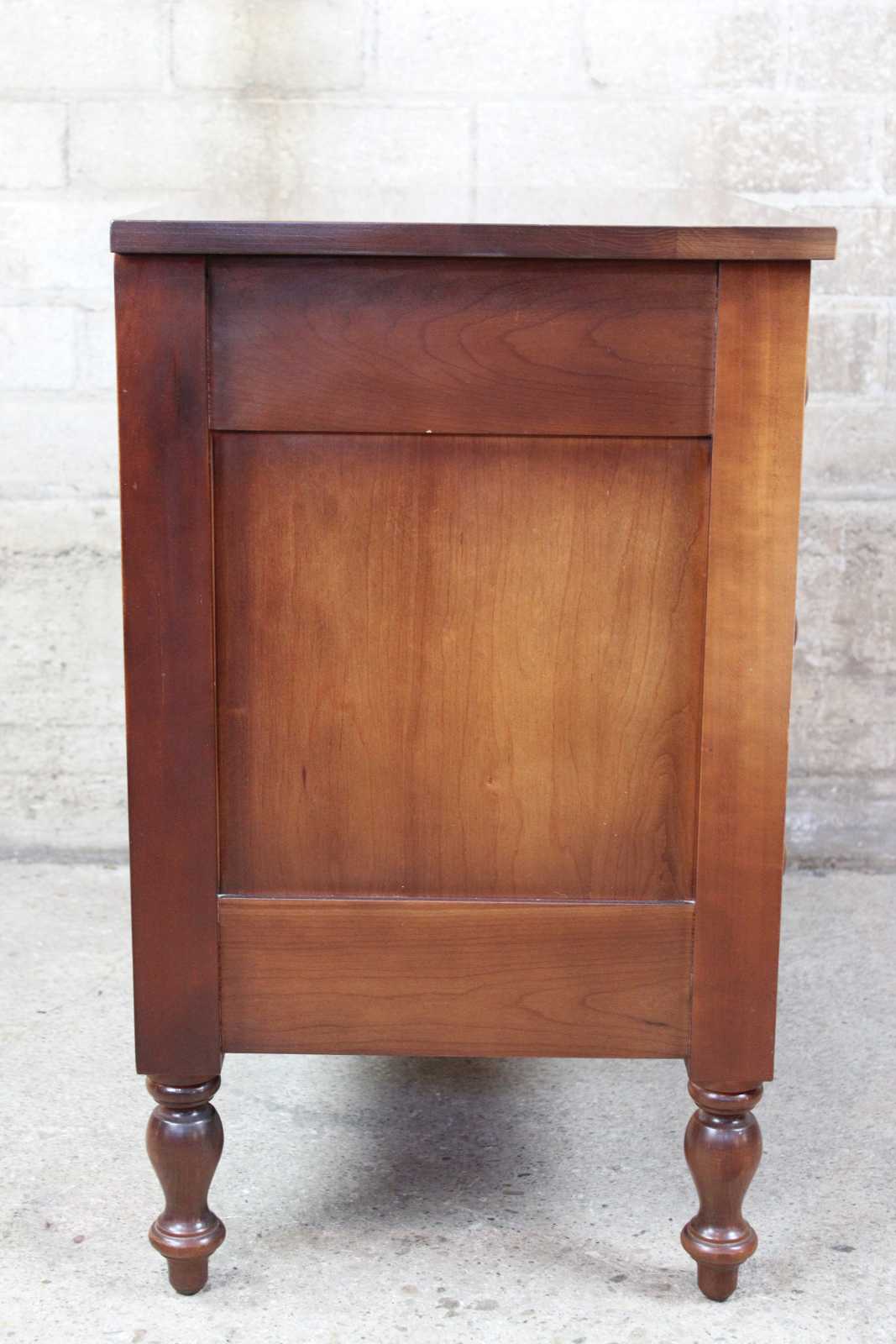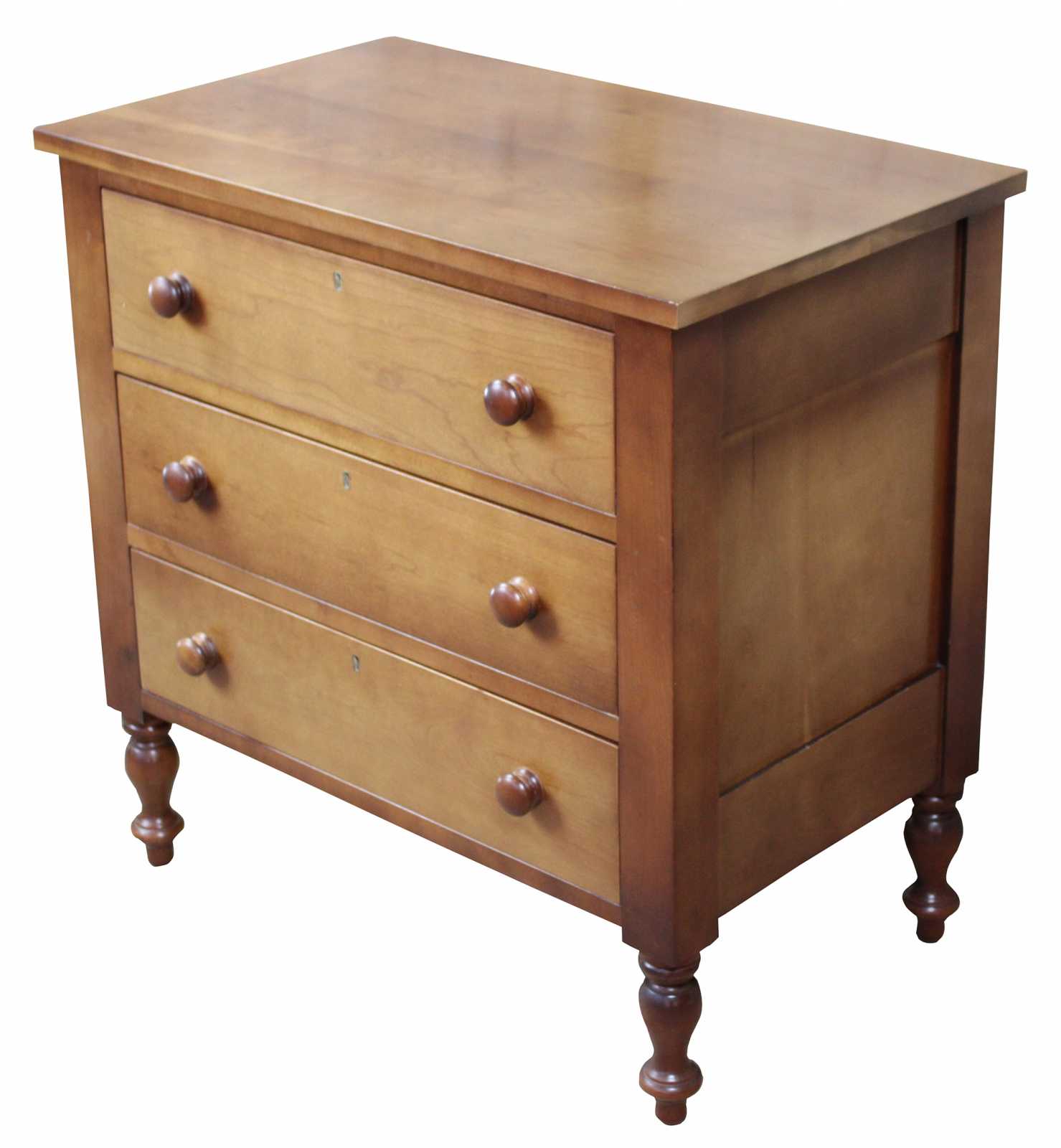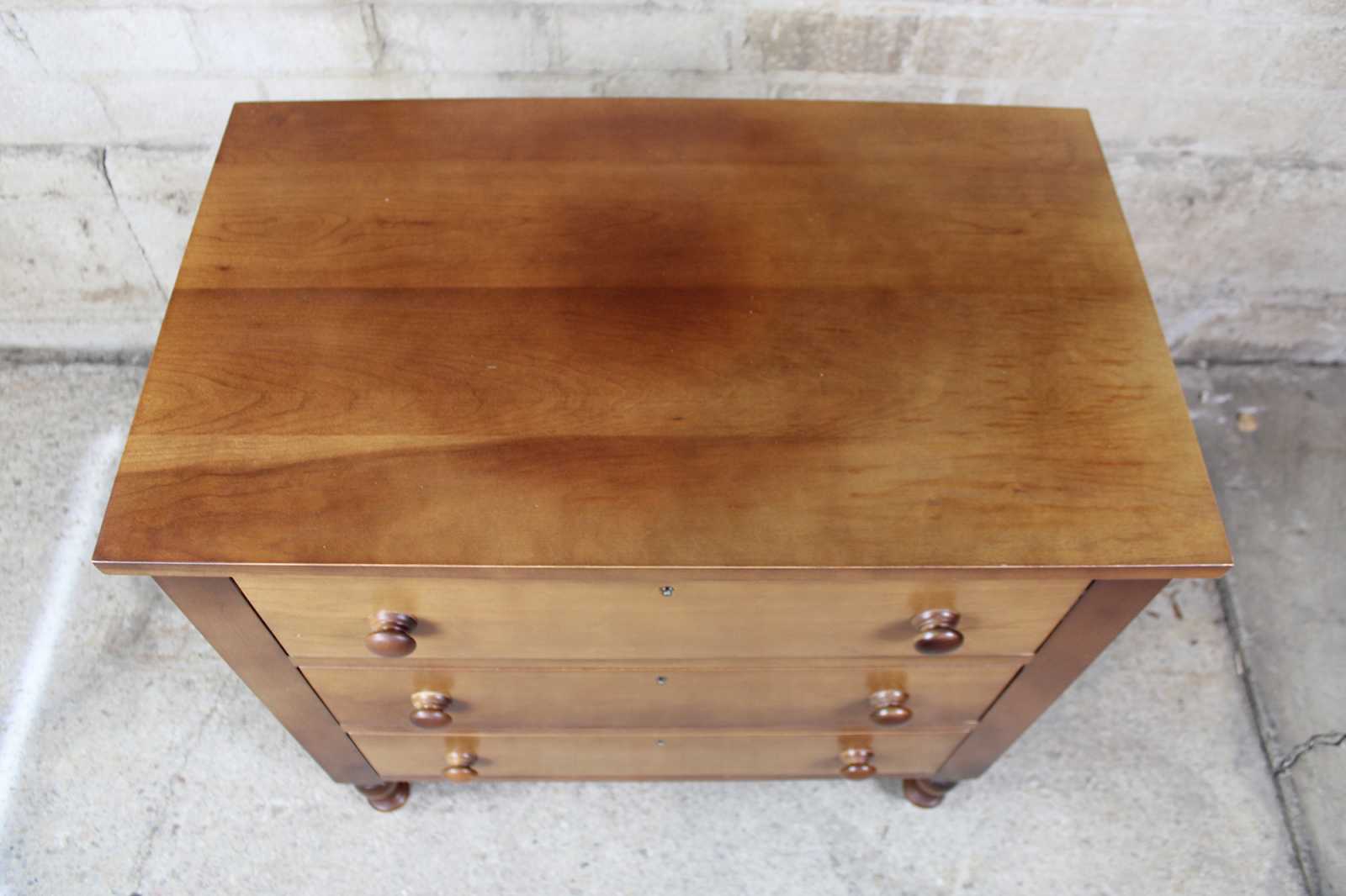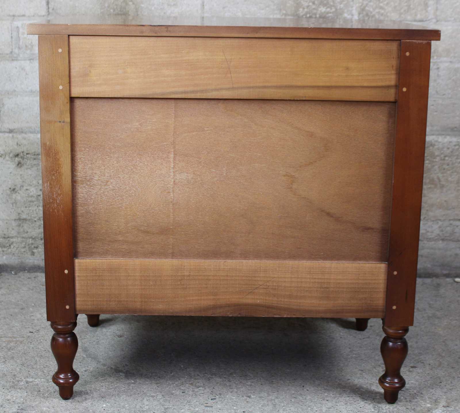 Vintage Cassady Furniture Co solid cherry dresser, chest or nightstand. An Early American reproduction featuring three dovetailed drawers. Cassady Furniture is out of Bowling Green Kentucky, circa 1980s.