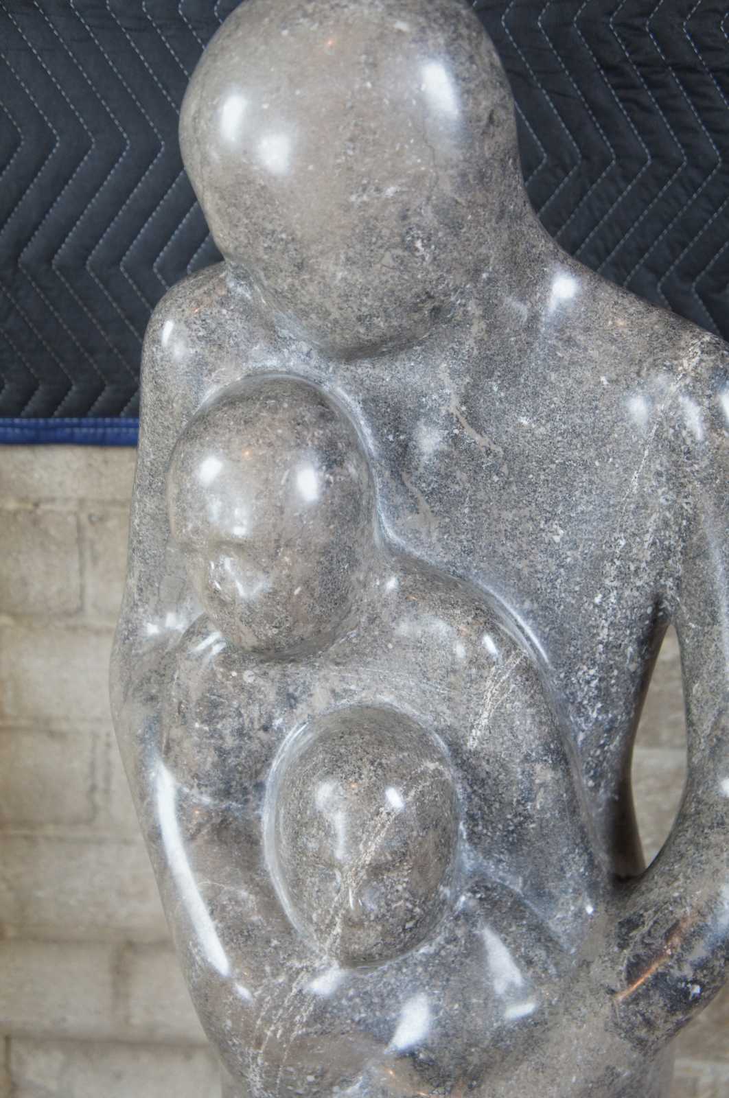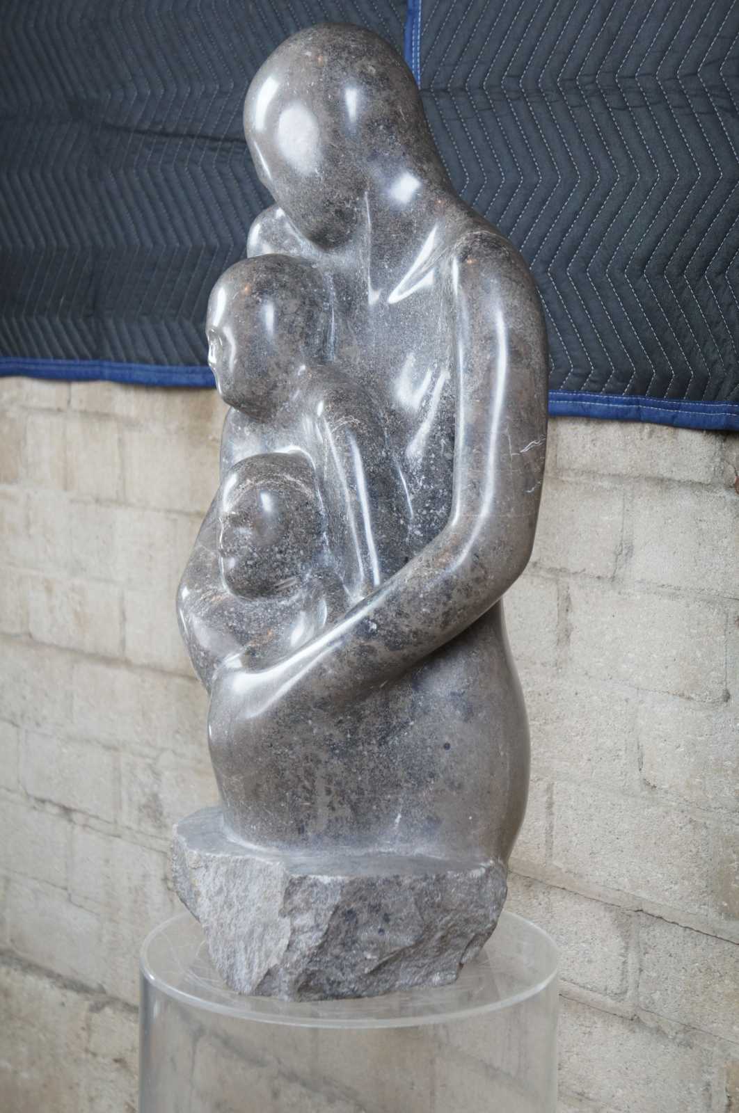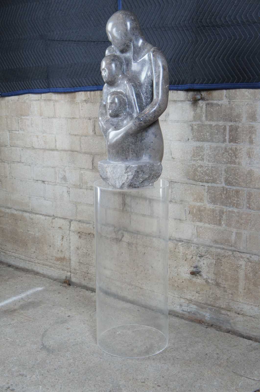 G Turner 1978 Marble Sculpture with lucite base. Features a woman holding onto her children. Singed along the edge of base.