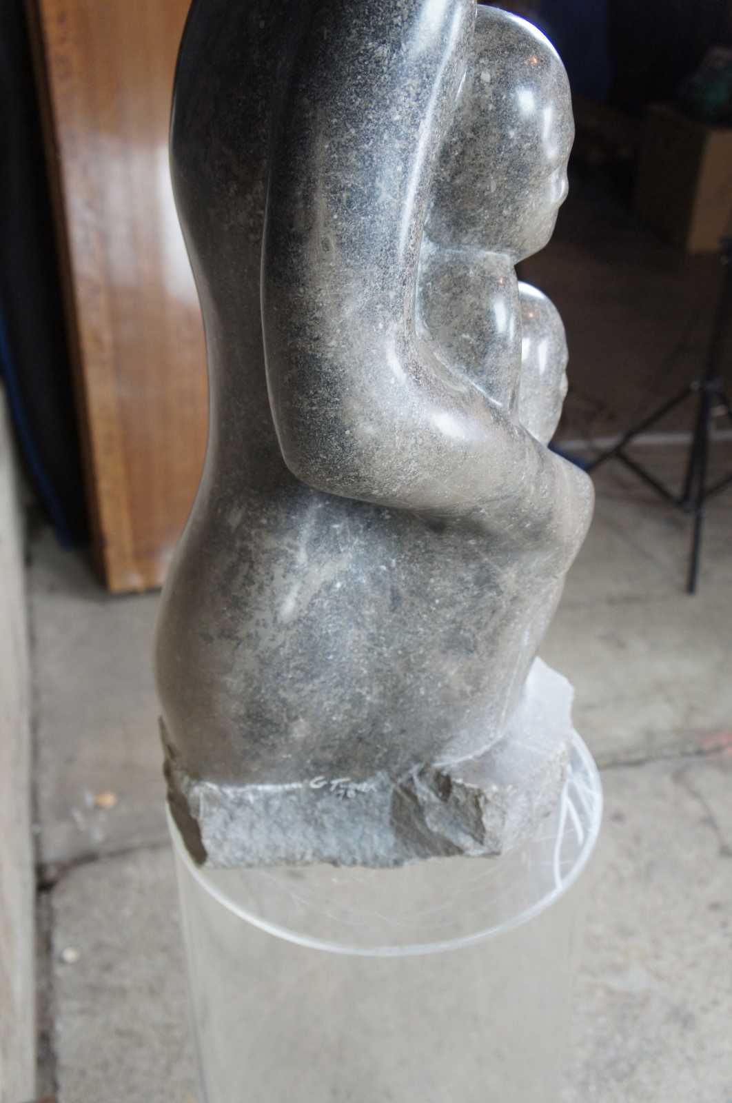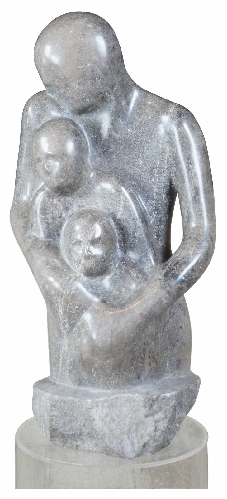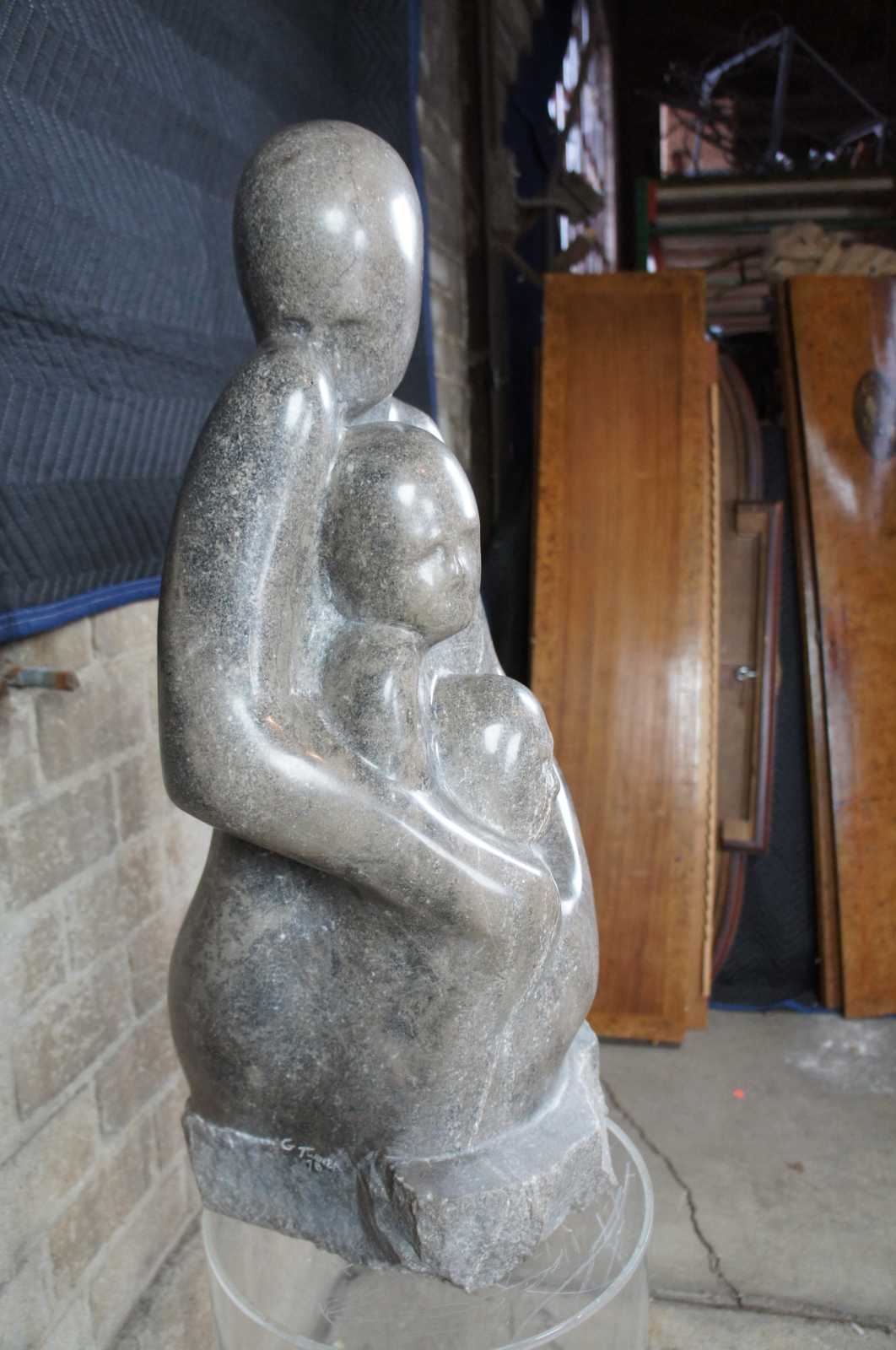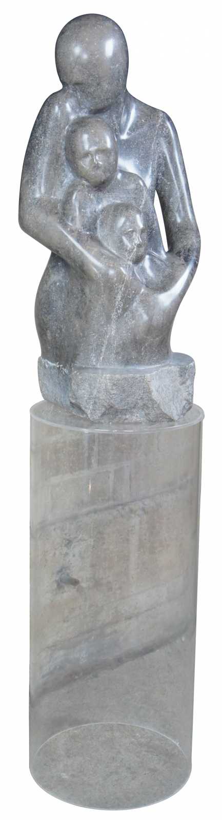 G Turner 1978 Marble Sculpture with lucite base. Features a woman holding onto her children. Singed along the edge of base.