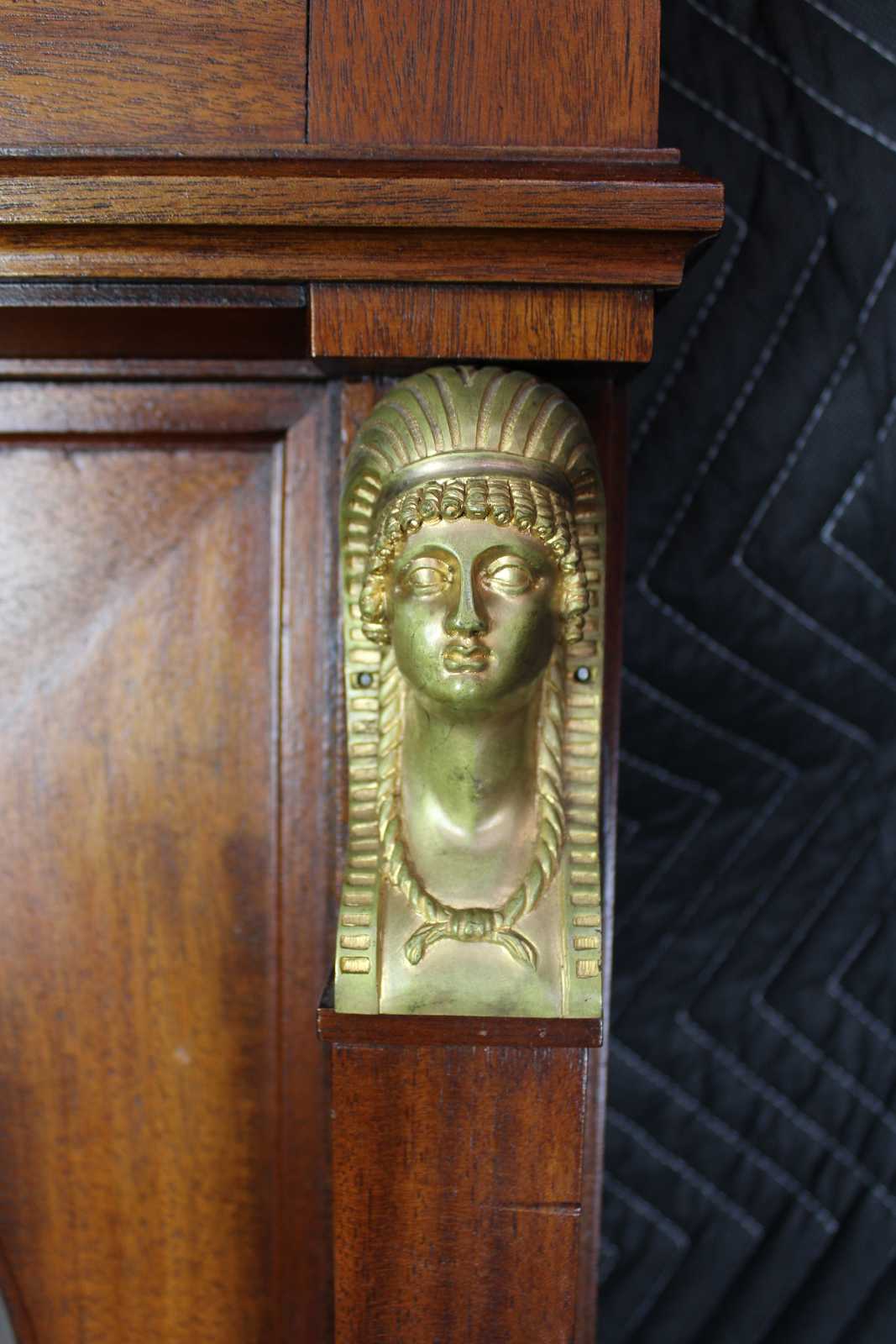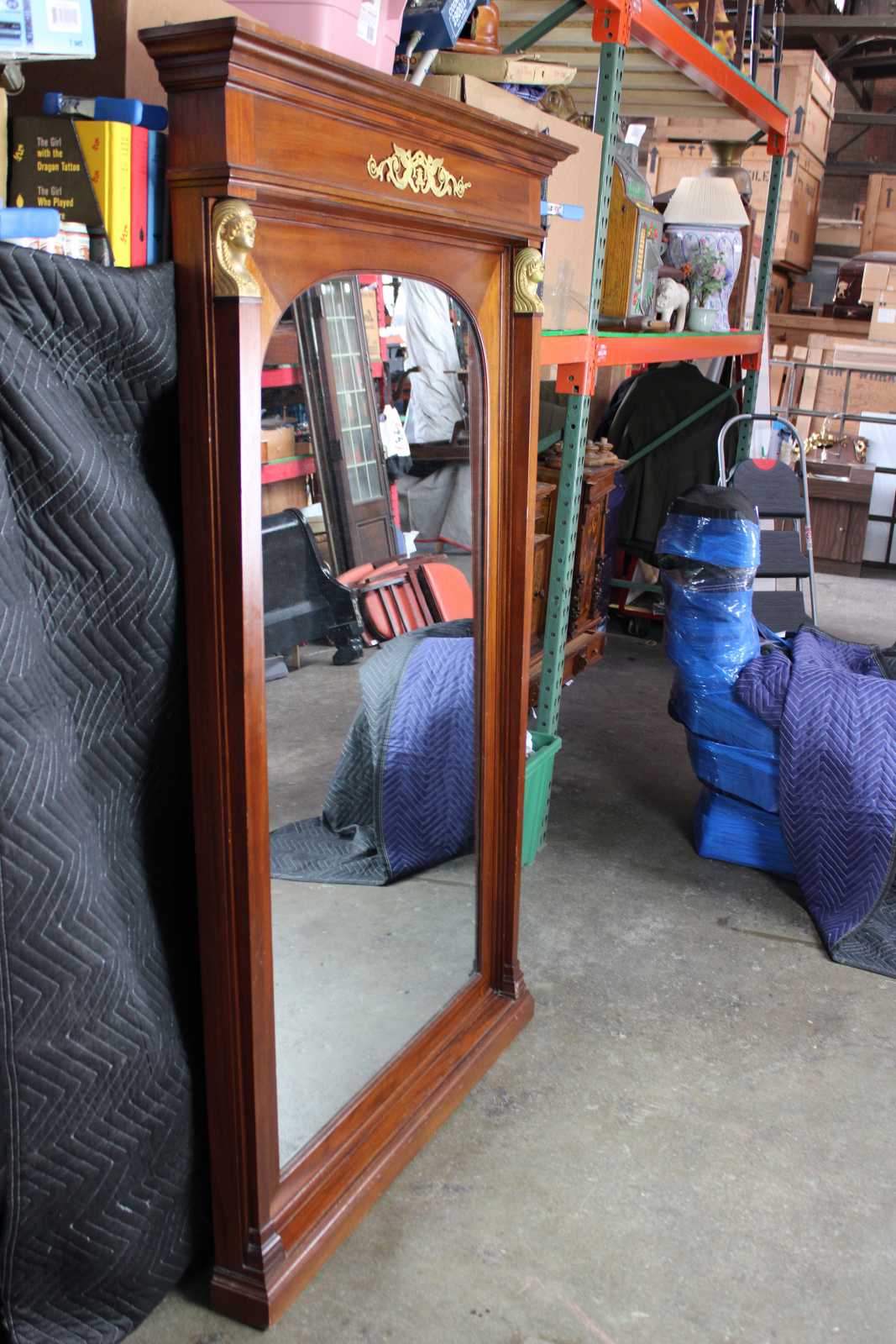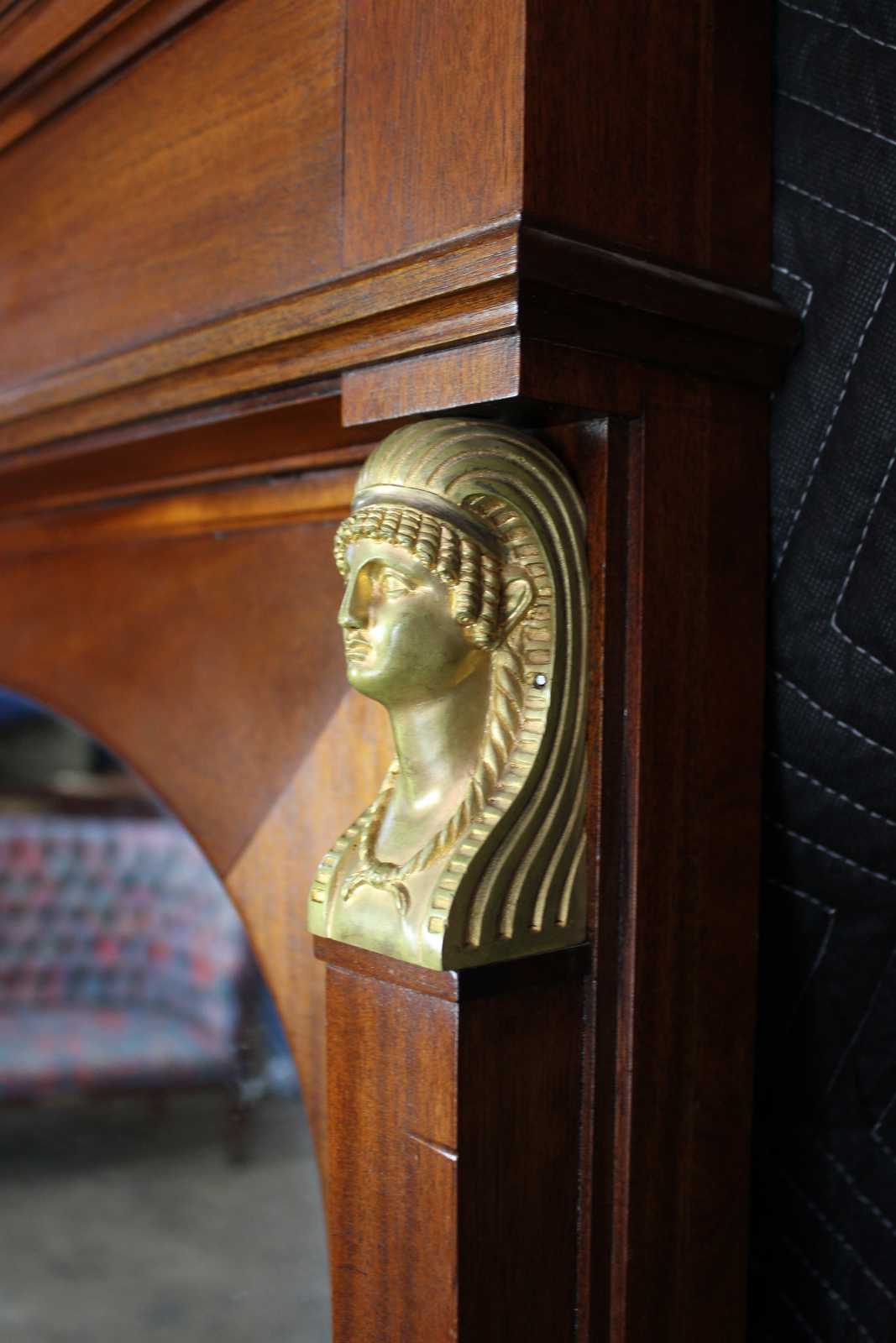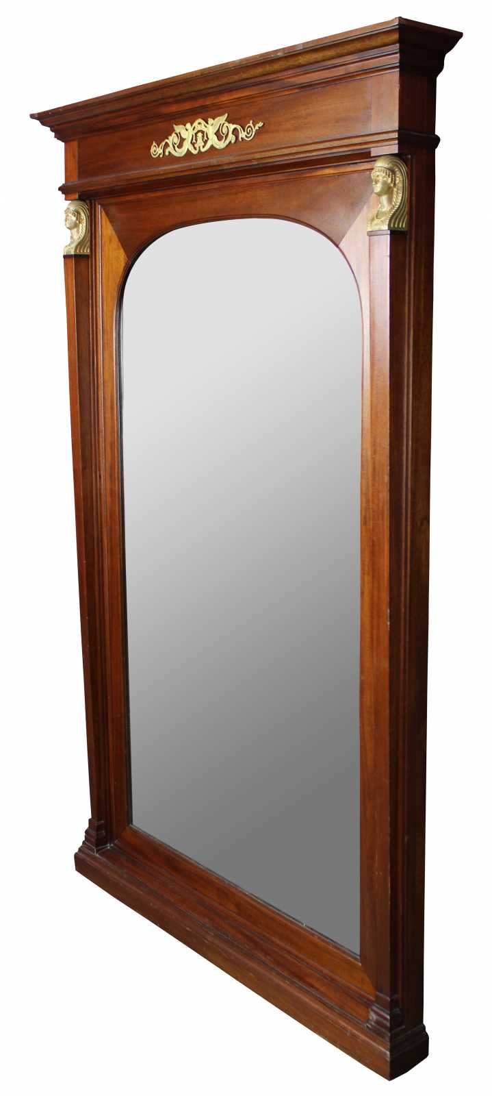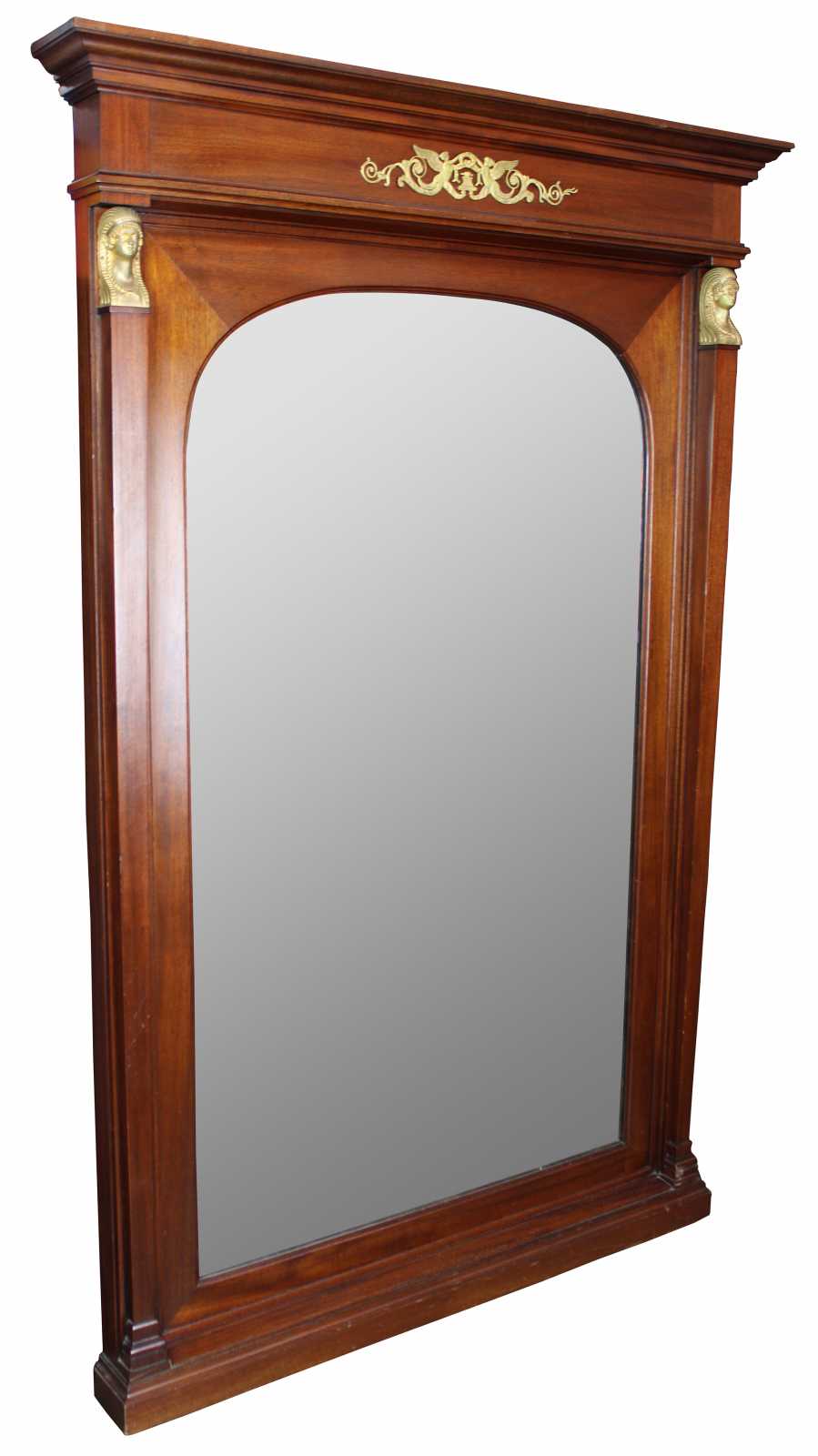 Egyptian Revival mahogany over mantel, wall or floor mirror. Features an arched center between two square tapered columns with bronze caryatid mounts. The mirror is capped with a classical inspired bronze mount showing two winged angels holding a wreath over a bell. A great fit with European, Regency, Empire or Neoclassical decor.