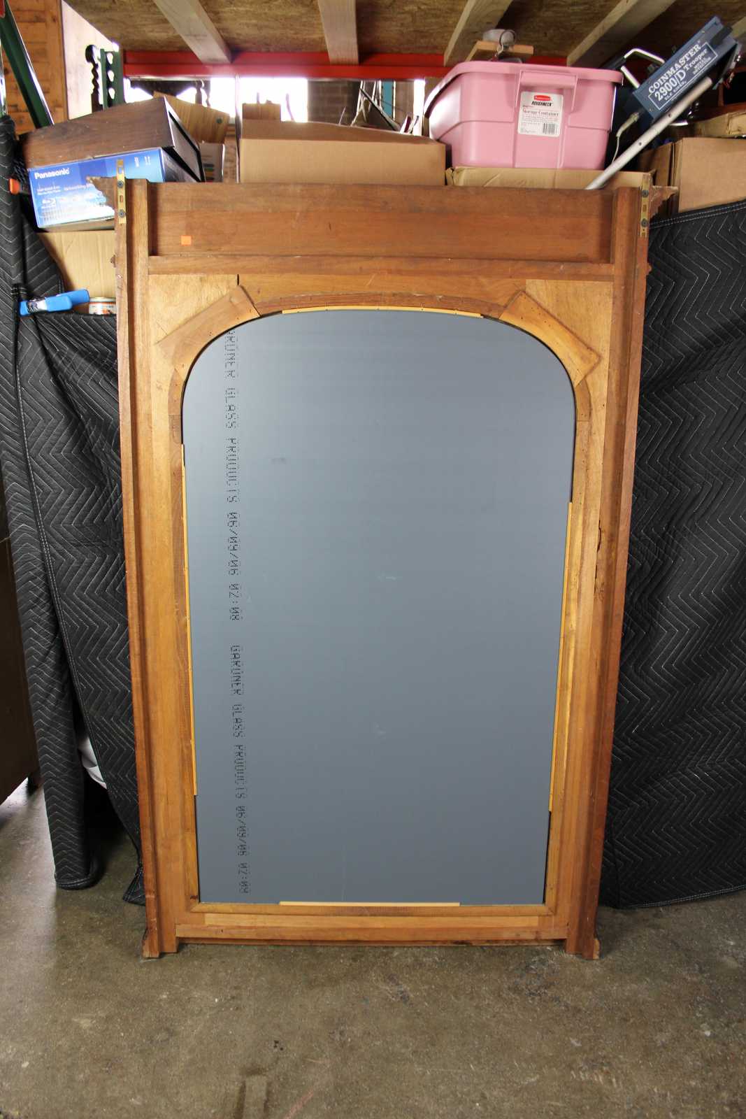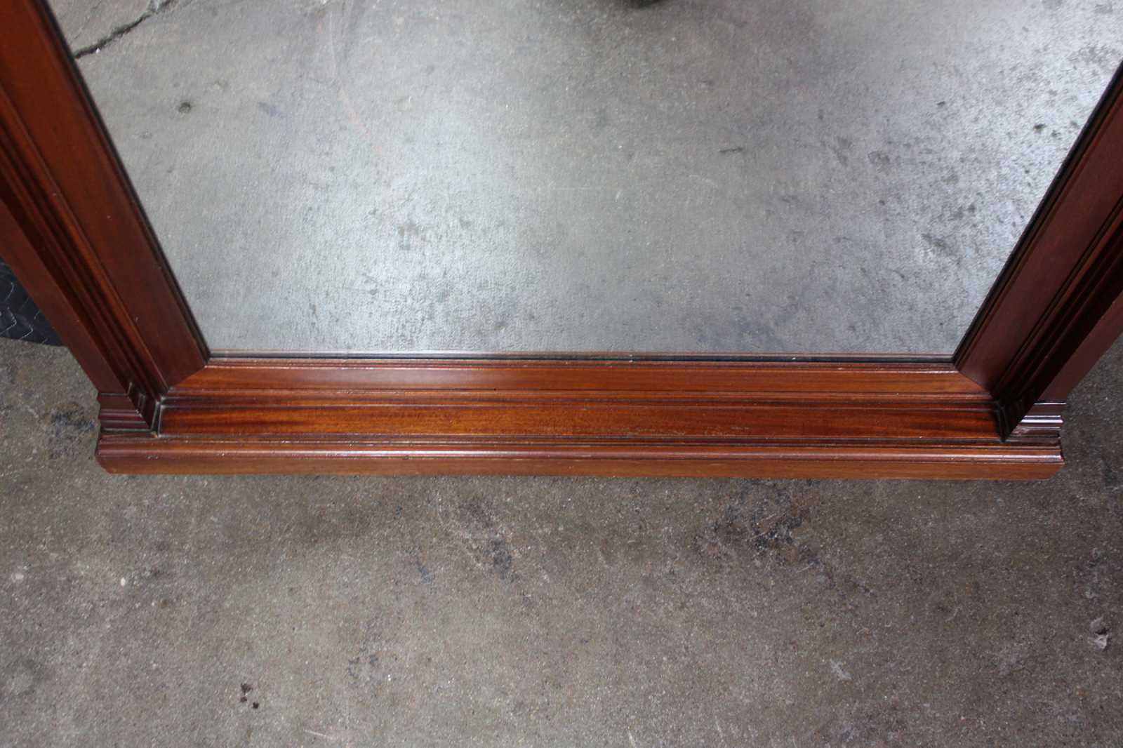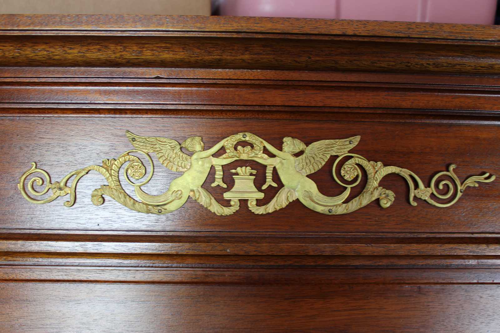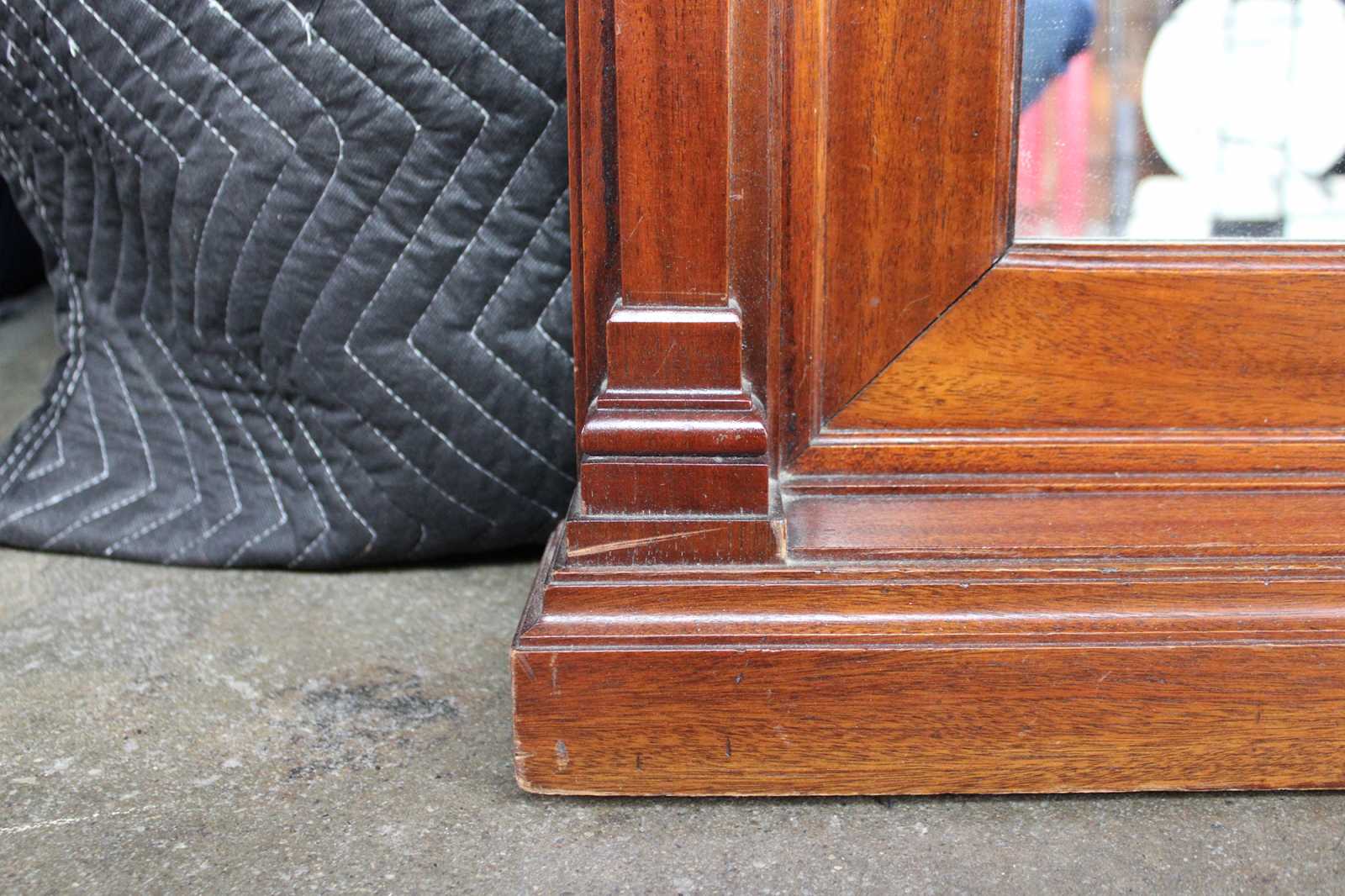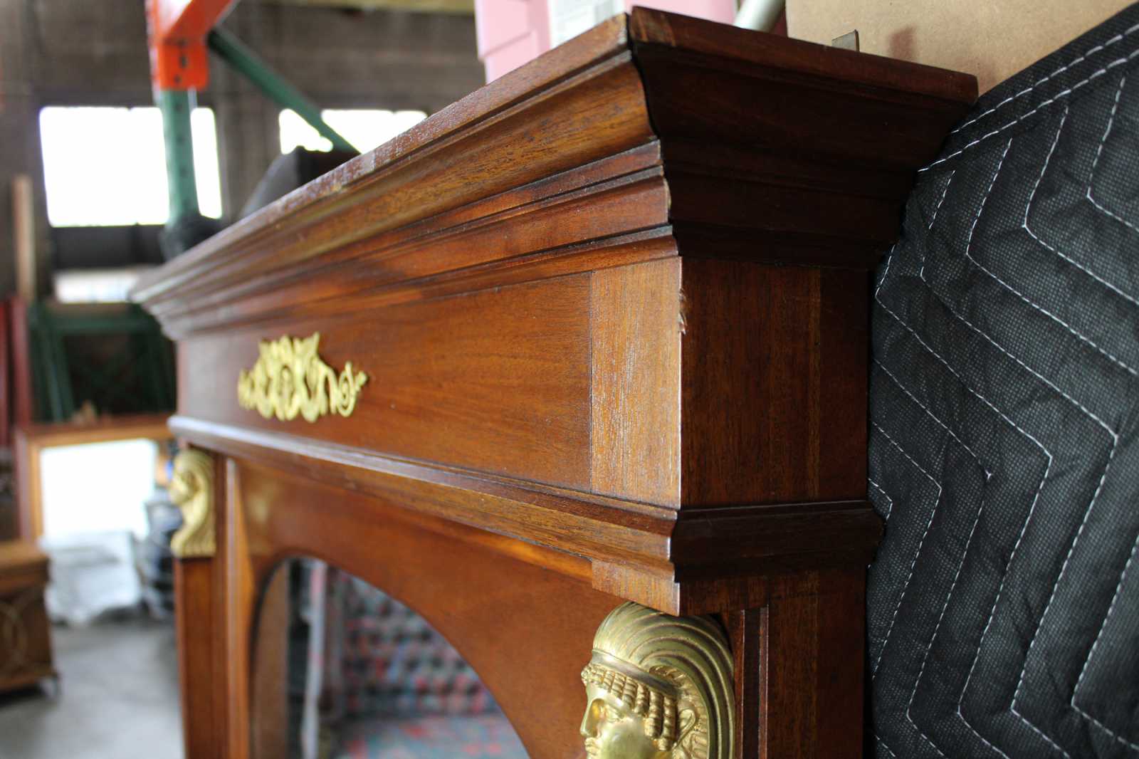 Egyptian Revival mahogany over mantel, wall or floor mirror. Features an arched center between two square tapered columns with bronze caryatid mounts. The mirror is capped with a classical inspired bronze mount showing two winged angels holding a wreath over a bell. A great fit with European, Regency, Empire or Neoclassical decor.