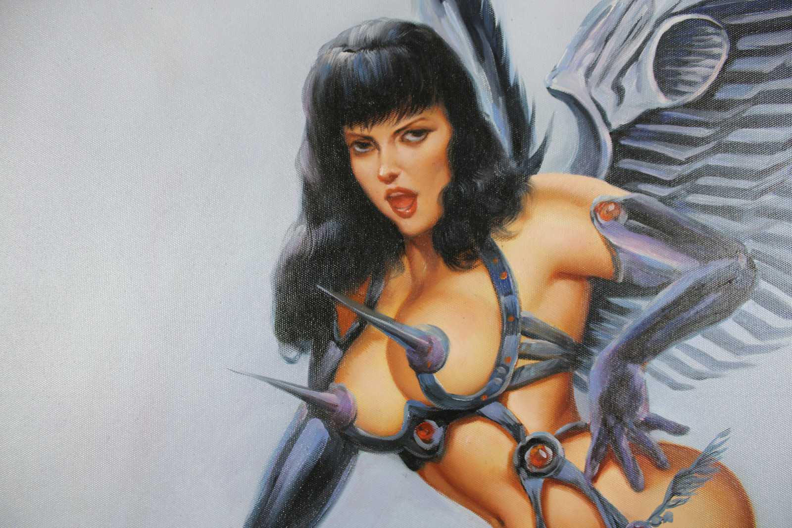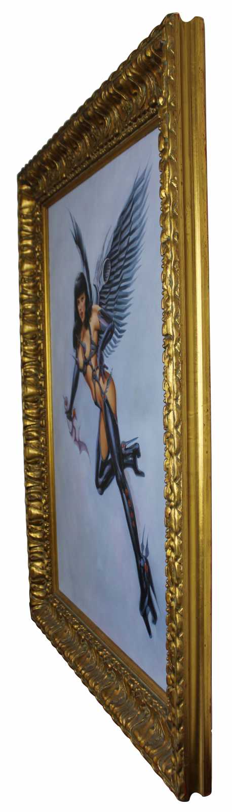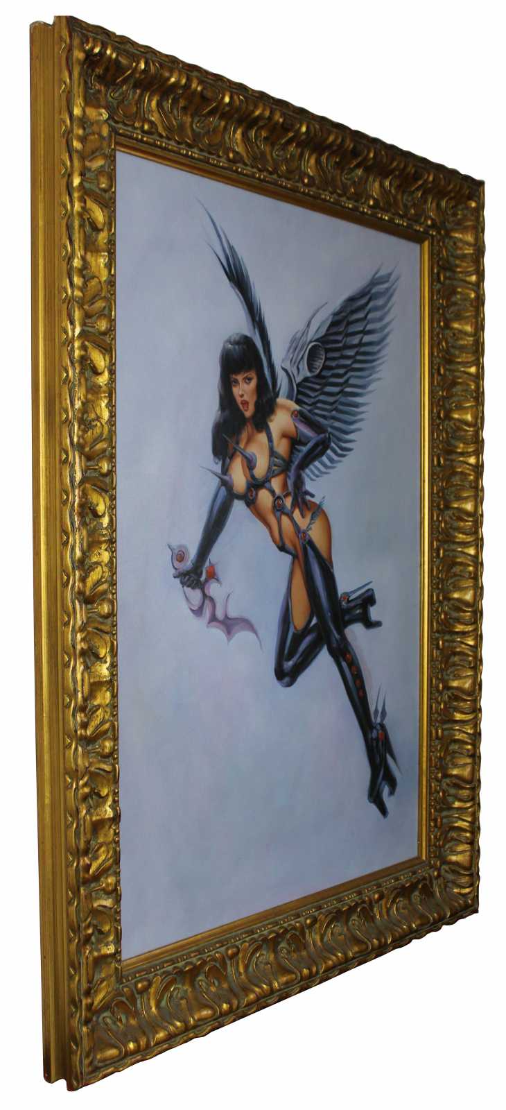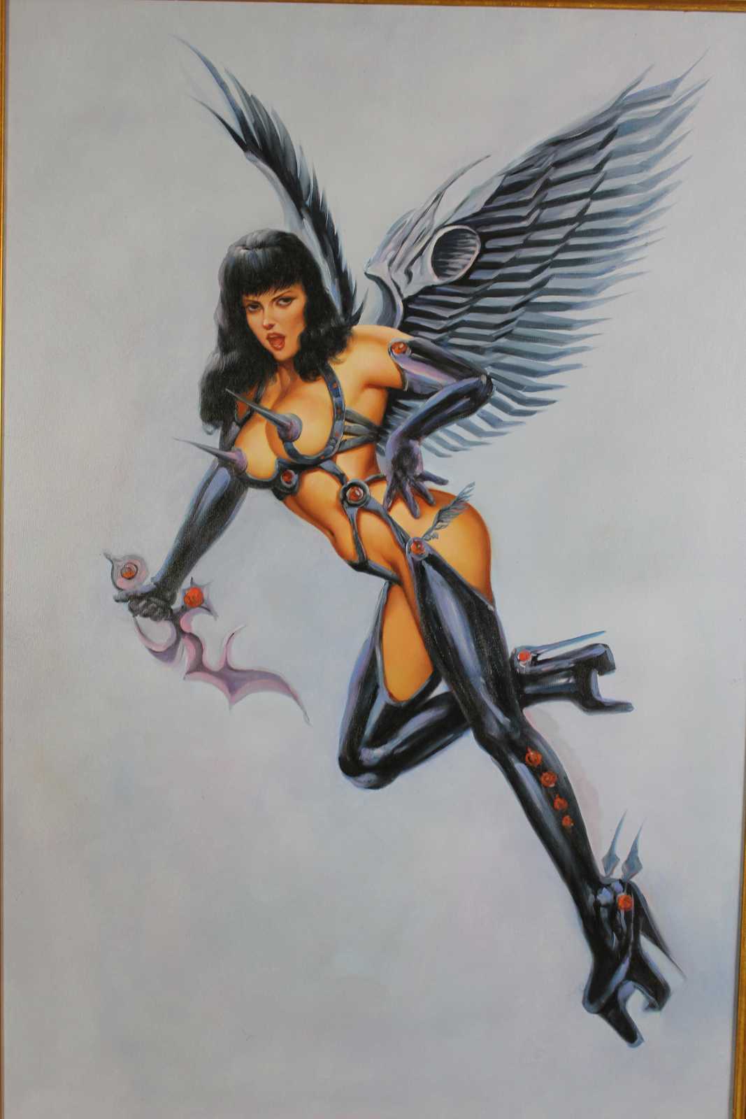 20th century erotic angel original oil painting. Features a woman scantily clad in latex armour holding a dagger. Unsigned. Framed in ornate gold.