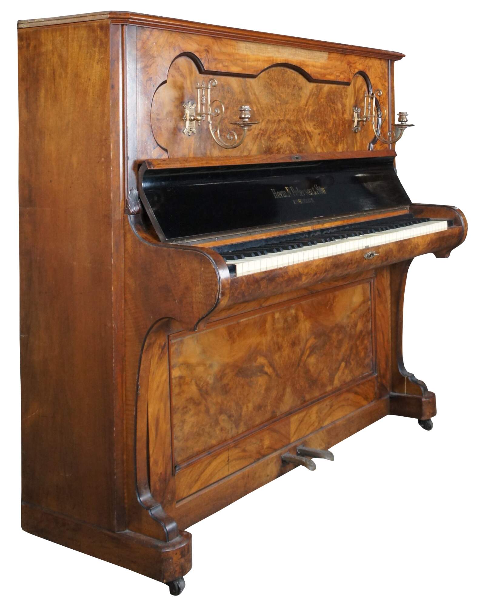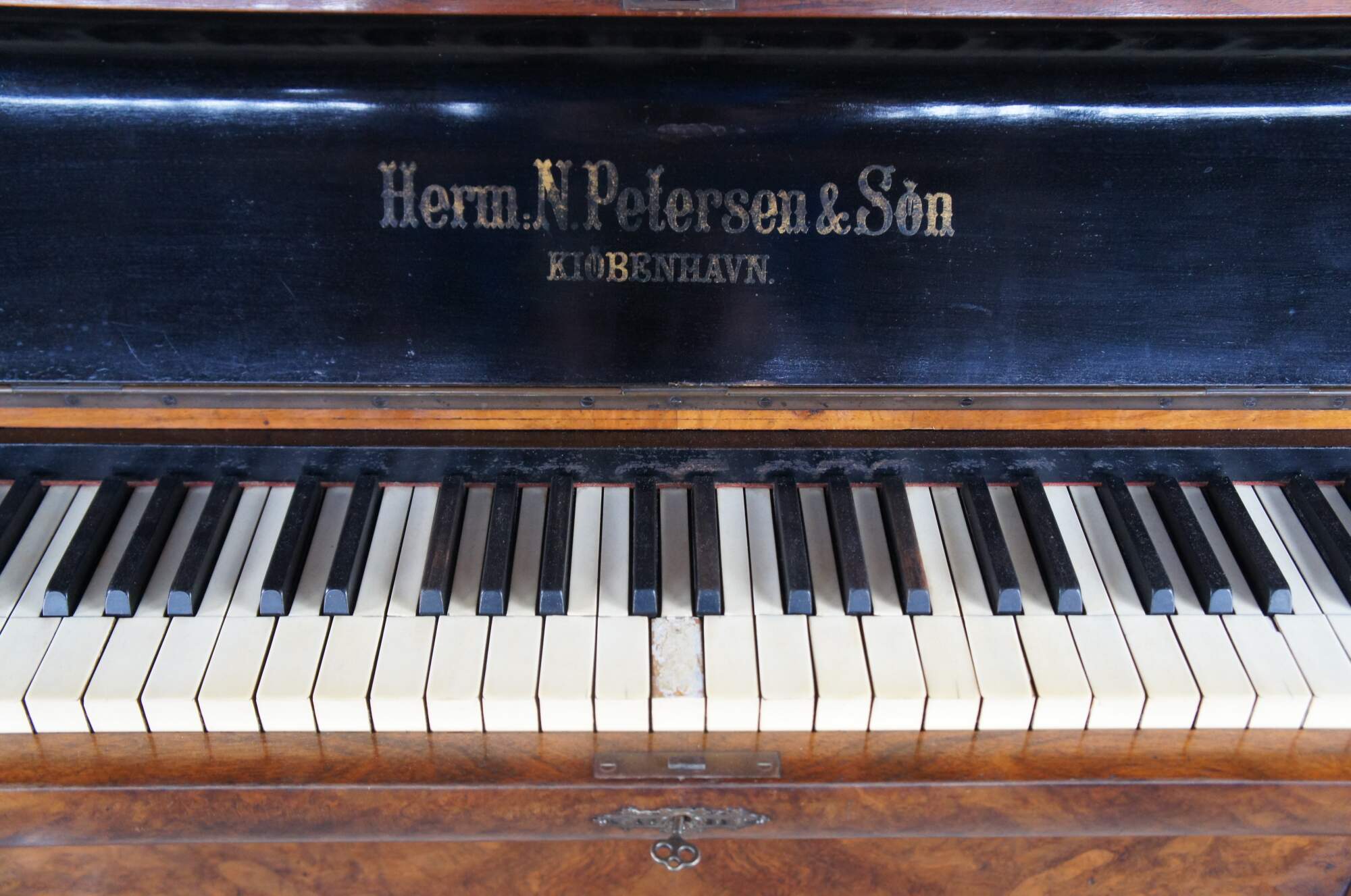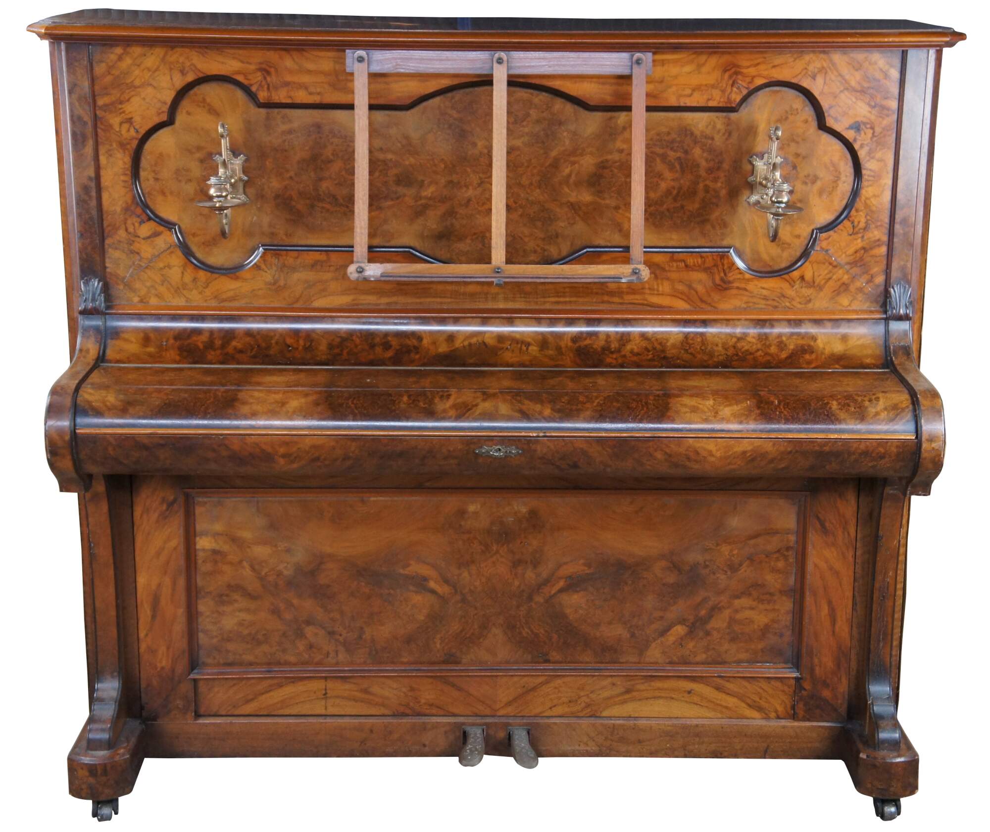 Herm N. Petersen & Son Kobenhavn (Copenhagen Denmark) upright burl piano, circa mid 19th century. Made from Walnut burl with brass candle sconces, and sheet music holder.