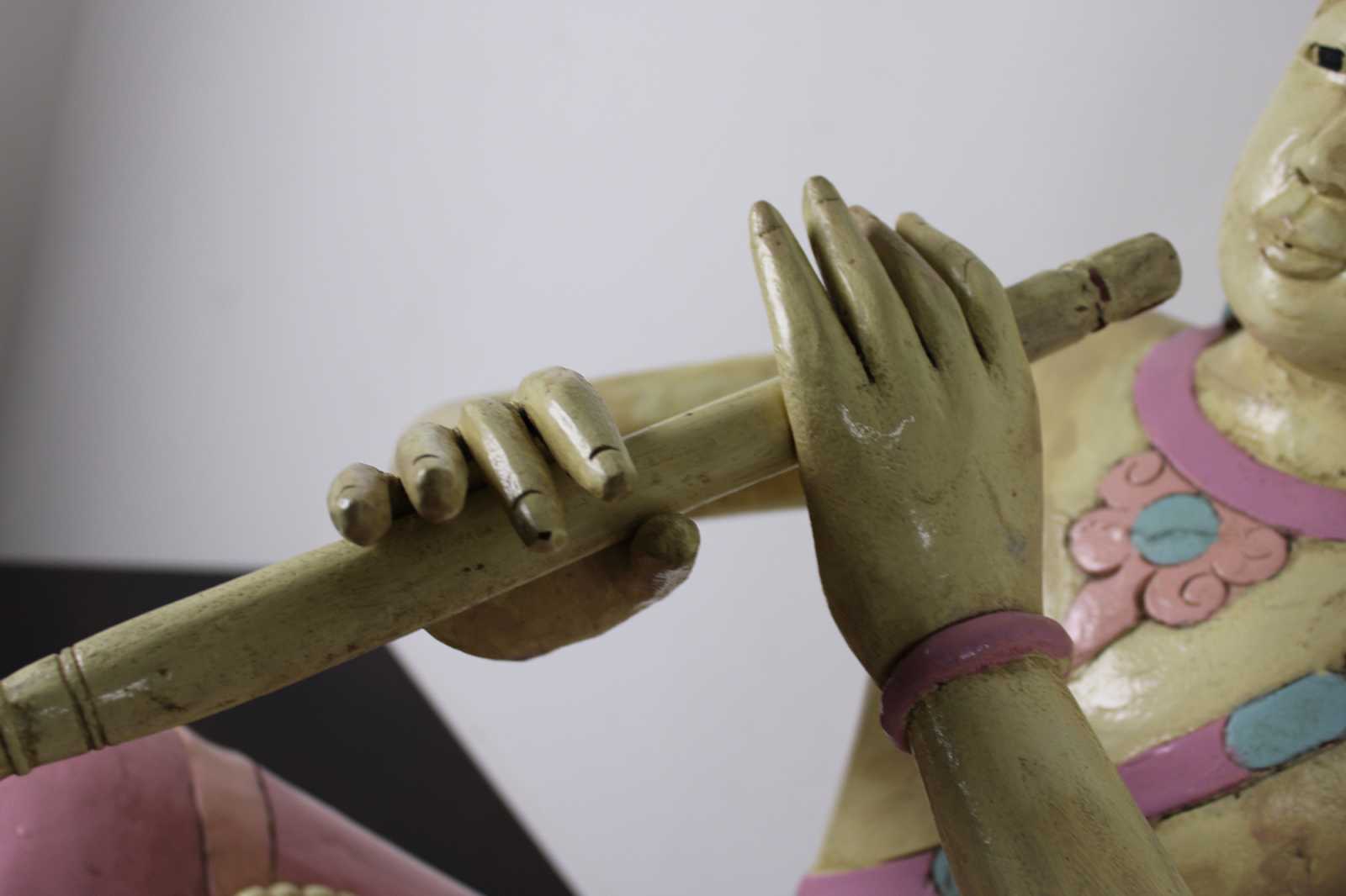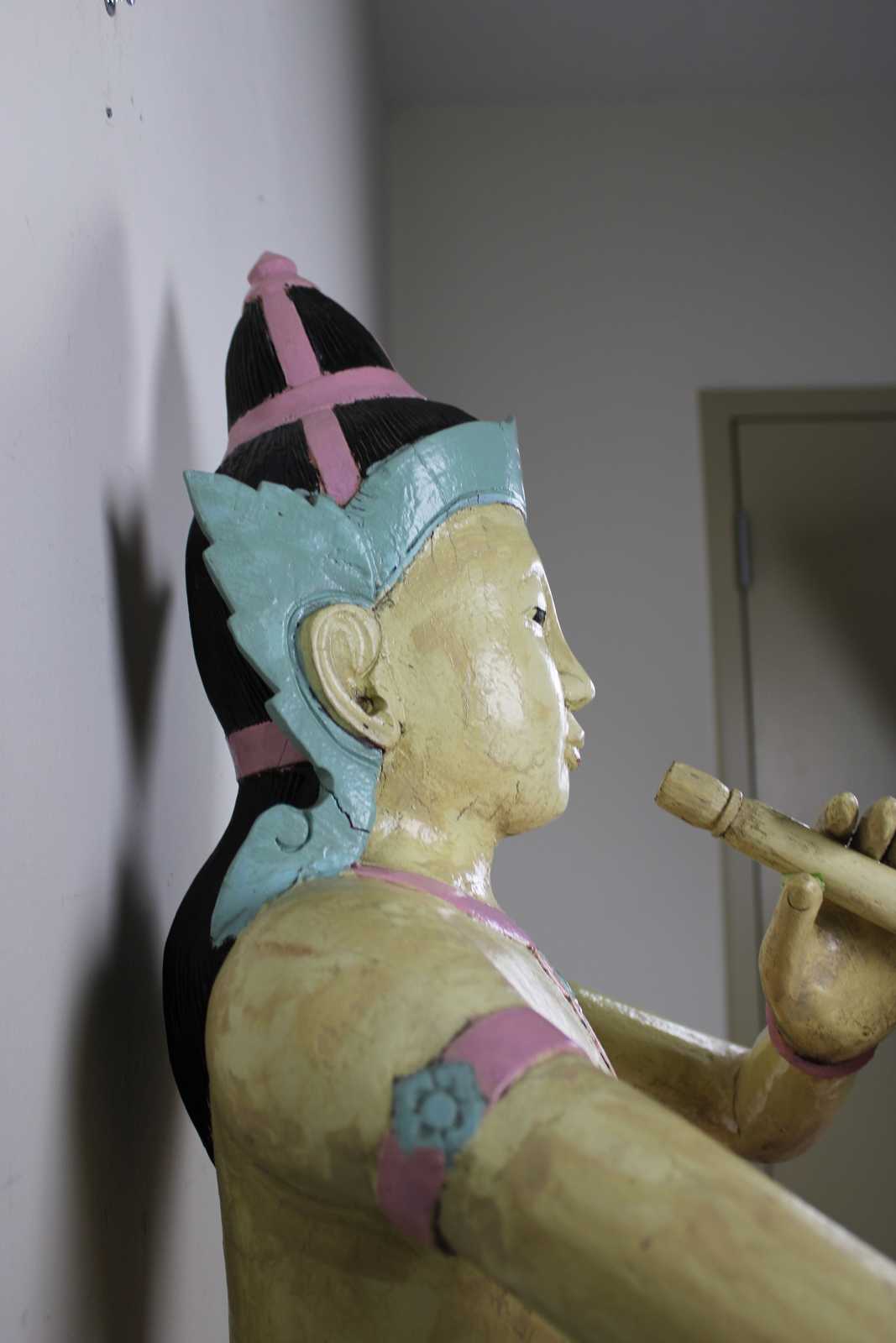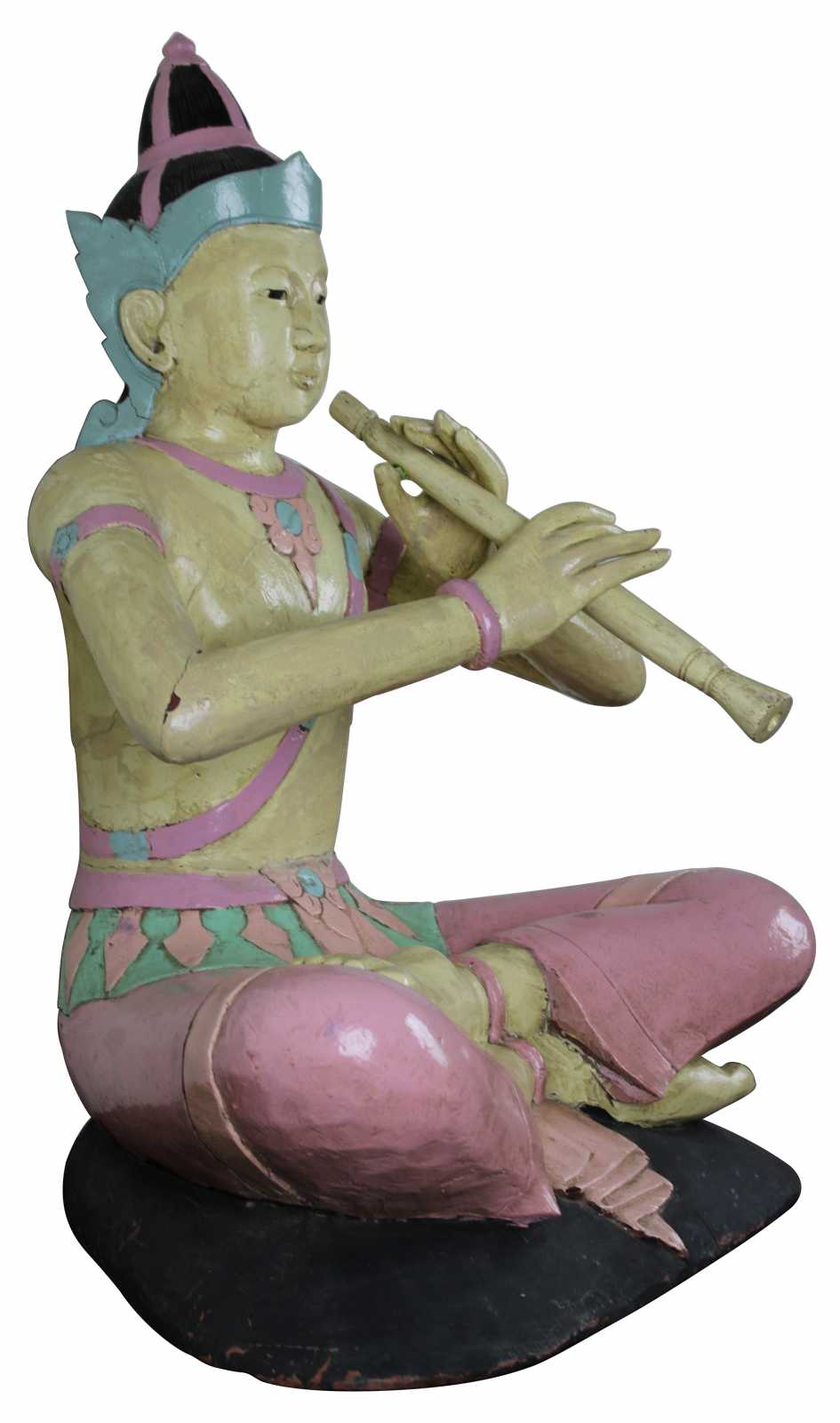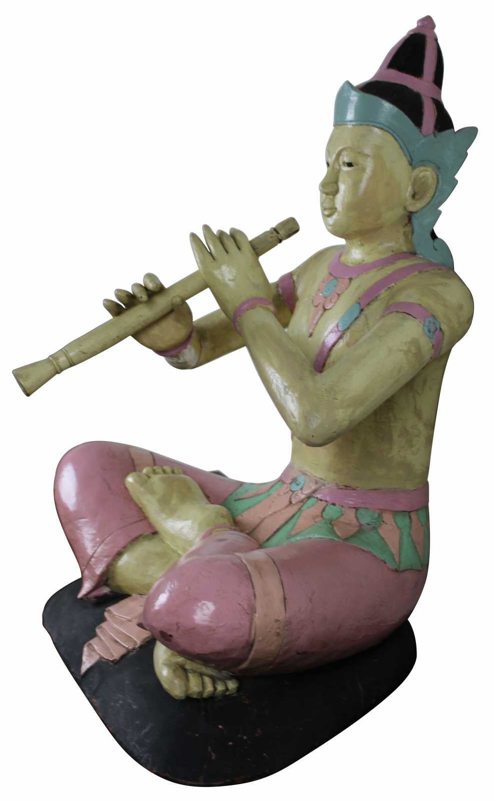 A large wooden sculpture of the famous Prince Phra Aphai Mani playing his magic flute, Thailand.