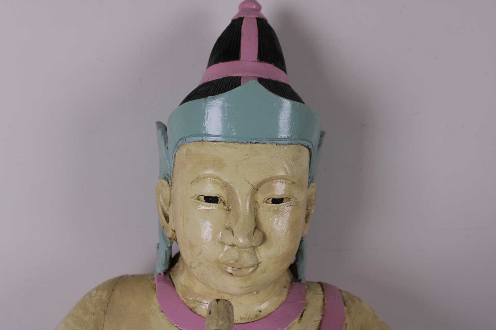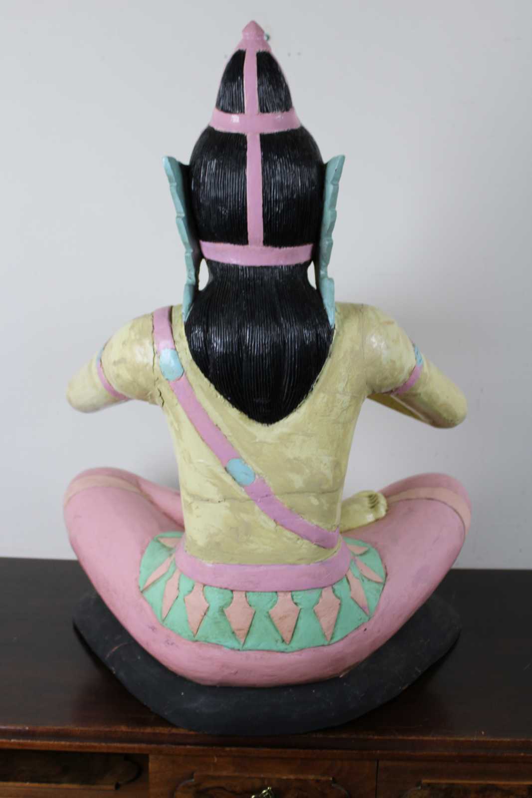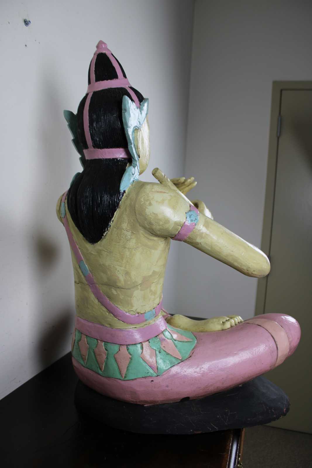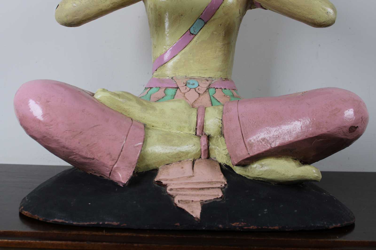 A large wooden sculpture of the famous Prince Phra Aphai Mani playing his magic flute, Thailand.
