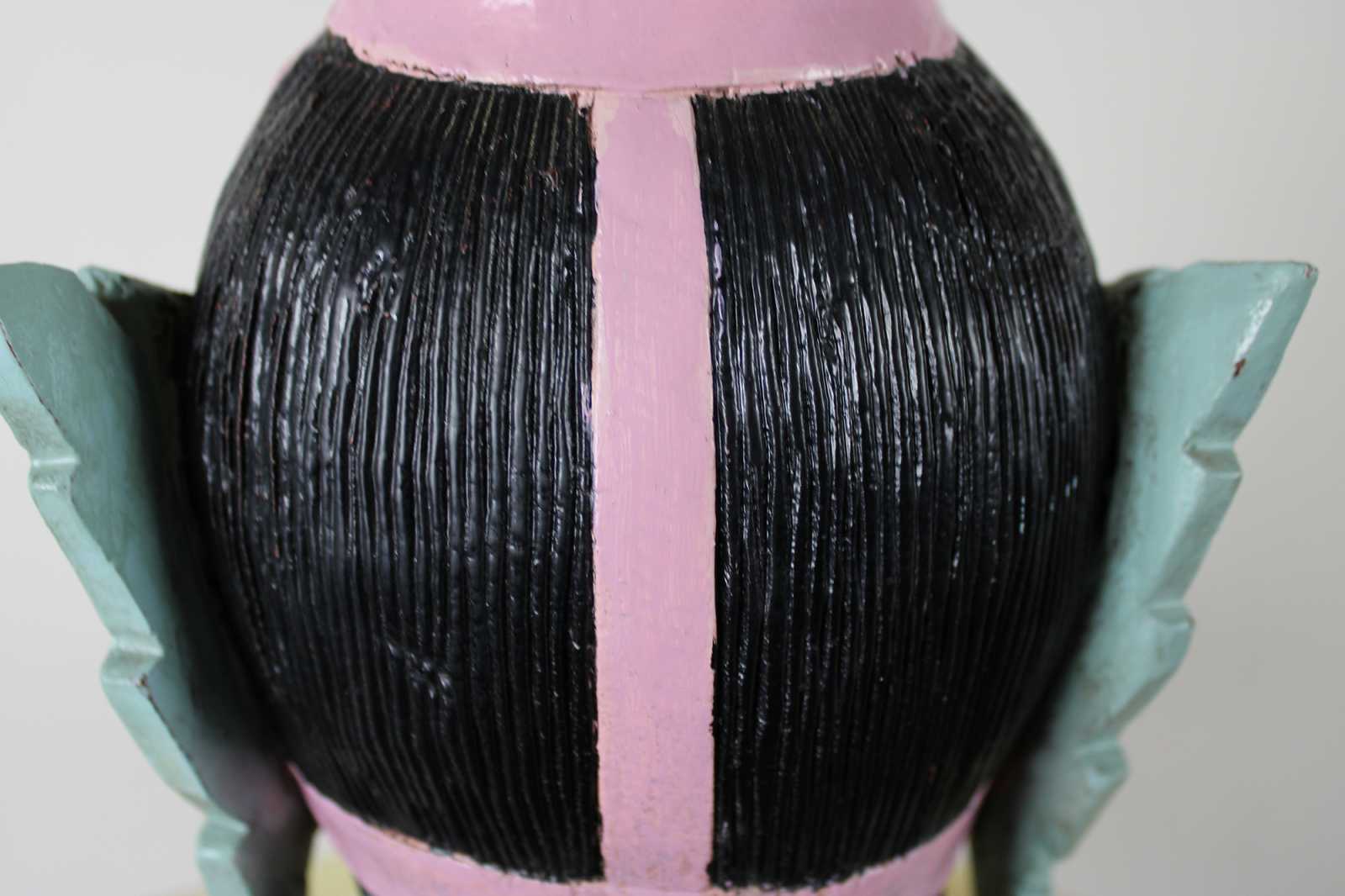 Finely decorated with all kind of ornaments in pink and turquoise lacquer.