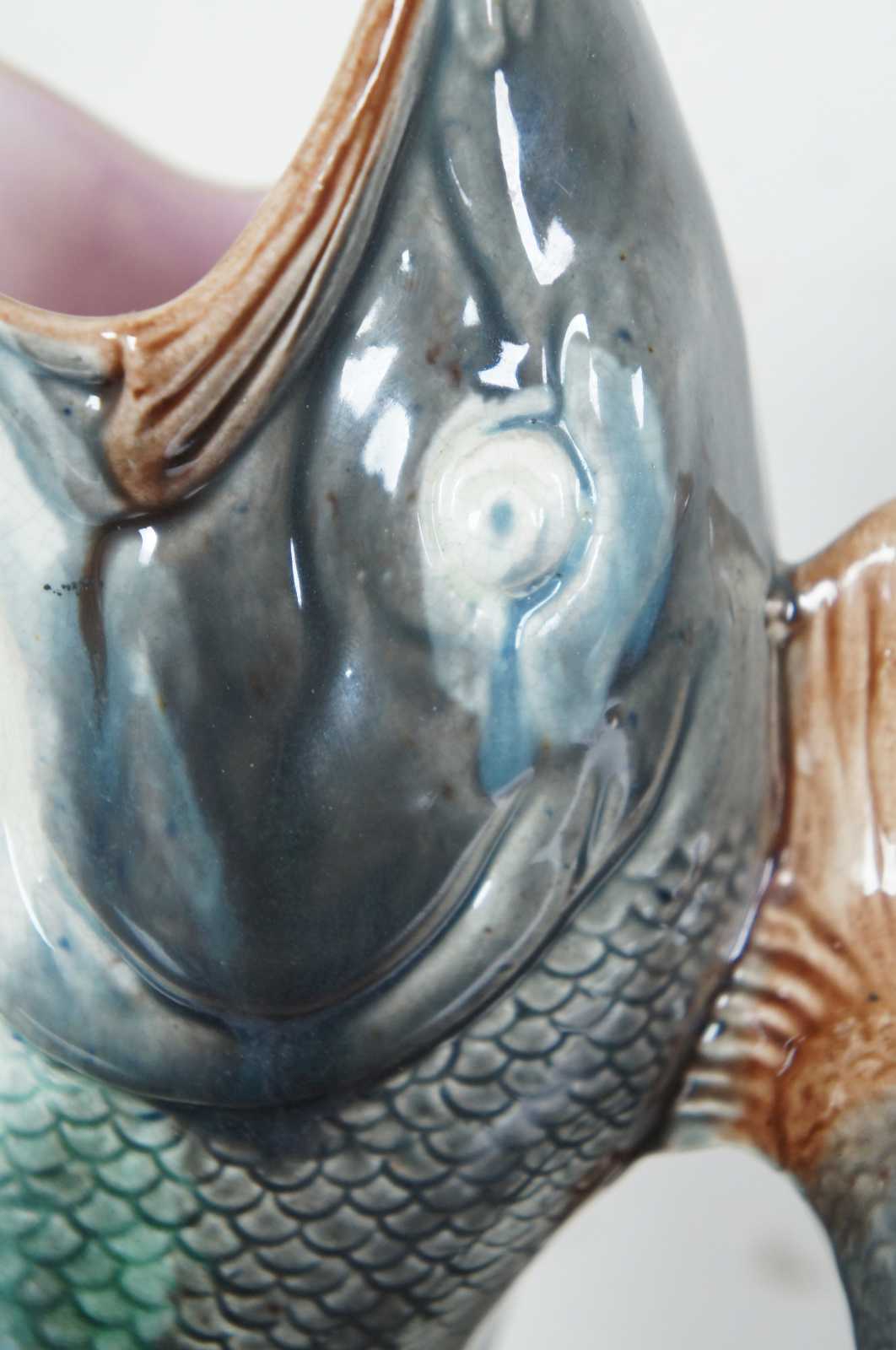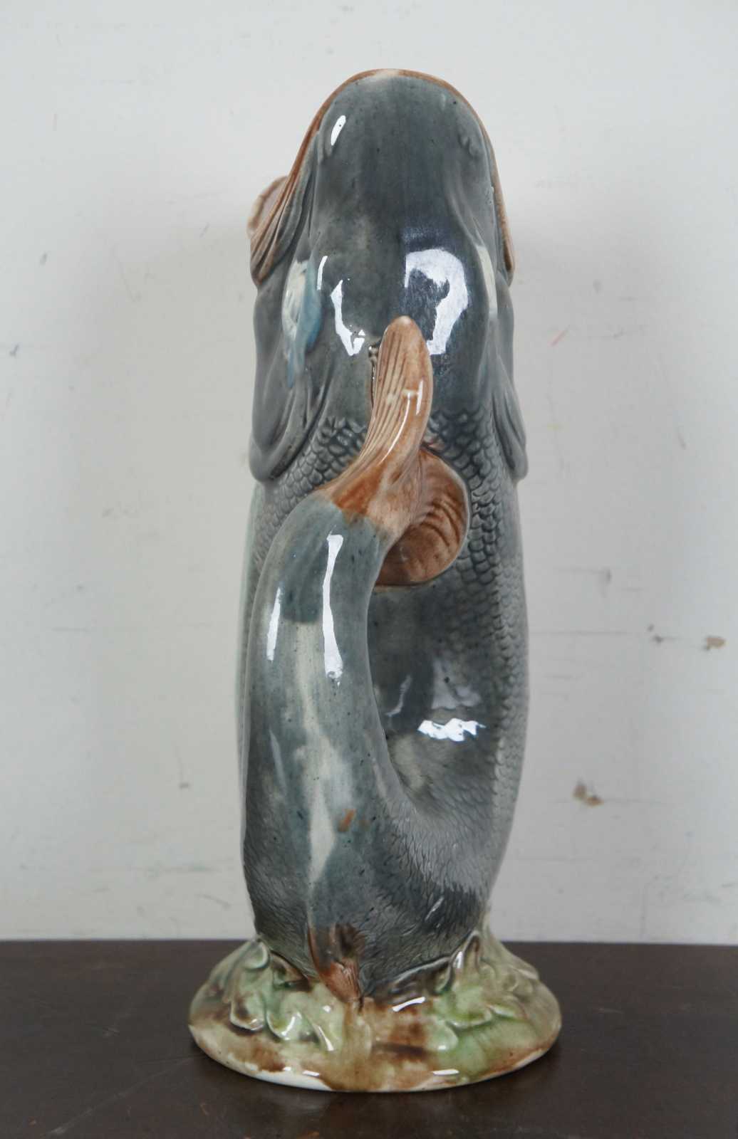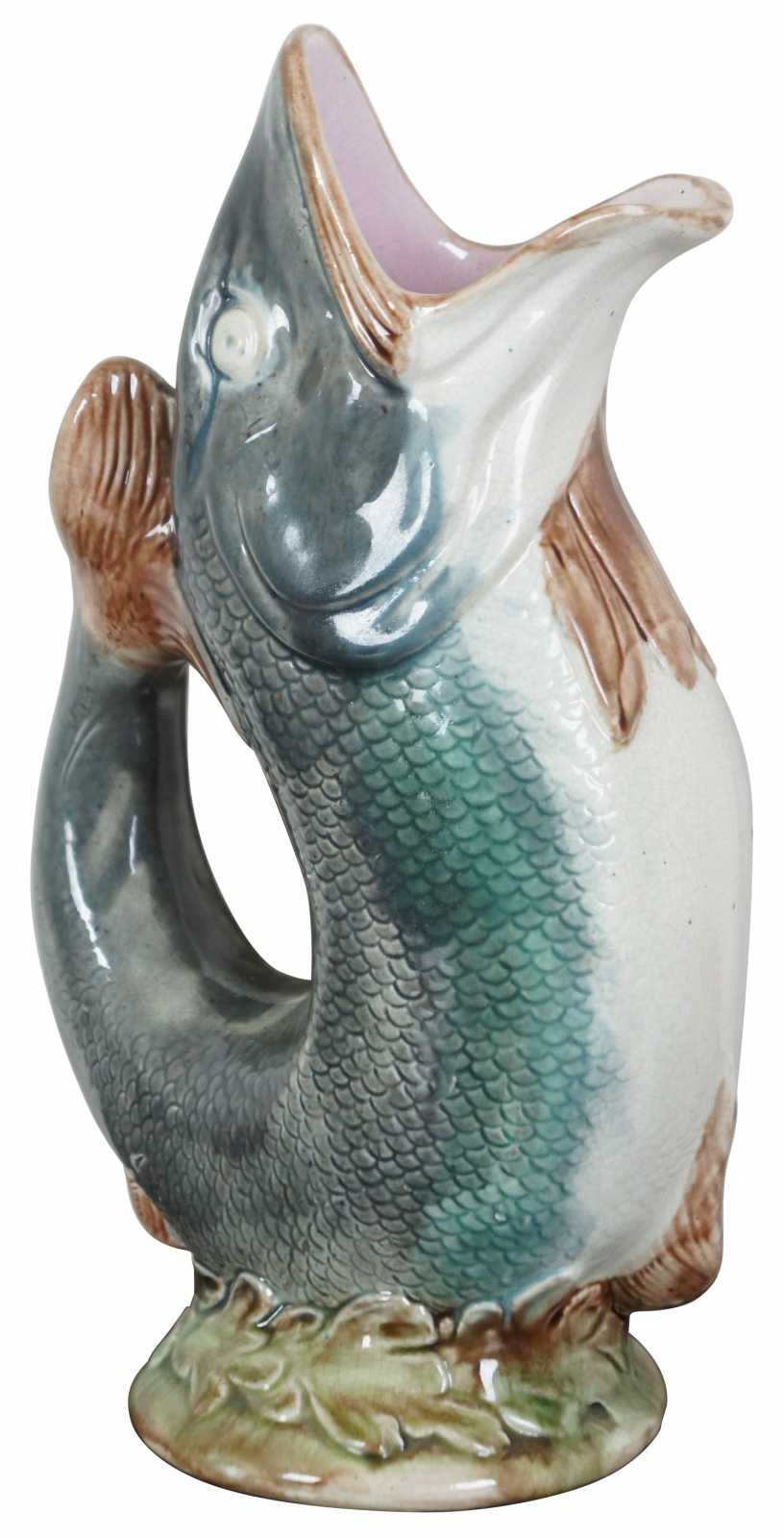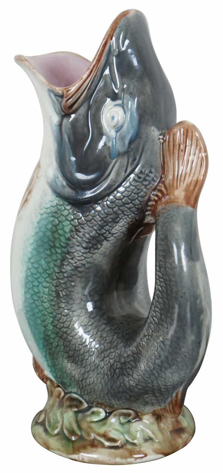 Antique majolica porcelain vase shaped like a gray, green and white fish balanced upright on its tail. Gurgles when you pour.