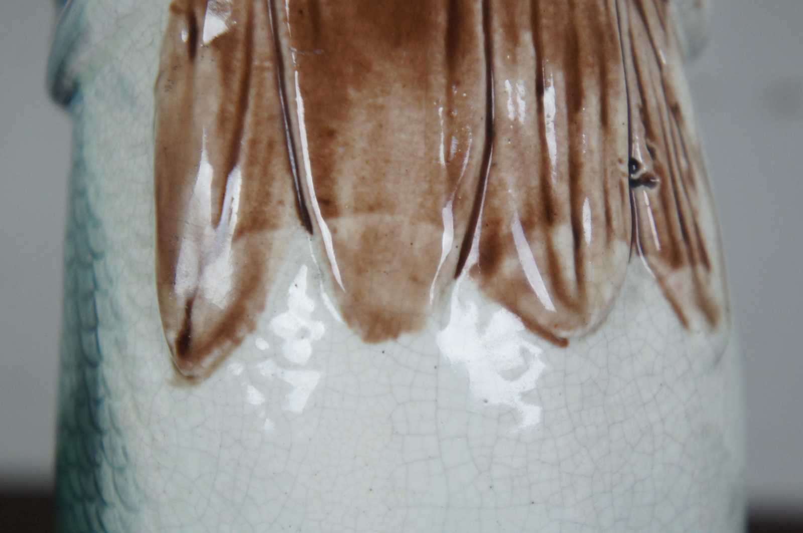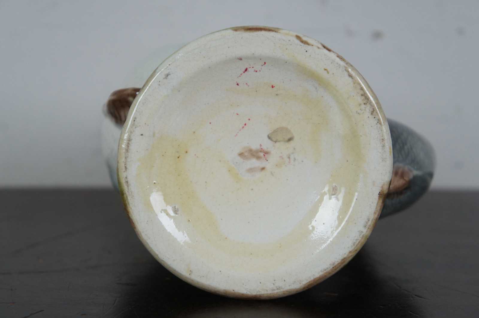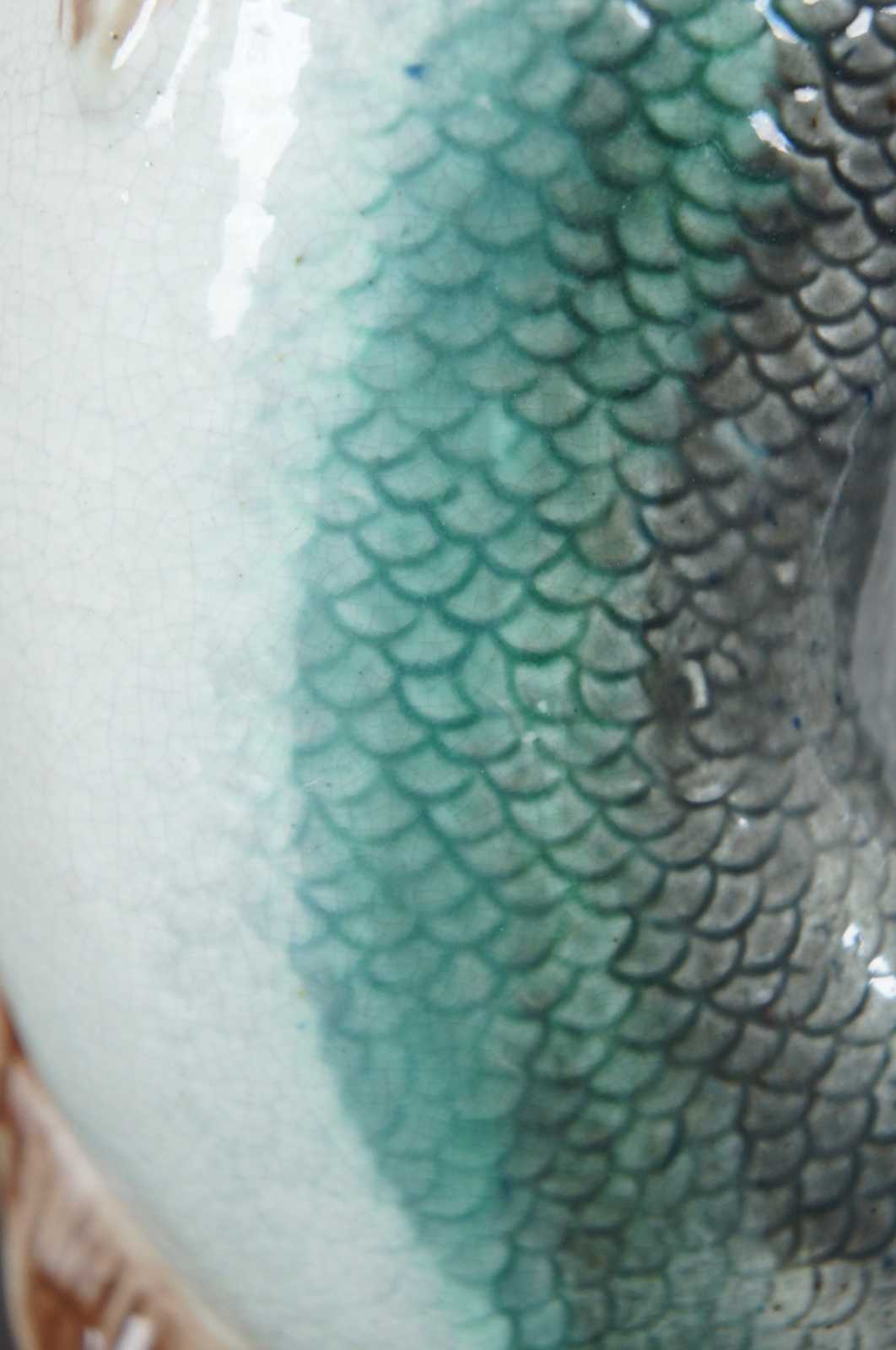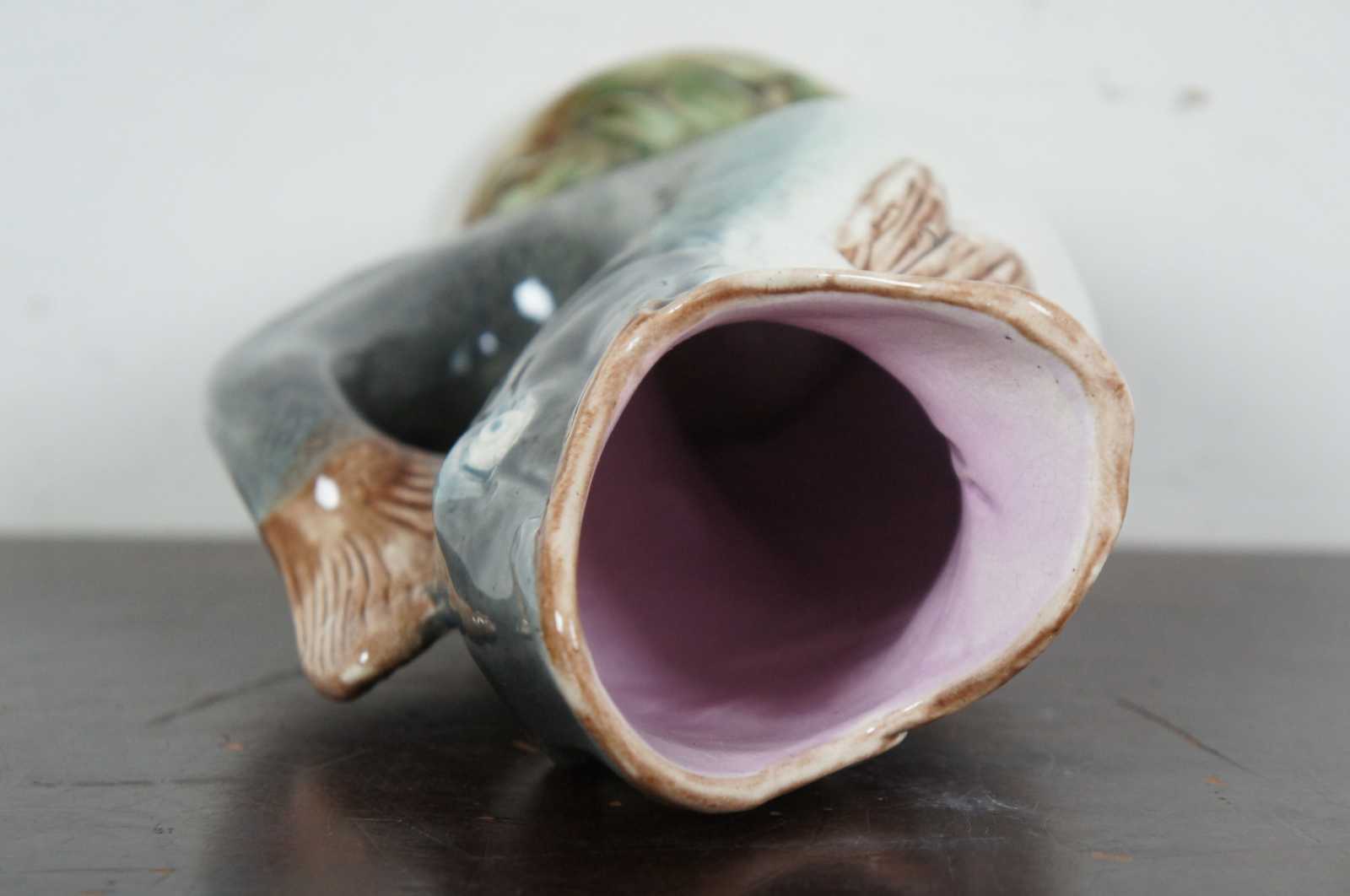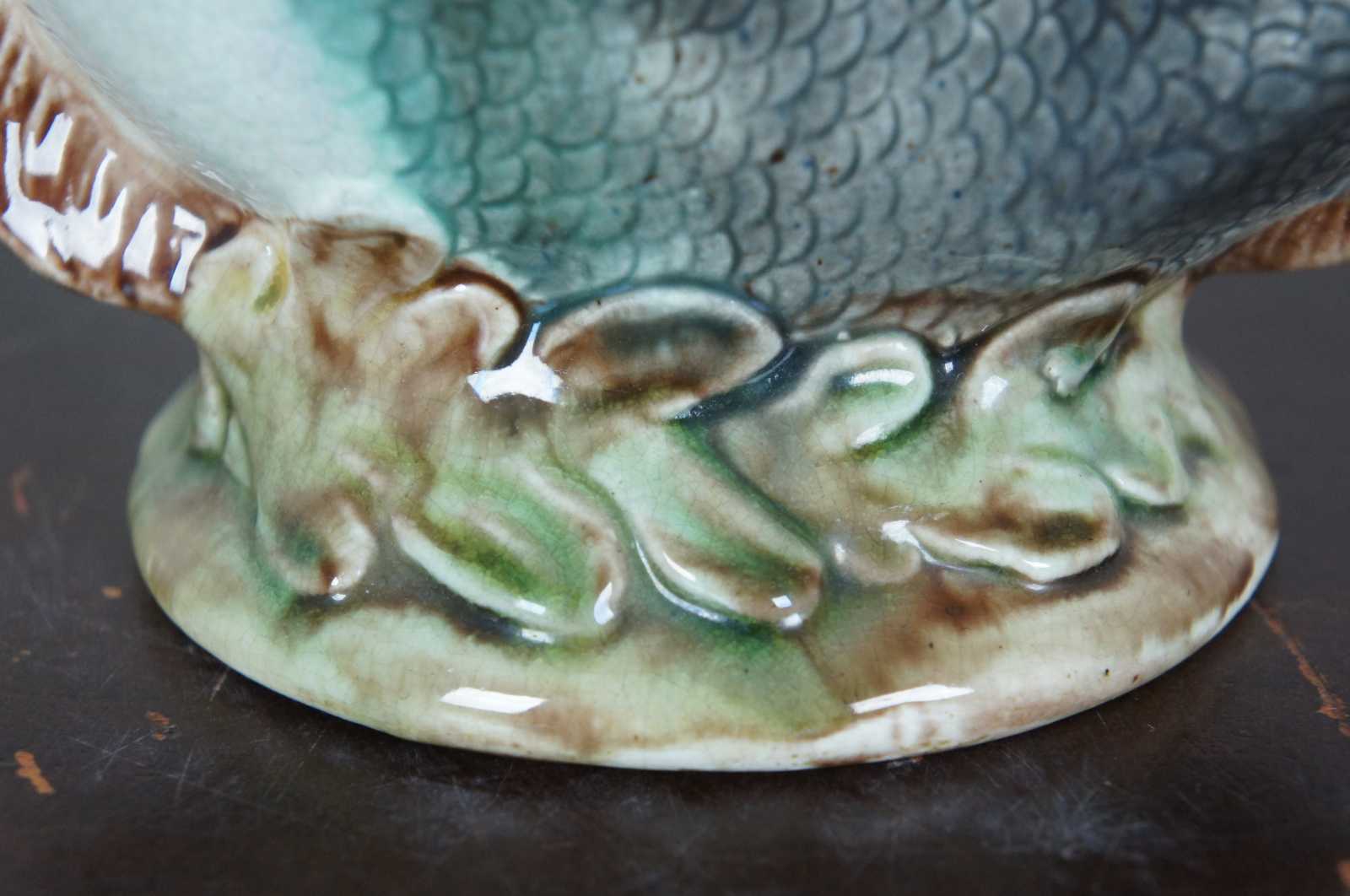 Antique majolica porcelain vase shaped like a gray, green and white fish balanced upright on its tail. Gurgles when you pour.