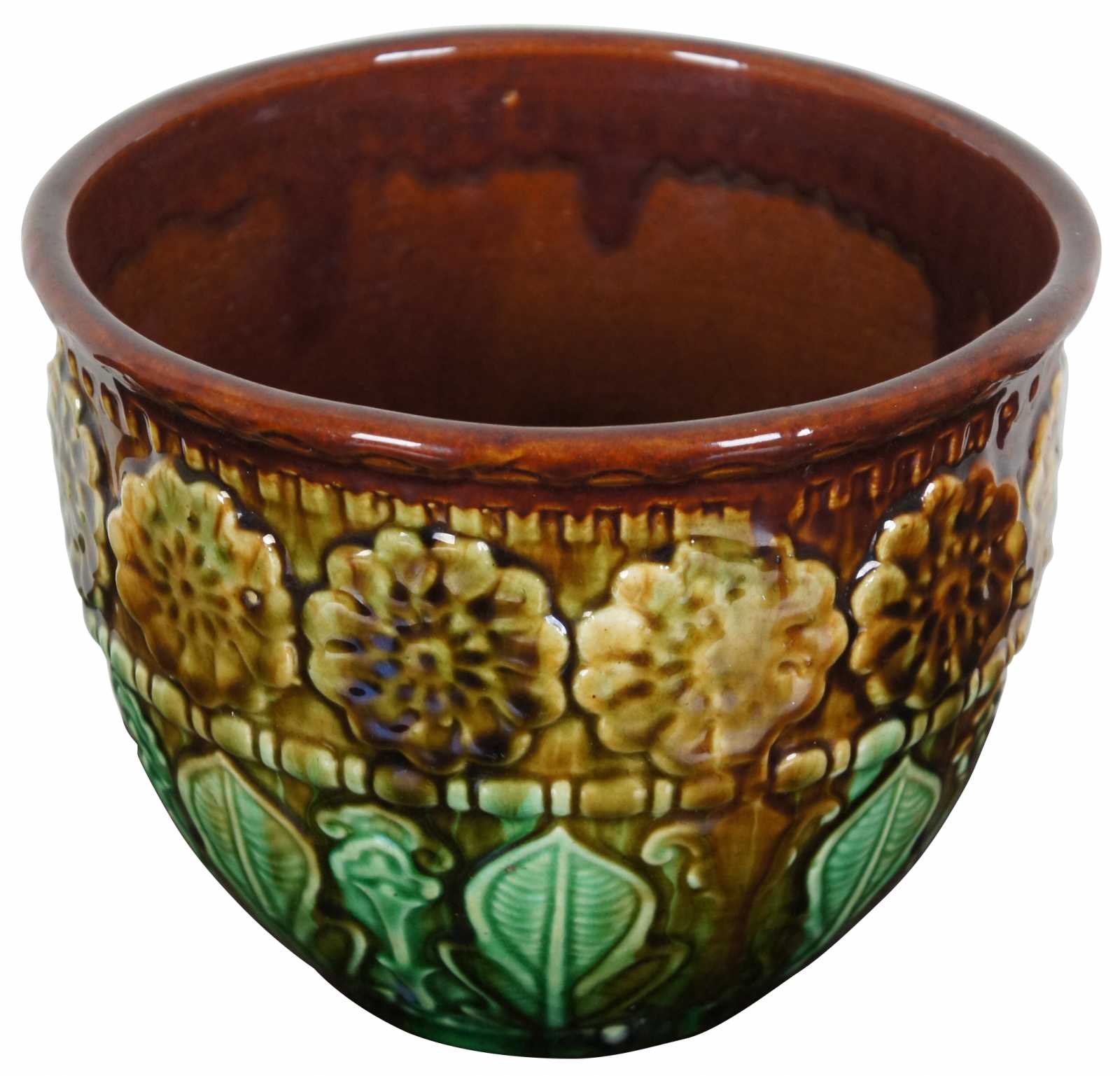 Antique majolica porcelain flower pot, glazed in brown with green and yellow marigolds.