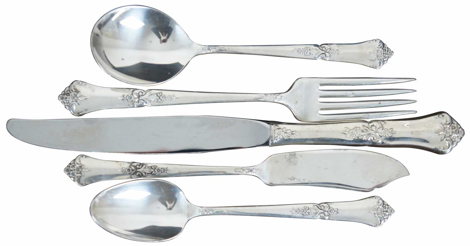 6 Table Knives - 9.25” x 0.75” / 69.25 g / 6 Forks - 7.125” x 1” / 44.79 g / 9 Teaspoons - 6.125” x 1.25” / 30.59 g / 6 Soup Spoons - 6.125” x 1.625” / 35.44 g / Butter Knife - 6.875” x 0.875” / 29.28 g (Length x Width/Weight)