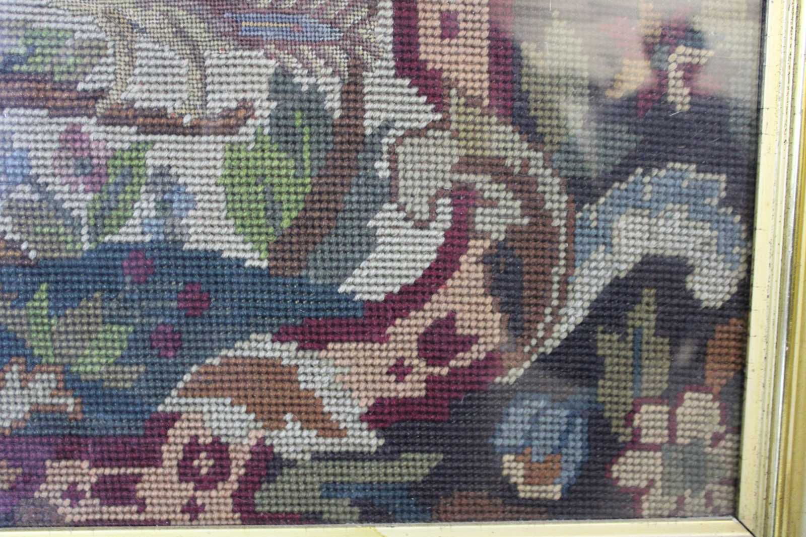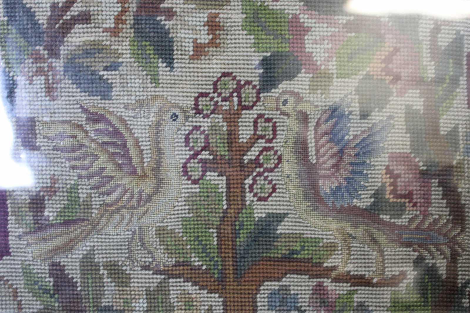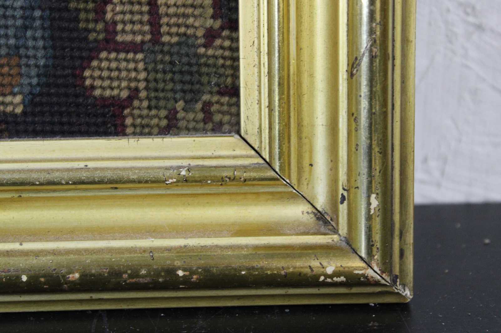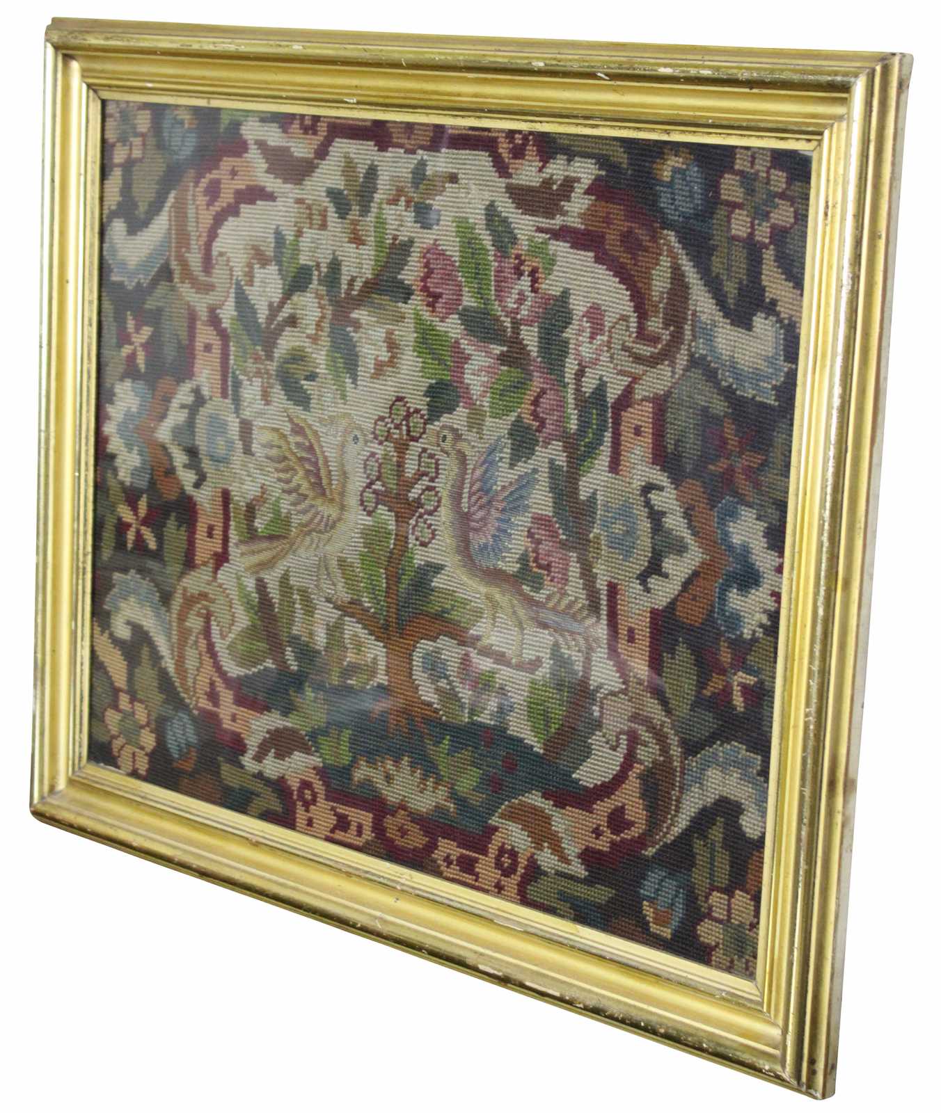 Victorian era framed needlepoint tapestry. Features a landscape with two doves at the center amongst an array of flowres.