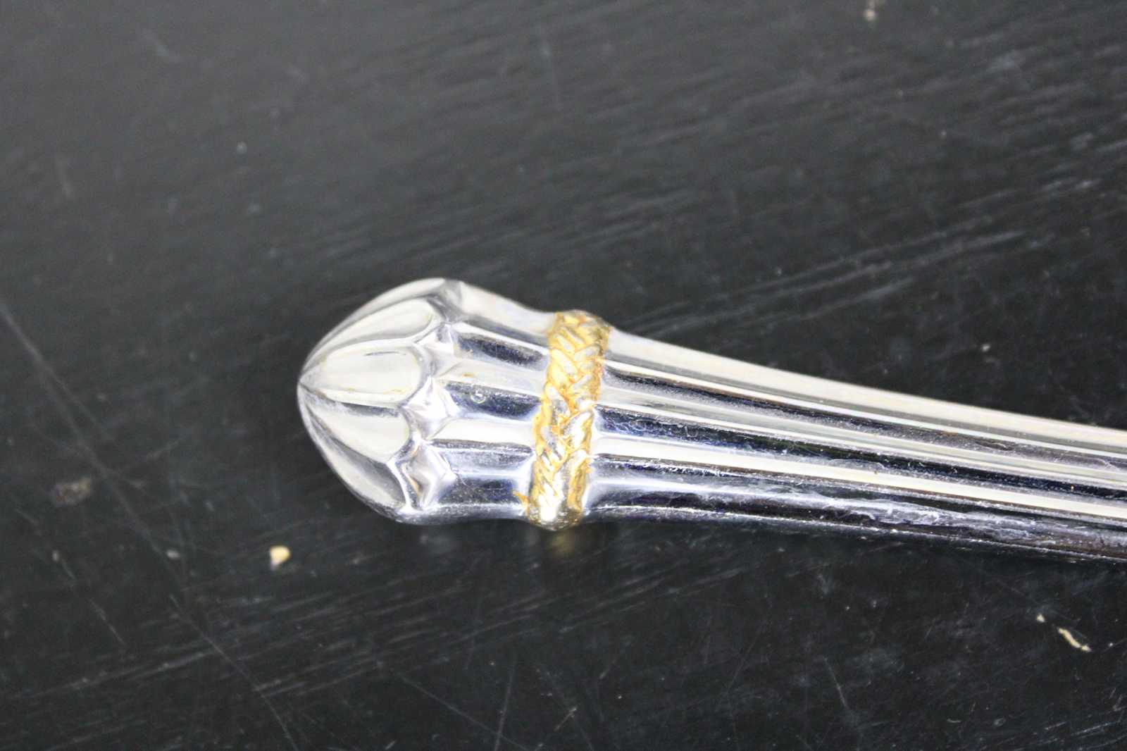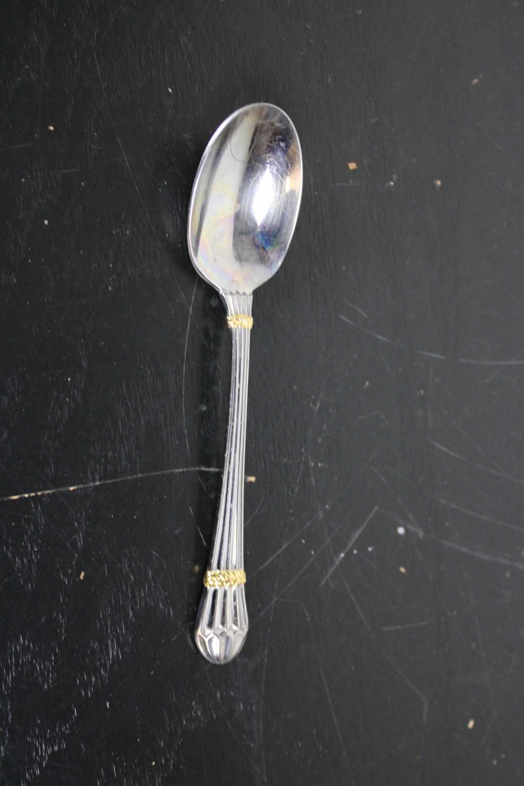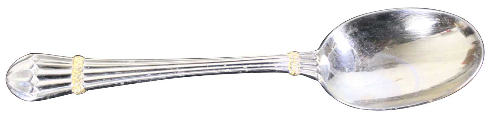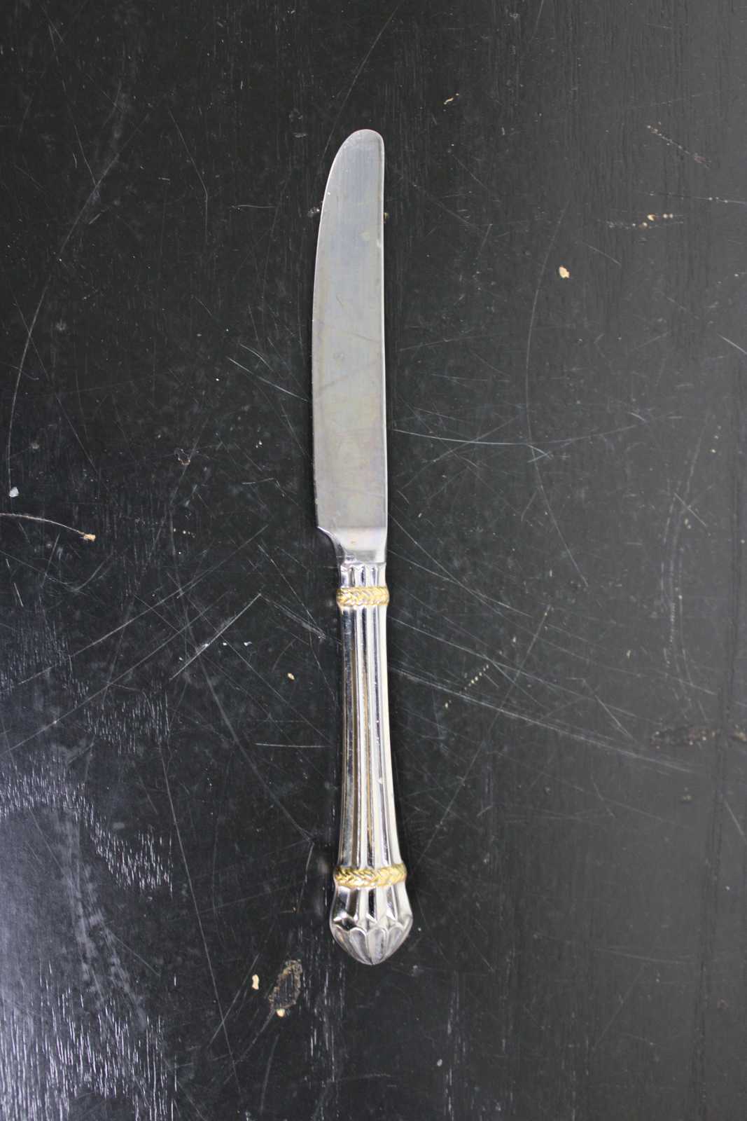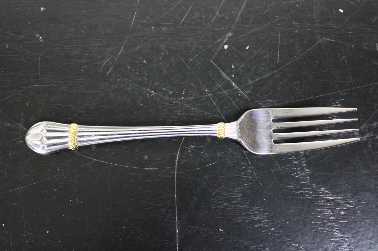 55 Pieces (11, 5-piece Settings) of Carouselle Gold stainless flatware by Yamazaki Corporation. Features a modern French fluted design with braided gold bands. Patrick Japan