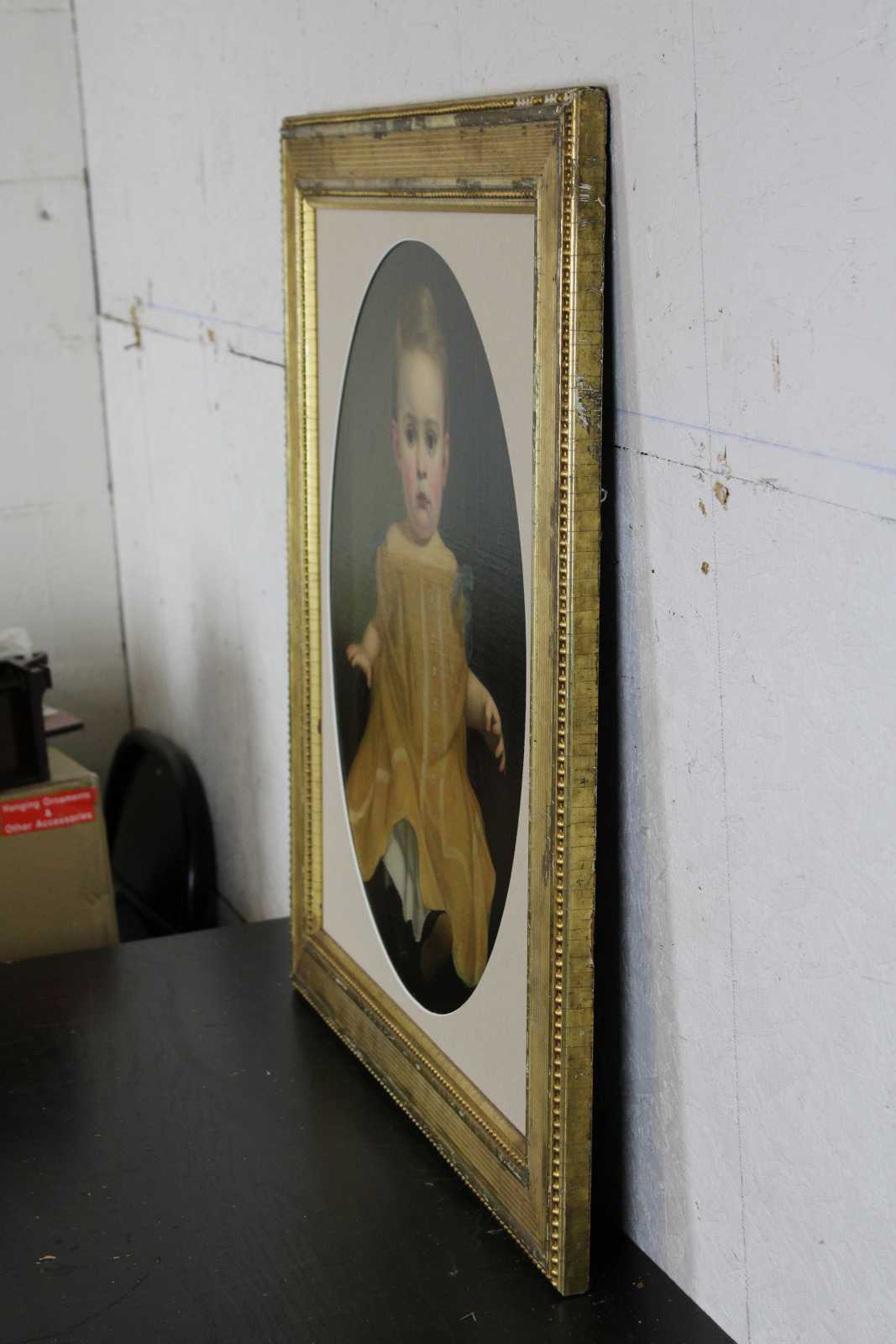 Vintage oil painting featuring a young child / girl / baby in a formal yellow dress. Framed with oval mat in gold beaded frame.