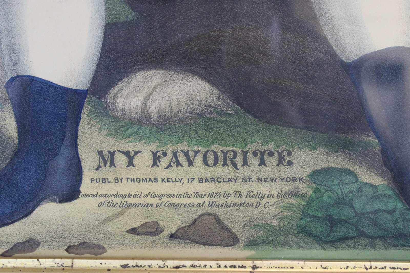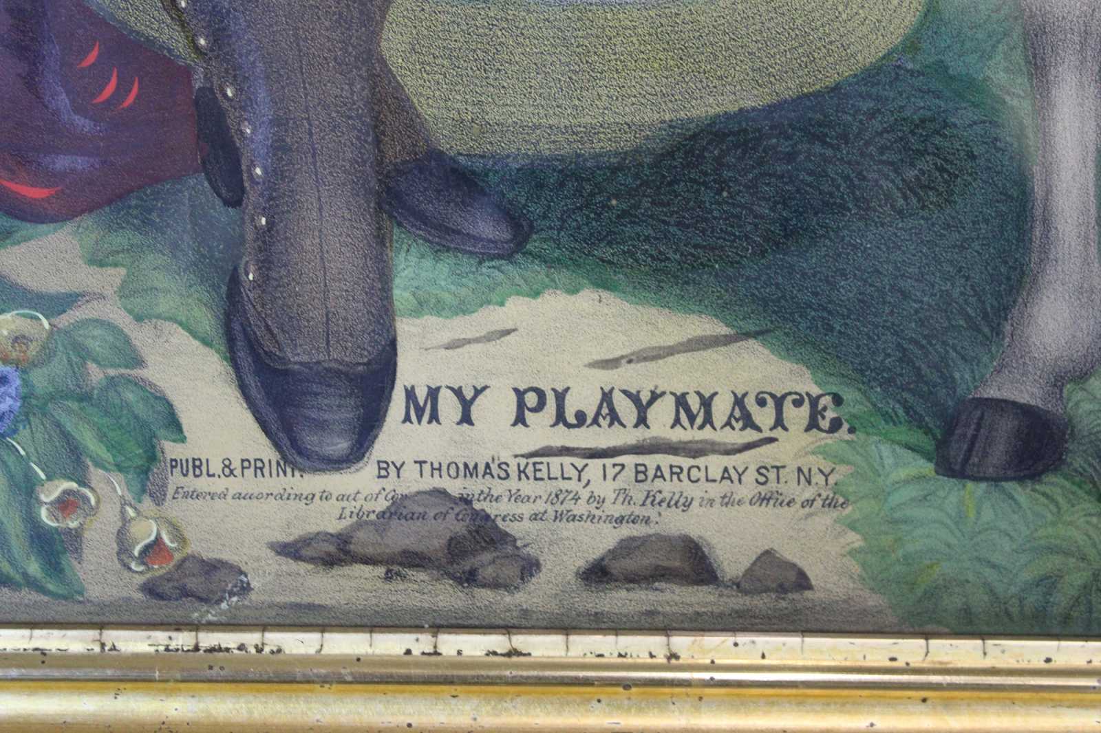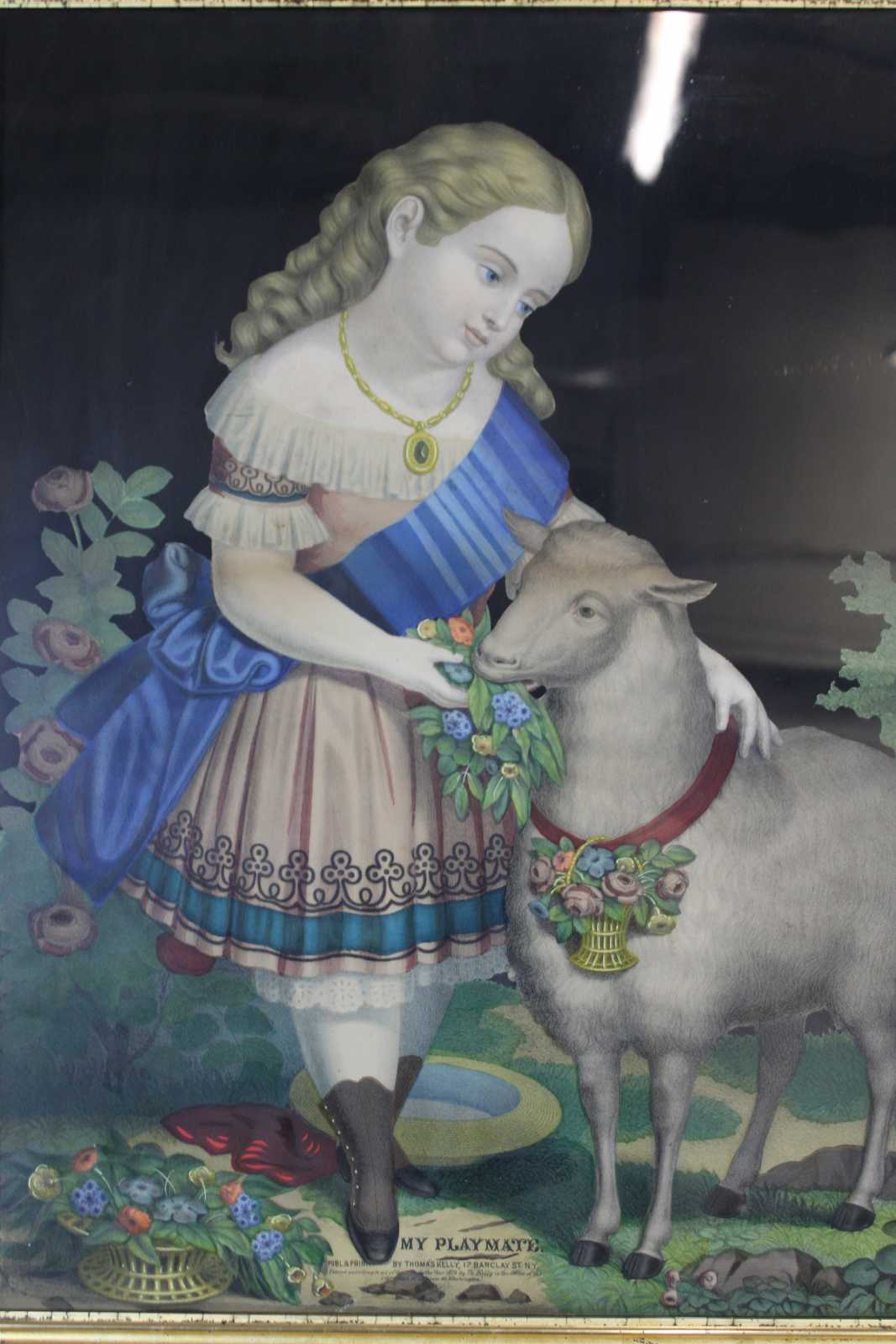 Pair of Antique 1874 Thomas Kelly "My Favorite" and "My Playmate" colored Chromolithographs (lithograph) prints. Features two children, a boy and girl with their pets, a dog (St. Bernard ? / Shepherd ? Karakachan ?) and a Sheep. Both children are dressed in formal attire. Framed in antique gold gilt and mahogany with antique glass.