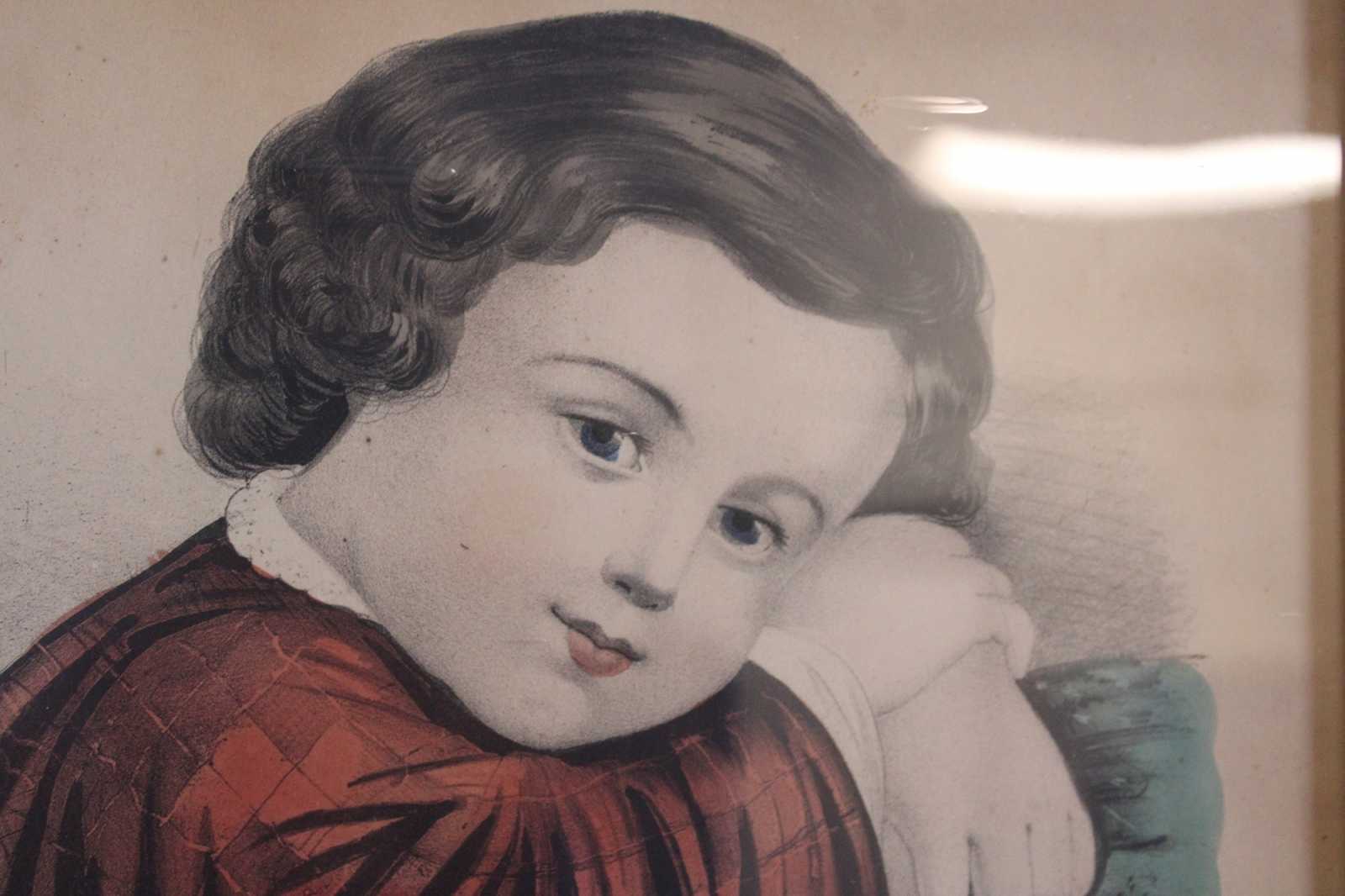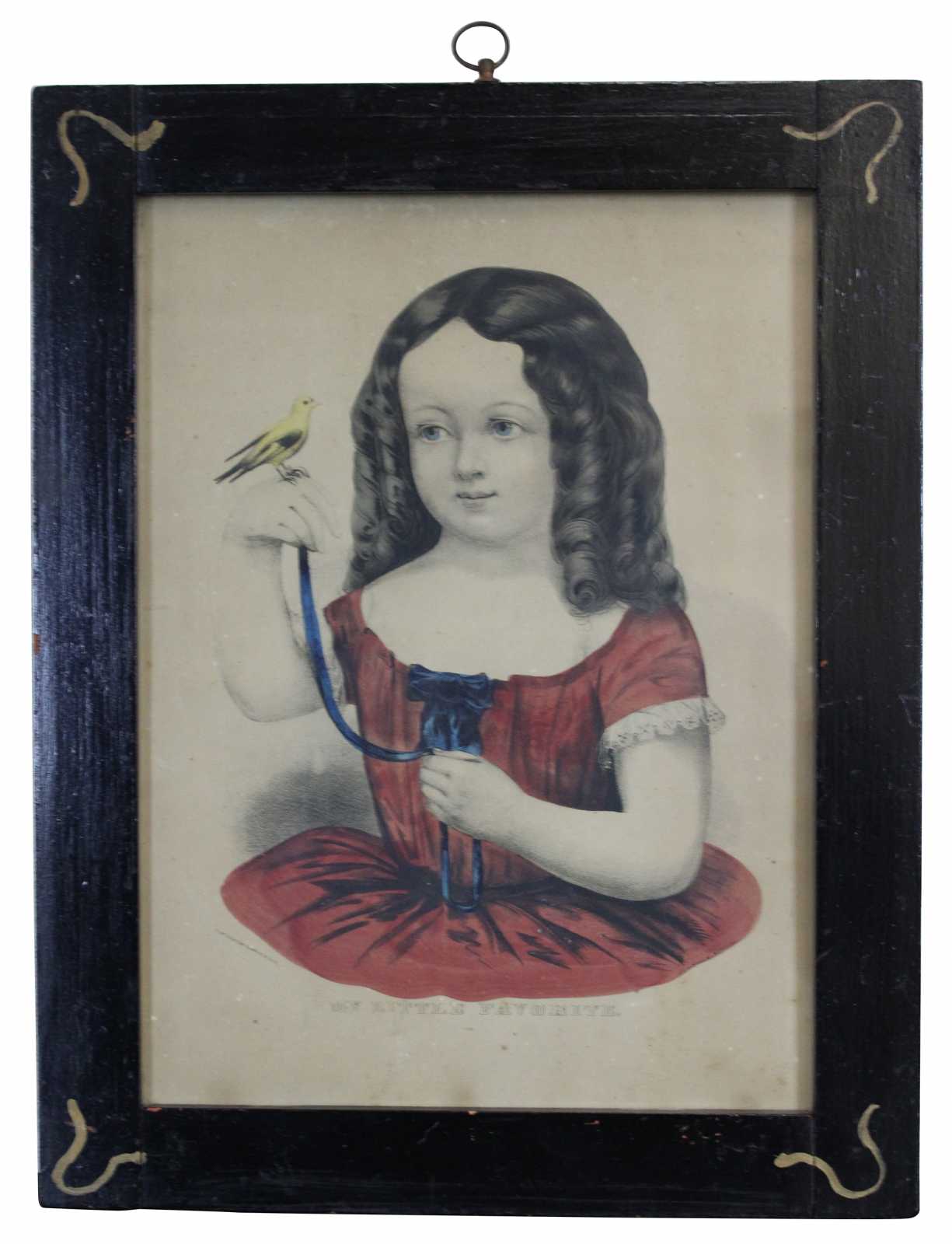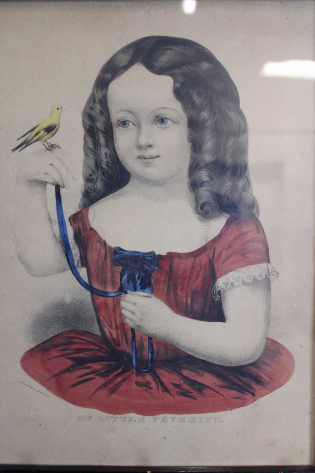 Two antique 19th century Victorian prints by Currier & Ives. One is Titled Georgie, Quite Tired #704 and features a girl with her head laying on a pillow / furniture. The other is titled My Little Favorite #103 and featurs a girl with curls dressed in a red formal dress with her pet bird (Canary). Both are presented in matching folk art painted wood frames.