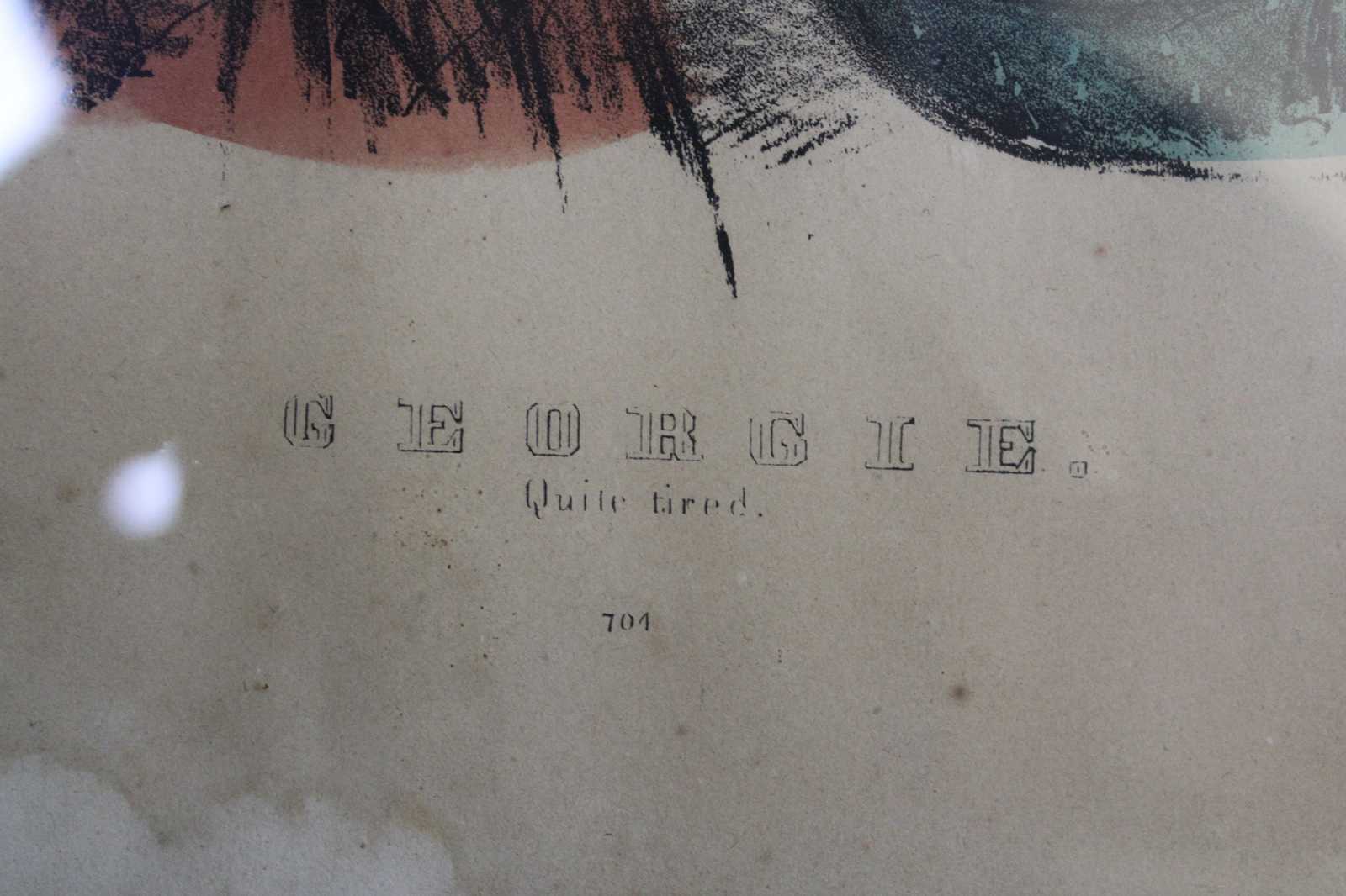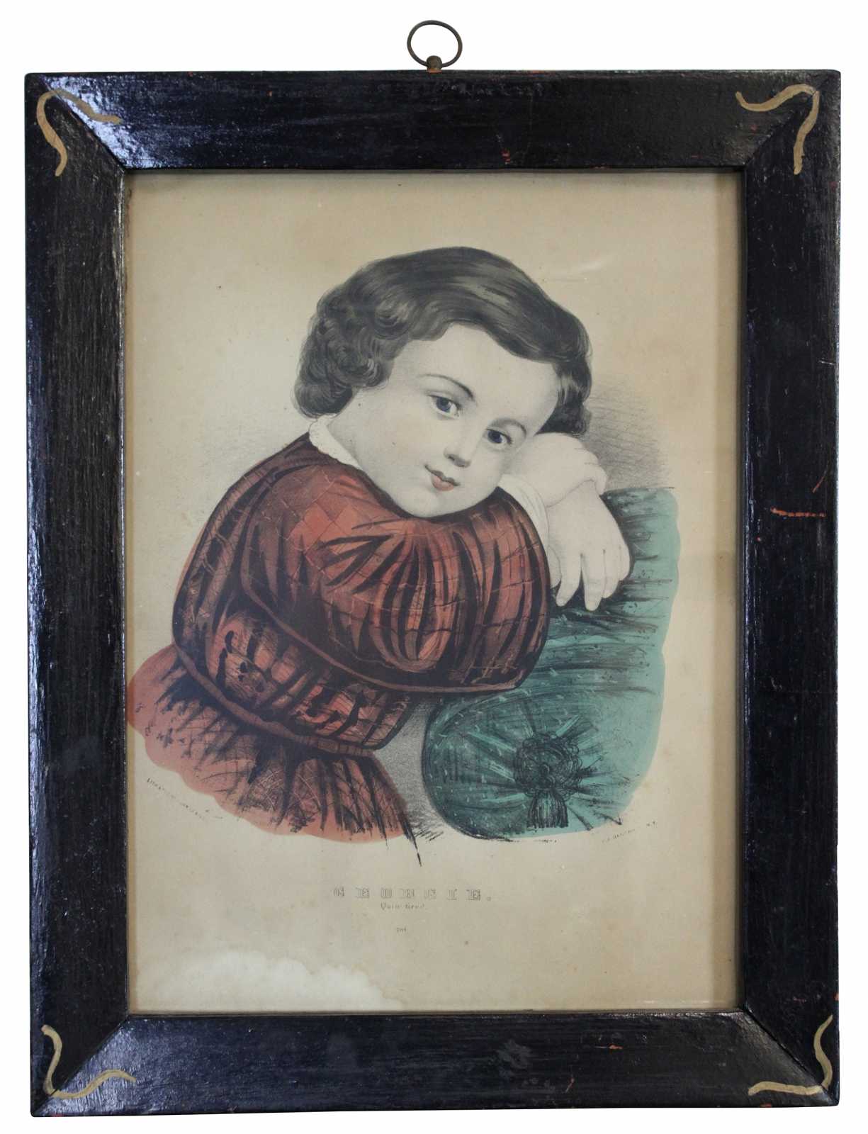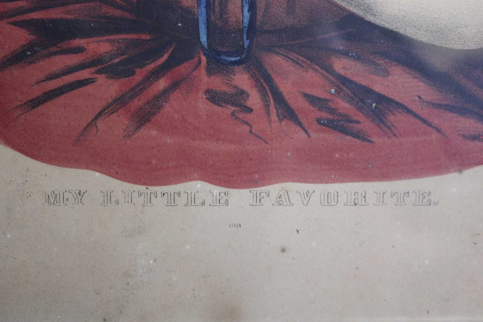 Two antique 19th century Victorian prints by Currier & Ives. One is Titled Georgie, Quite Tired #704 and features a girl with her head laying on a pillow / furniture. The other is titled My Little Favorite #103 and featurs a girl with curls dressed in a red formal dress with her pet bird (Canary). Both are presented in matching folk art painted wood frames.