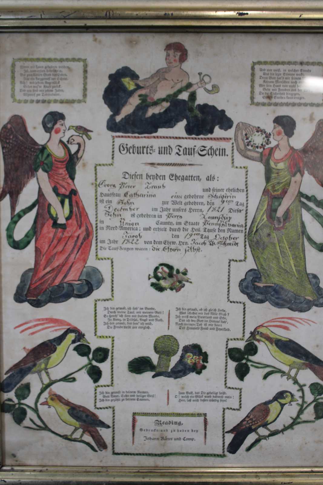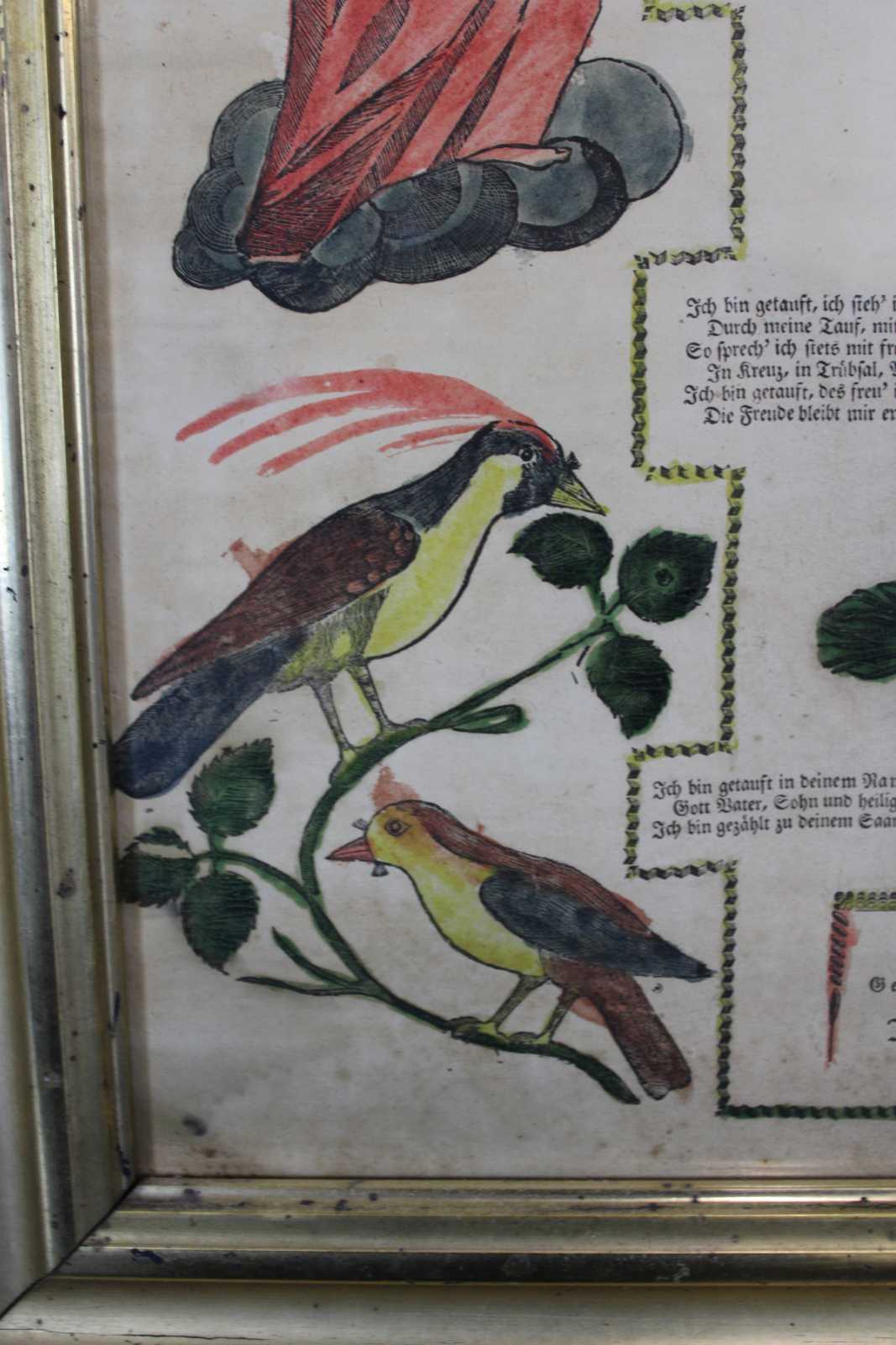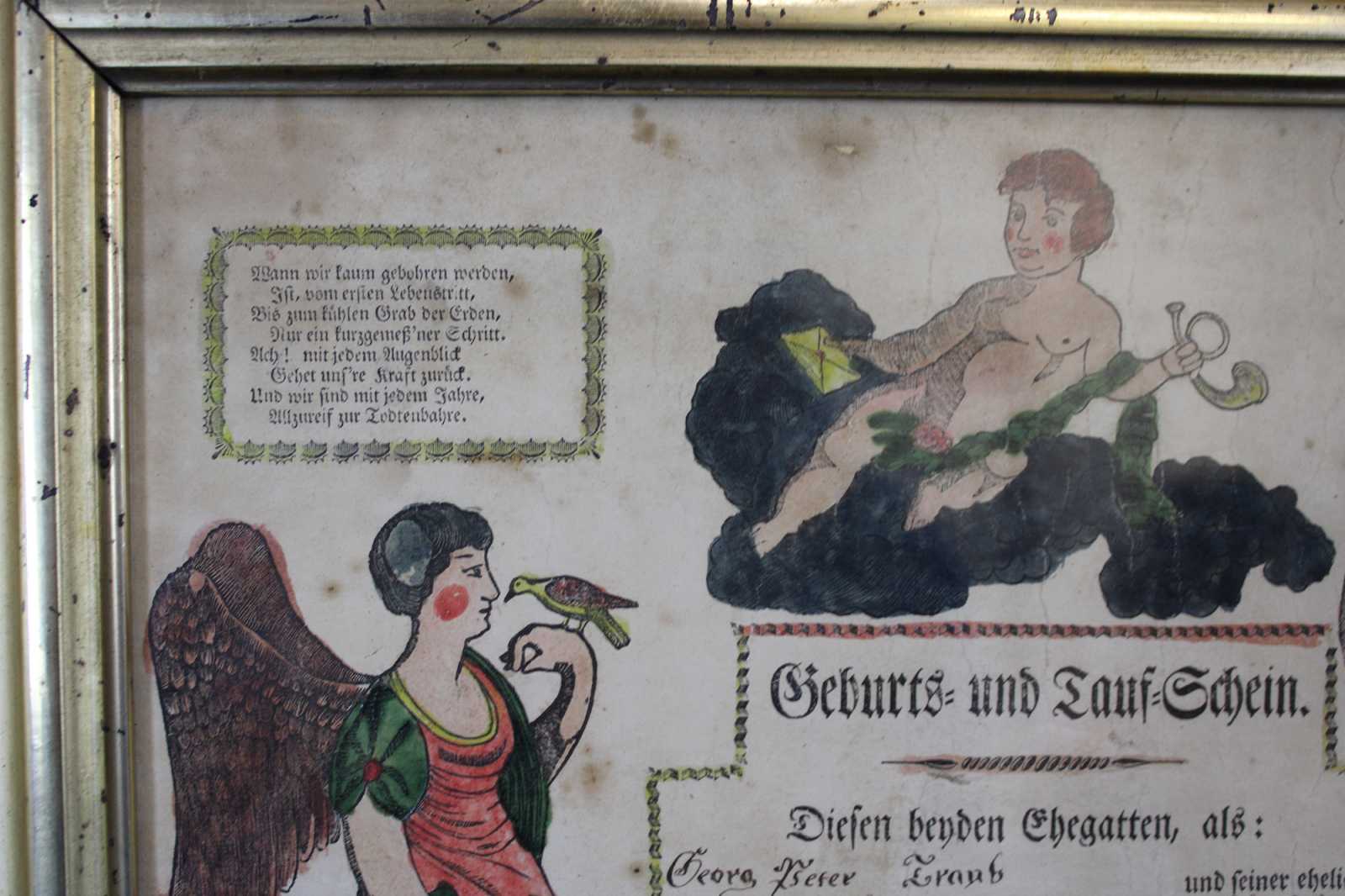 Antique 1822 German Birth and Baptism Certificate copper plate engraving by Johann Ritter & Company. Features a hand colored engraving with cherubs, angels, birds, harps and a poem. Signed 1821 / 1822.