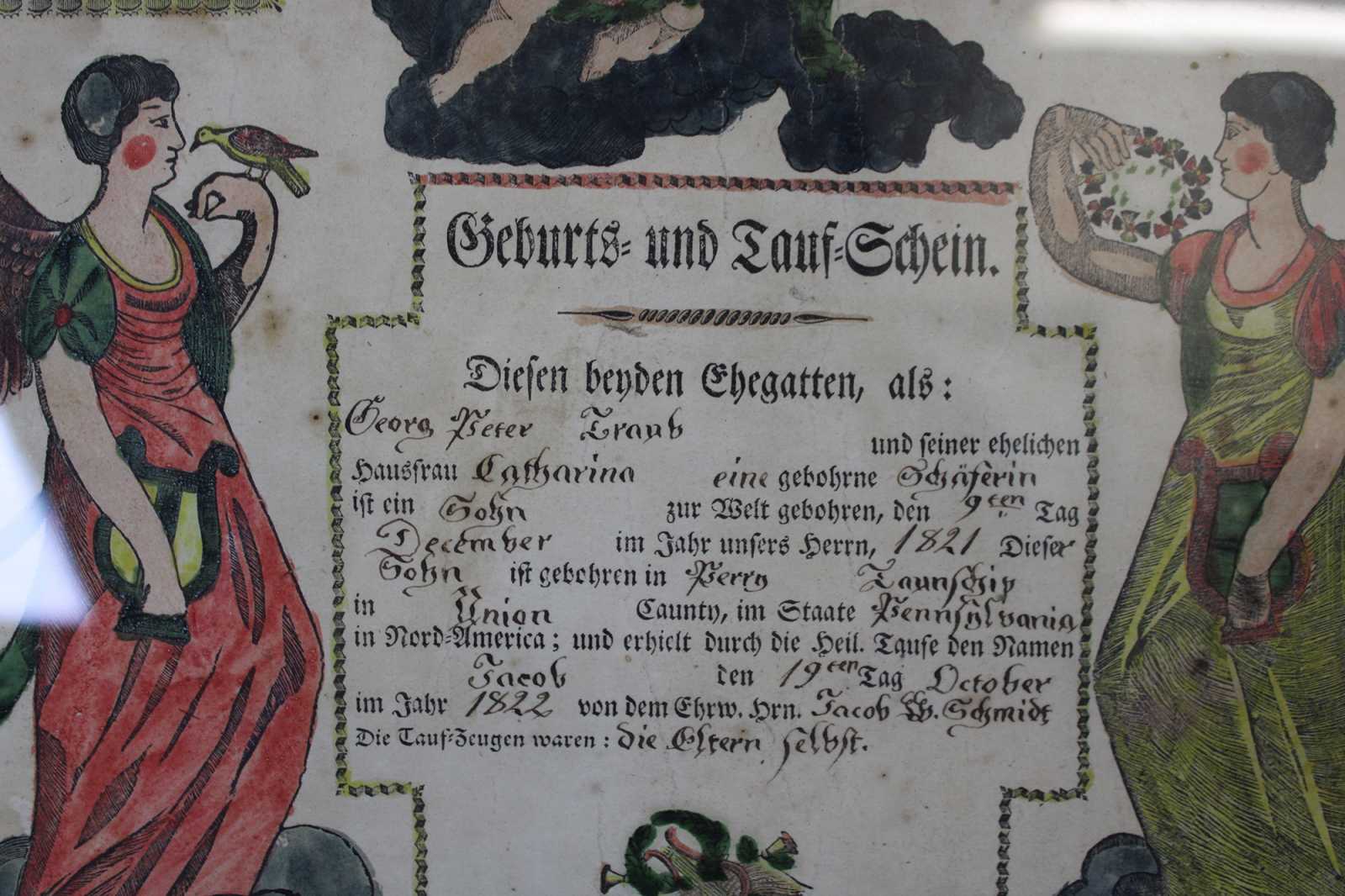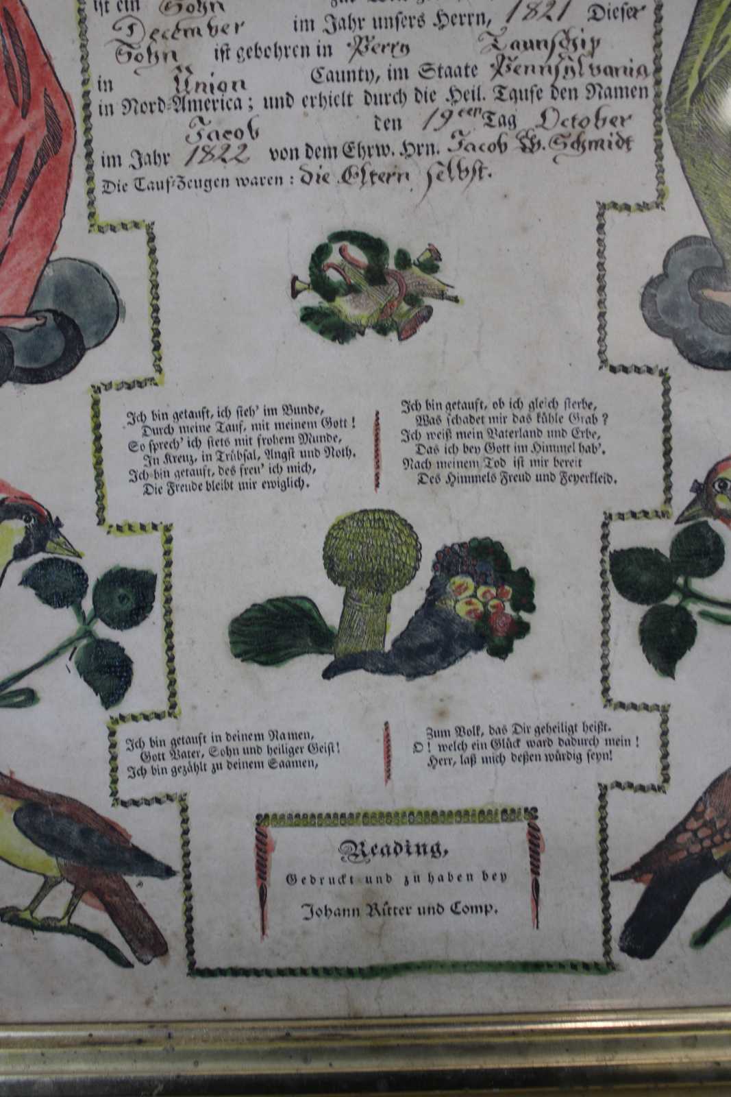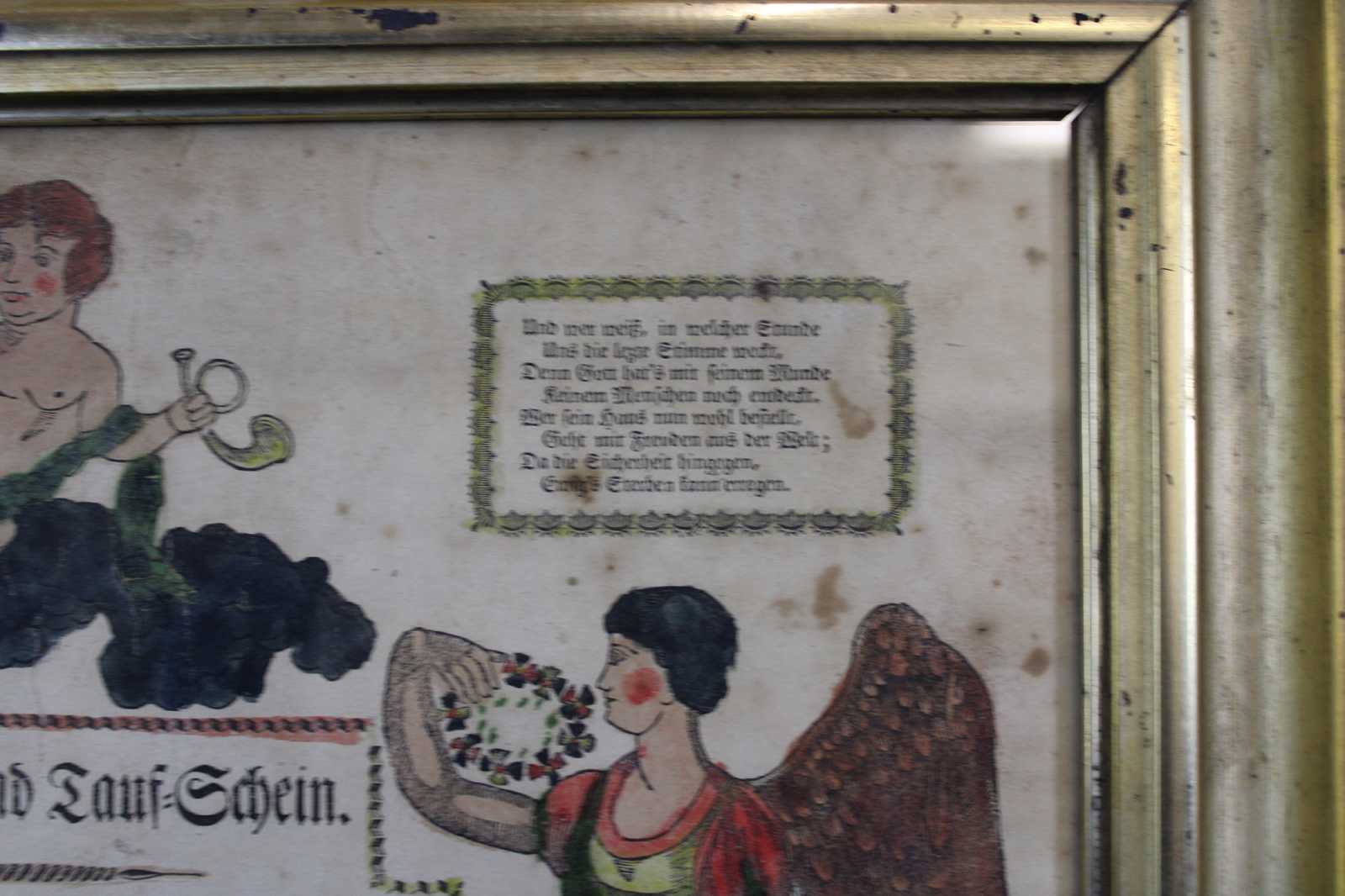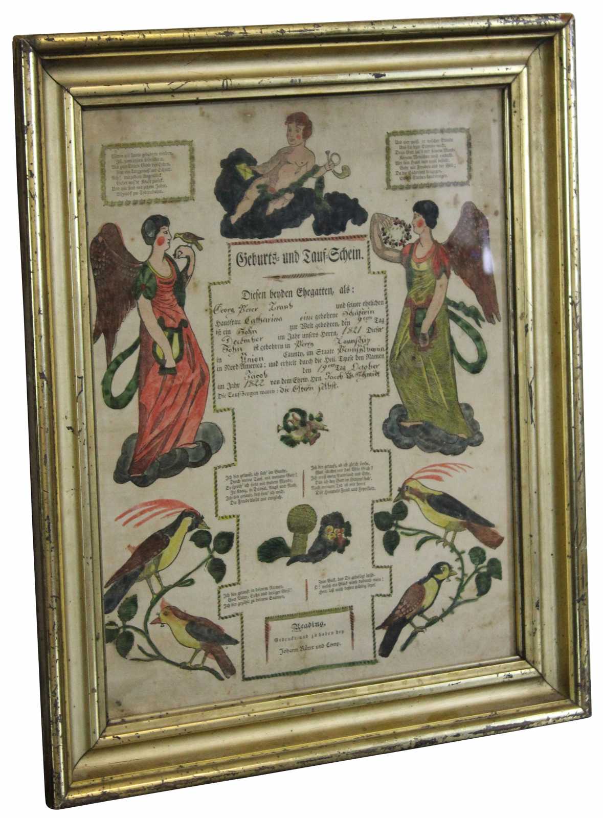 Antique 1822 German Birth and Baptism Certificate copper plate engraving by Johann Ritter & Company. Features a hand colored engraving with cherubs, angels, birds, harps and a poem. Signed 1821 / 1822.