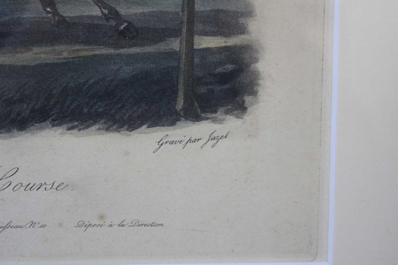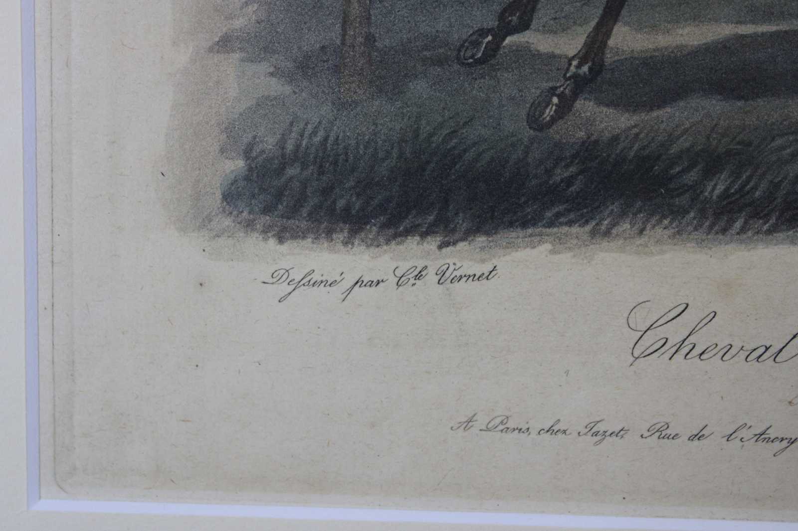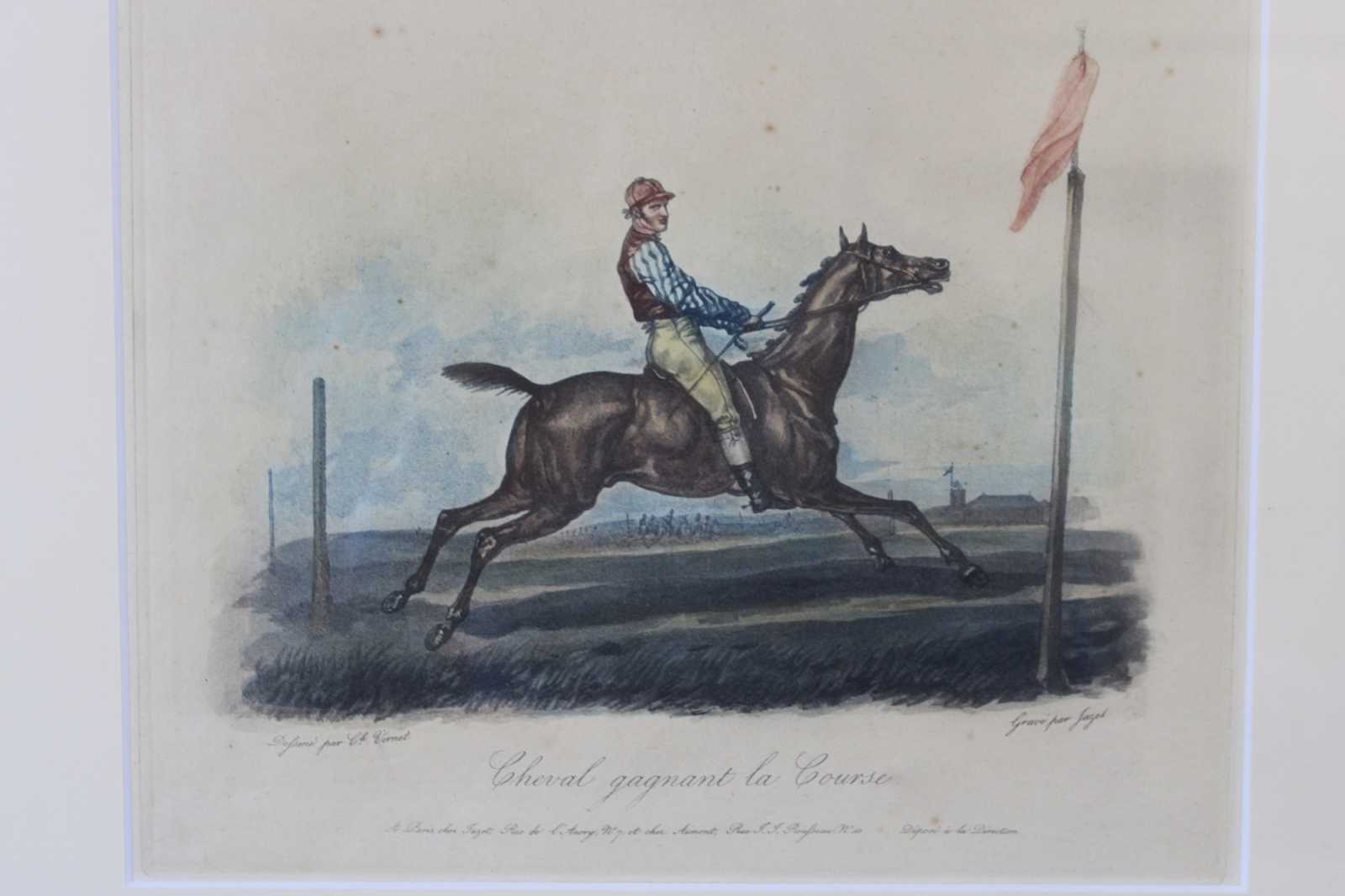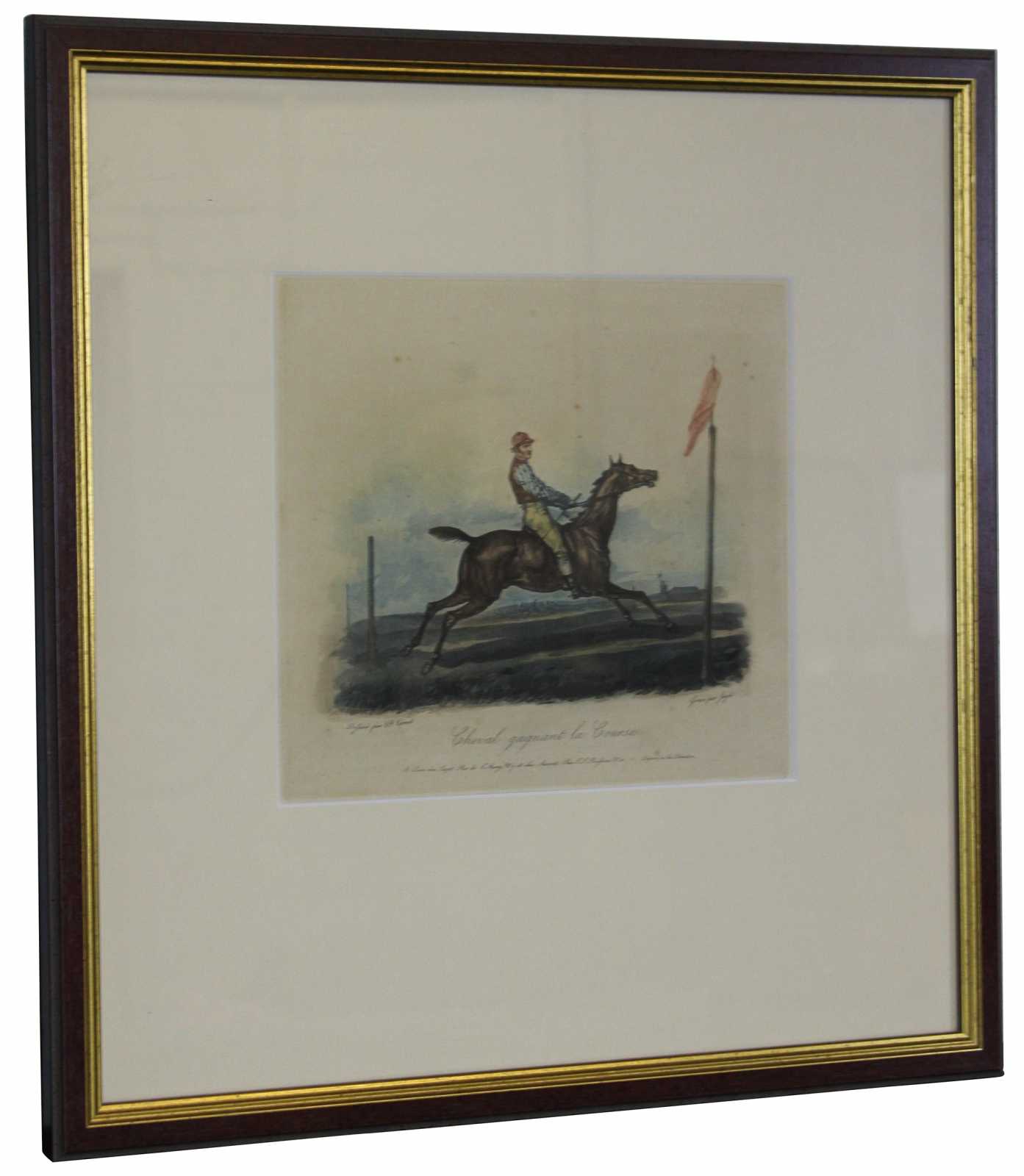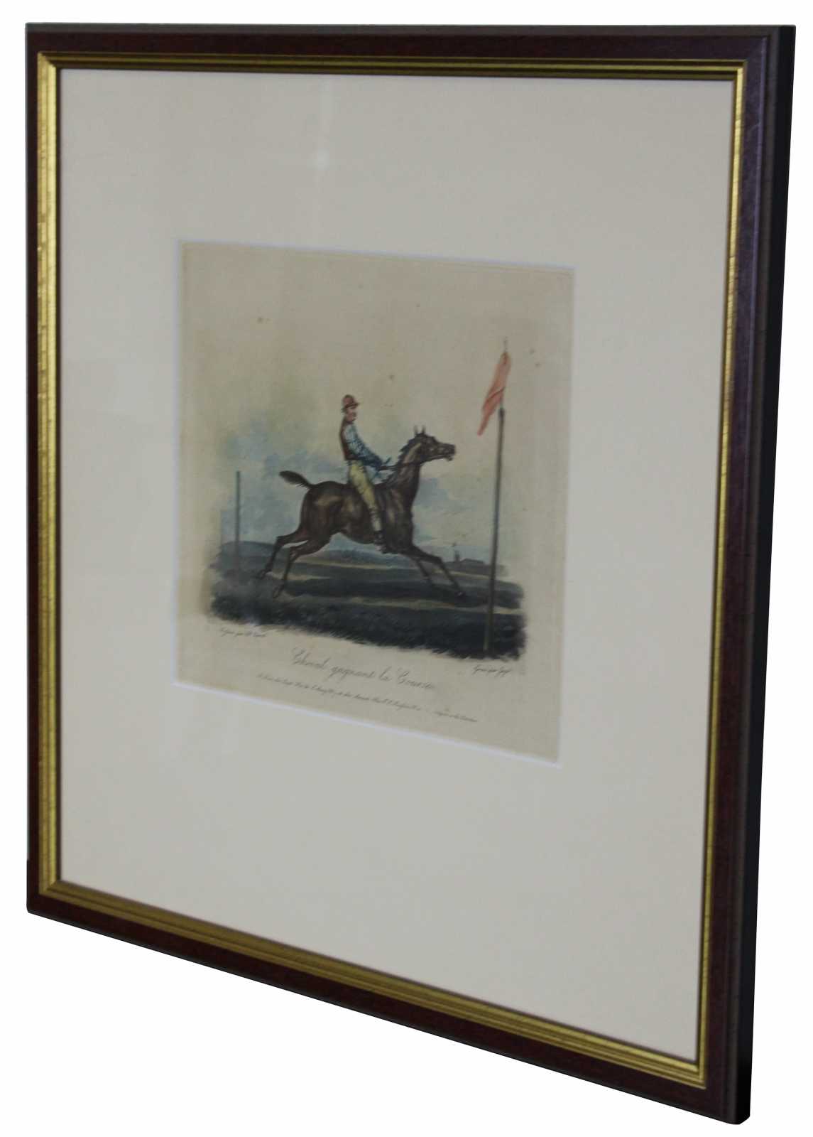 Mid 19th century hand colored equestrian engraving after French artist Carle Vernet. Title is Cheval Gagnant; A Course or "Horse Wins the Race
