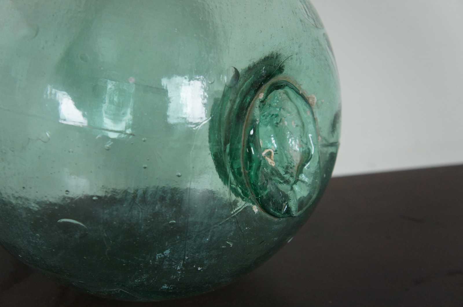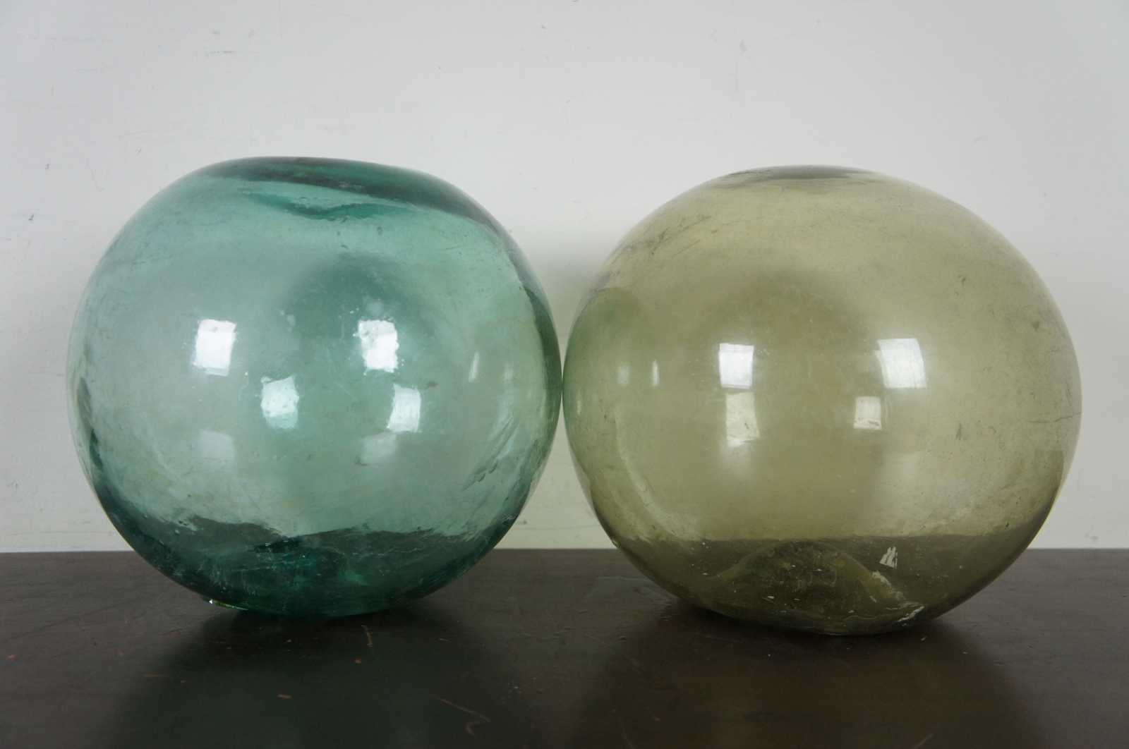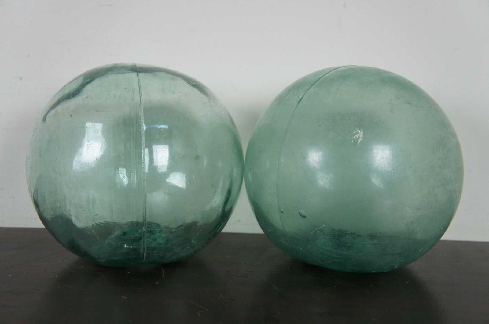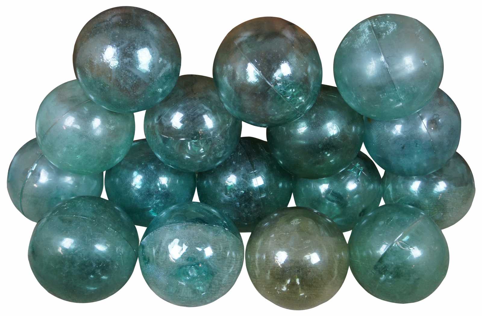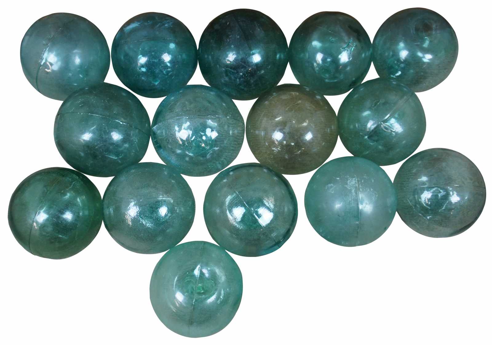 Lot of sixteen hand blown blue-green (and one yellow-brown) Japanese fishing floats. Made from recycled glass bottles and used to buoy a fisherman's net when cast into the water.