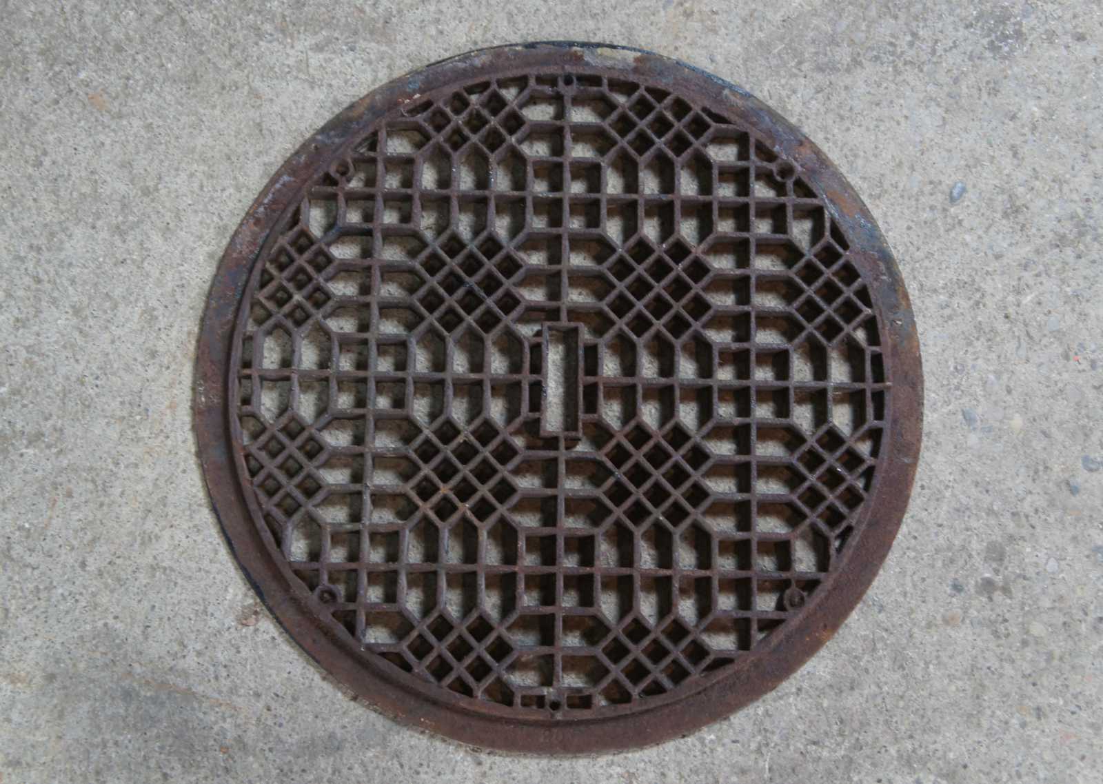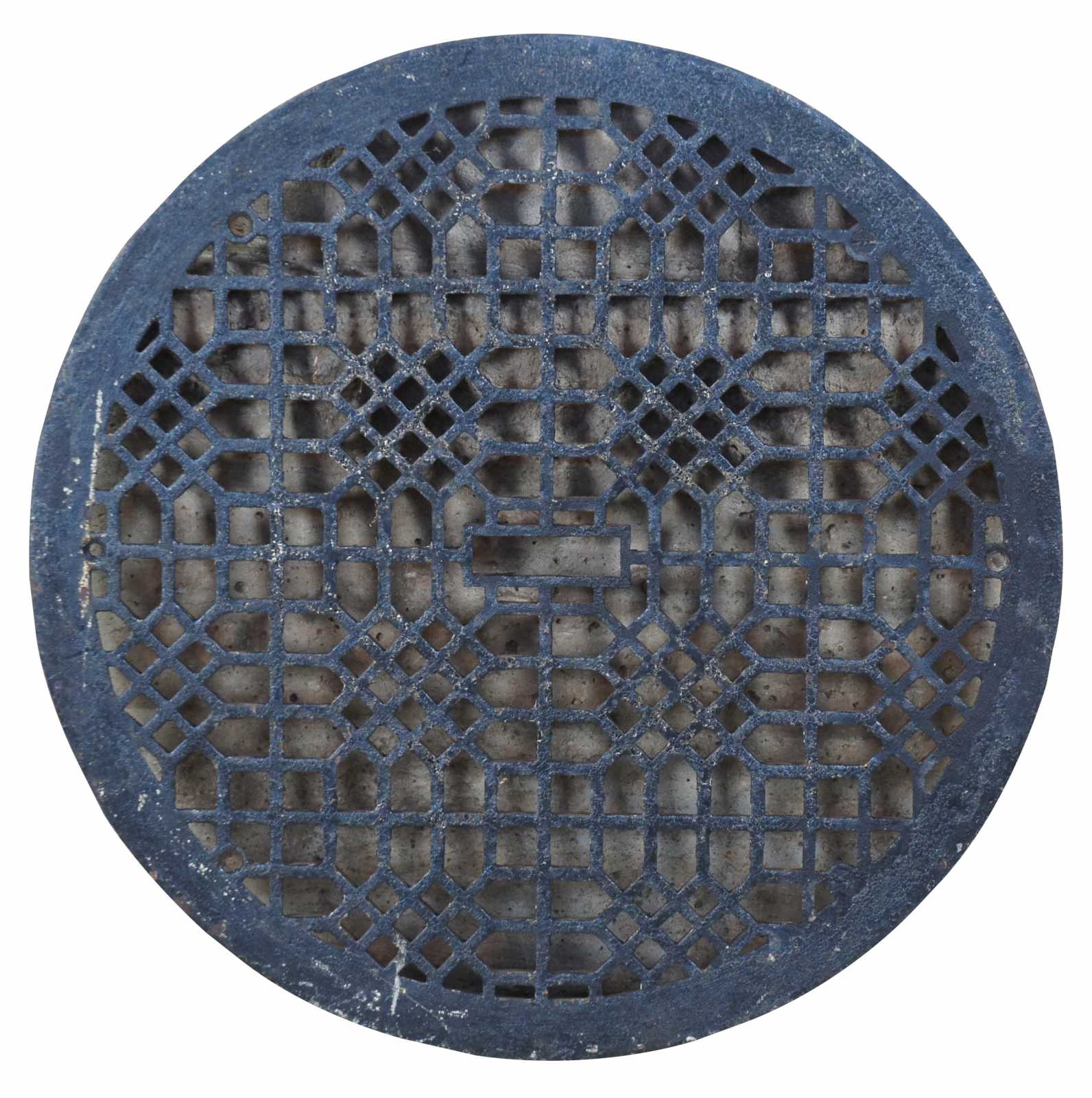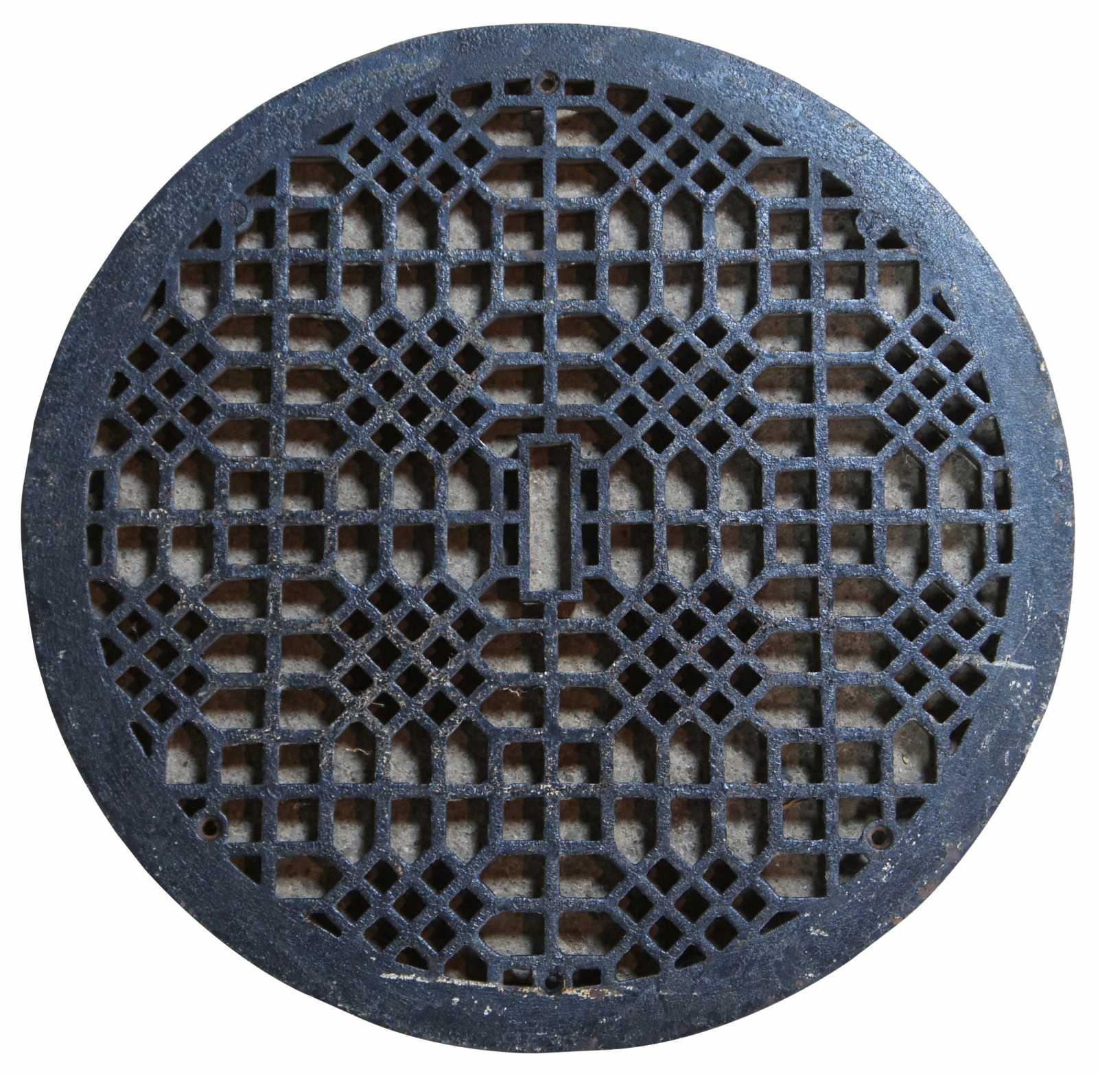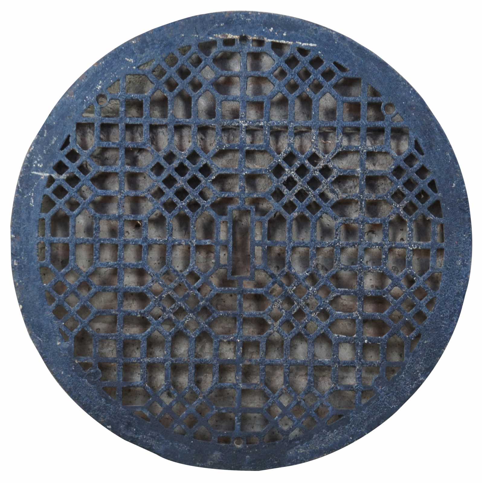 Antique Victorian cast iron grate. 22" round with 20" insesr. Features an ornate pierced design. Perfect for use as an architectural element or grate for a heat vent