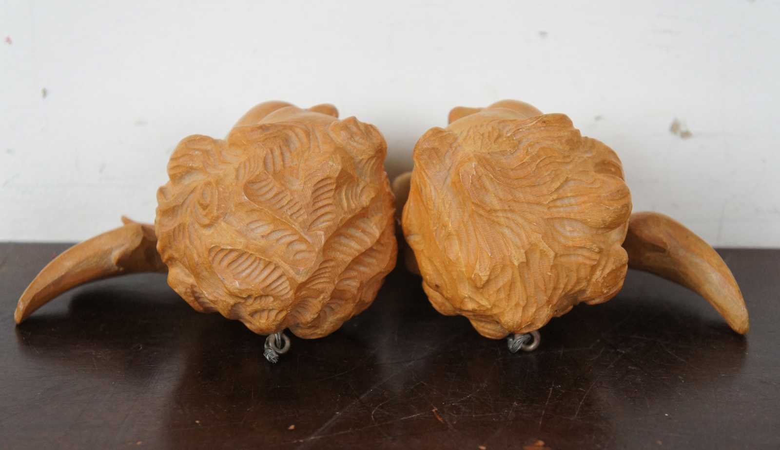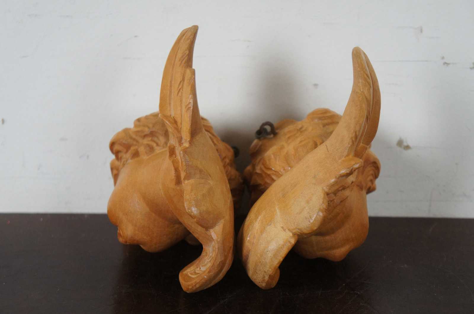 Pair of vintage carved wood putti cherubs / angels, wall or ceiling hanging heads with wings.