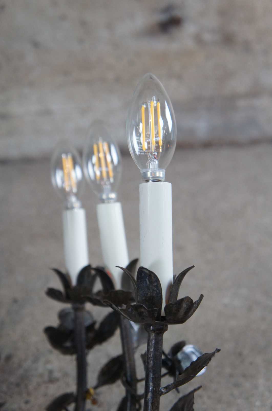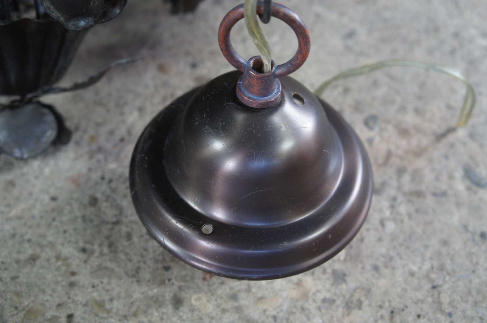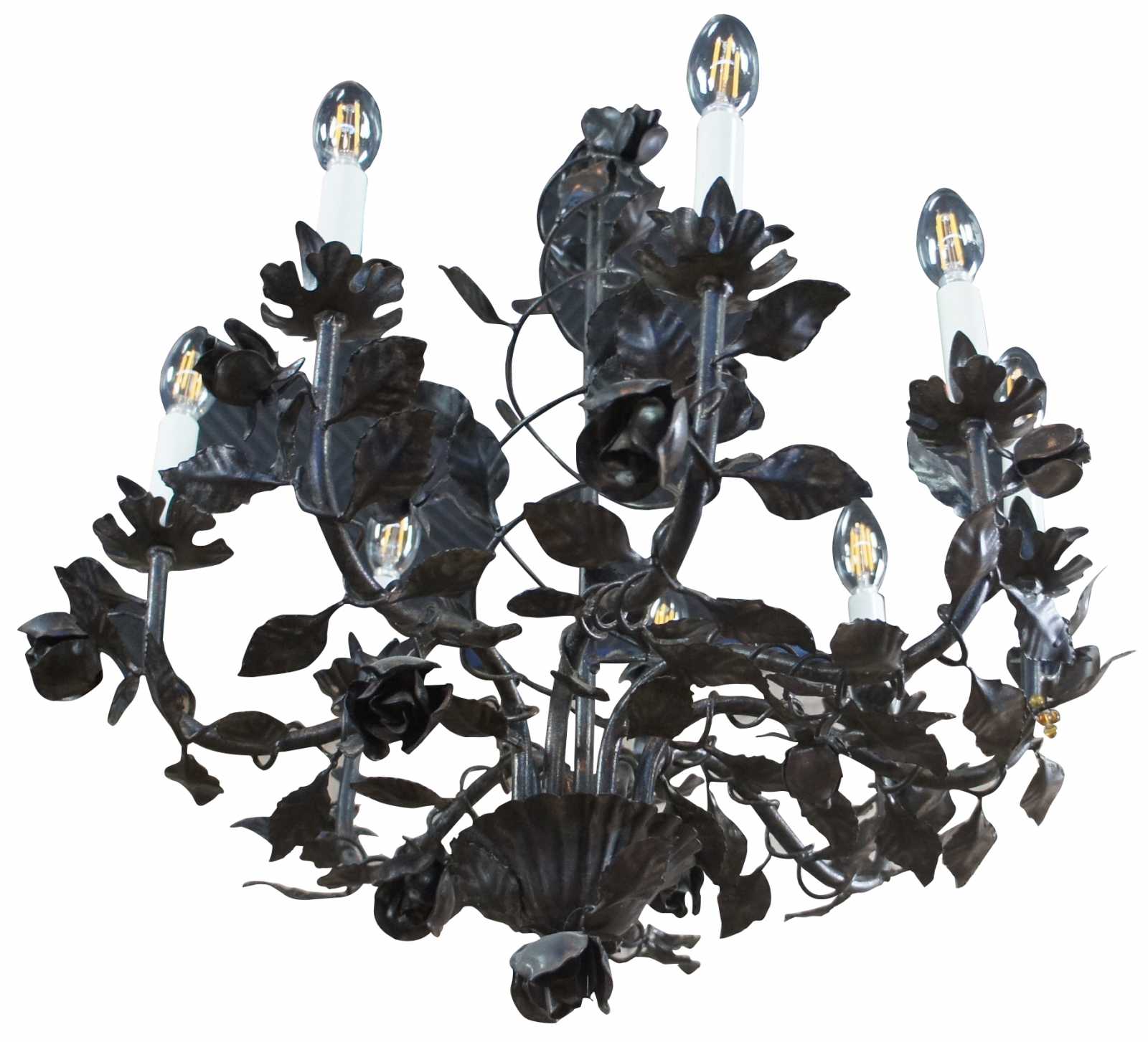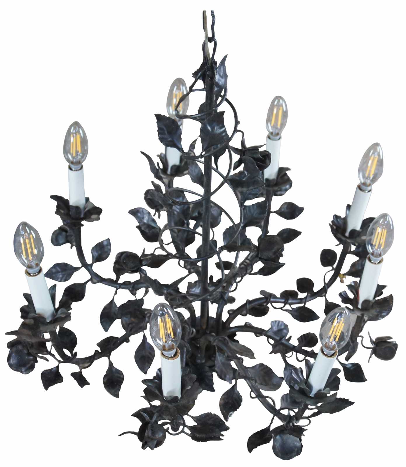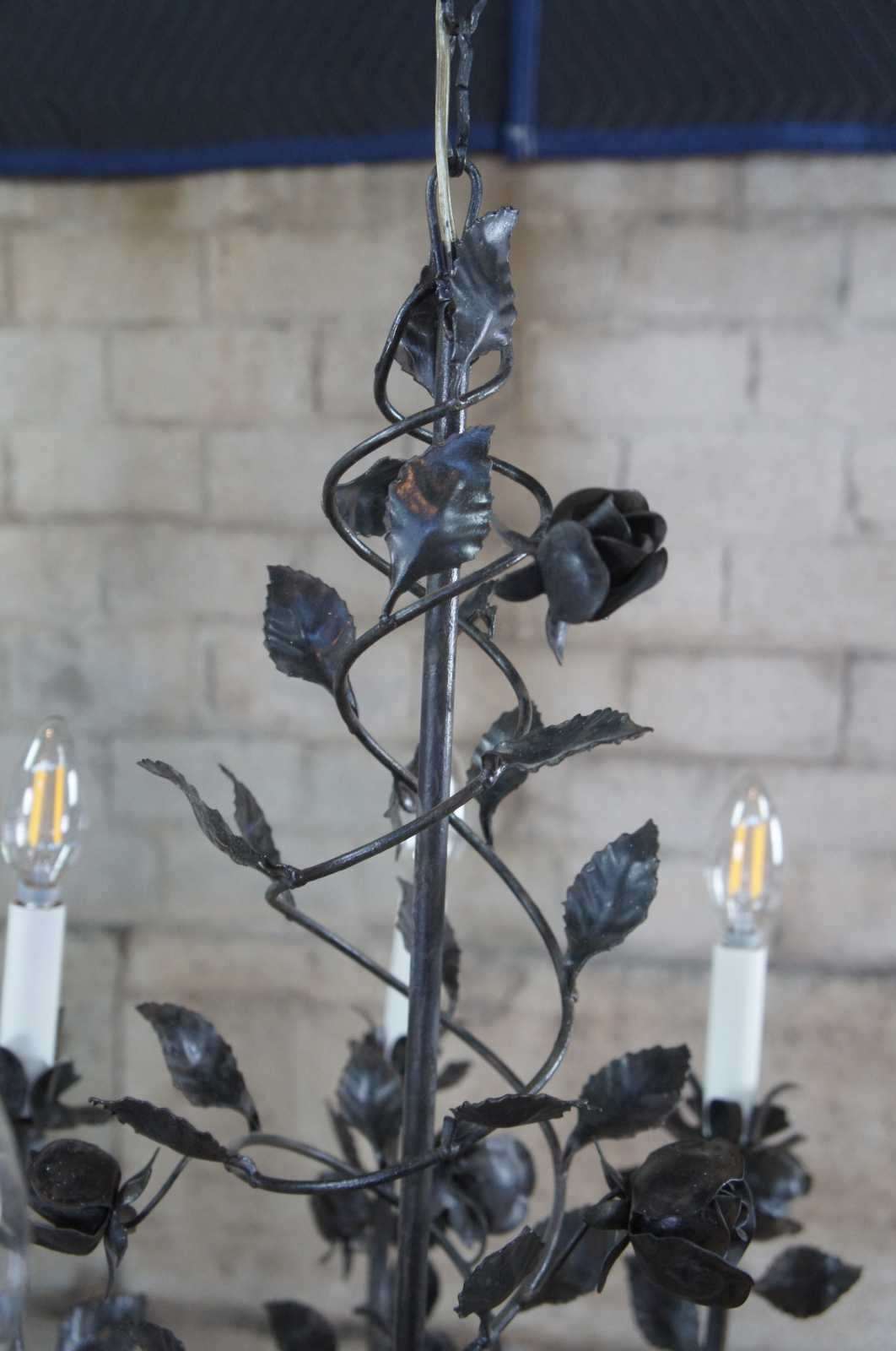 Vintage eight arm wrought iron chandelier featuring roses on a vine with spiral and scrolled design.