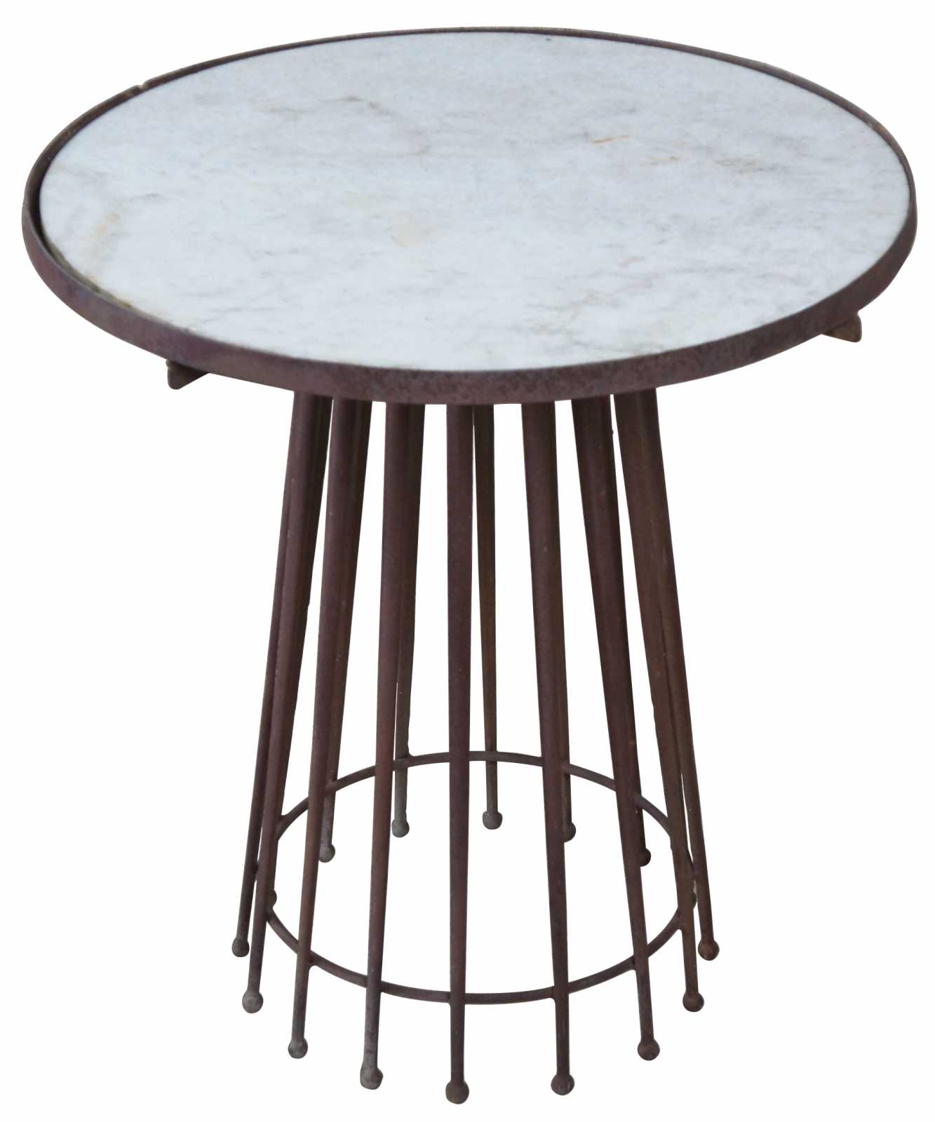 European marble top and wrought iron side accent table. Features a circular white marble top that rests within a wrought iron band and sits above sixteen wrought-iron needle form legs also in a circular formation with stretcher.