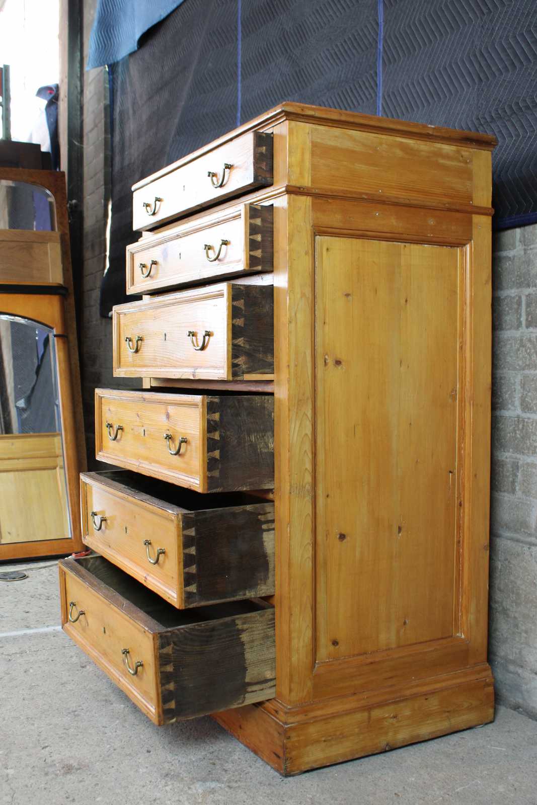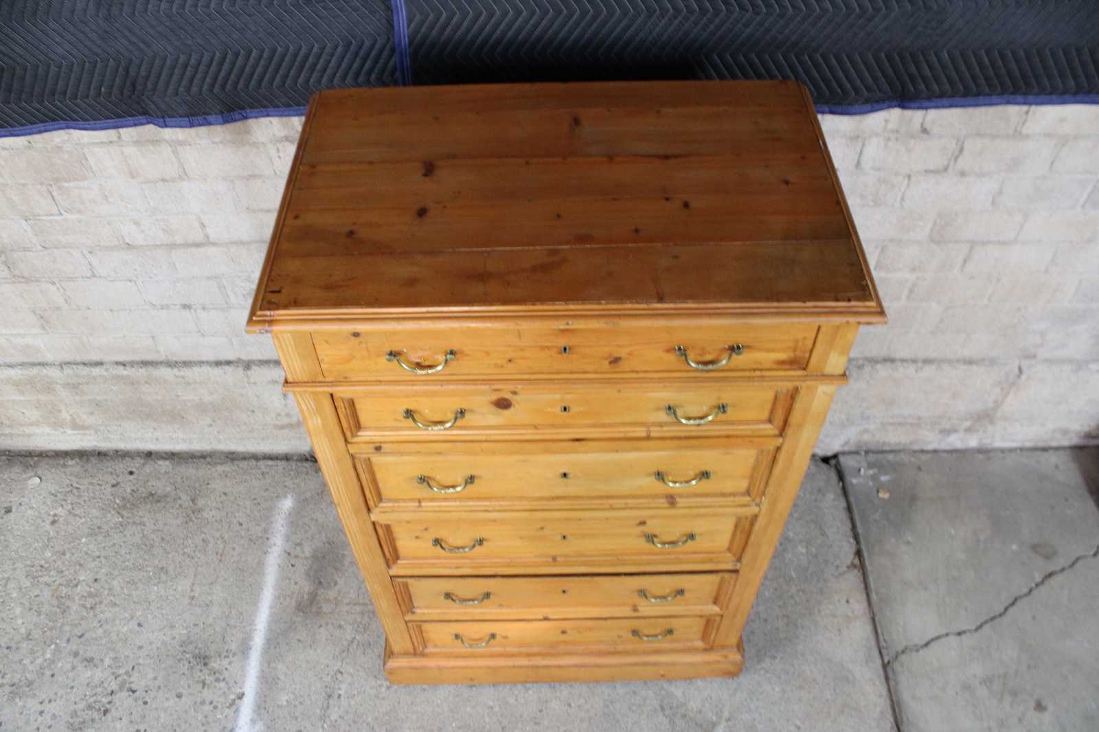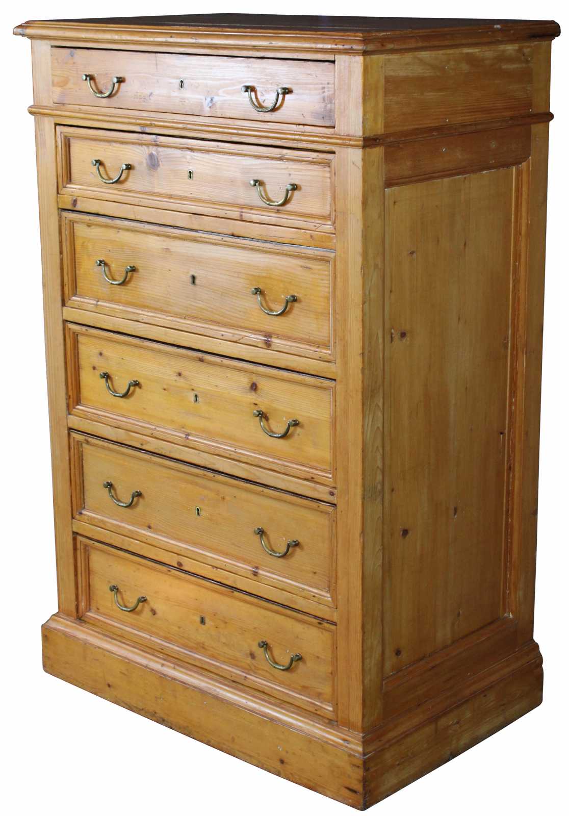 A stunning 19th century English tall chest of drawer or highboy. Made from pine with 6 lockable drawers and French brass hardware.