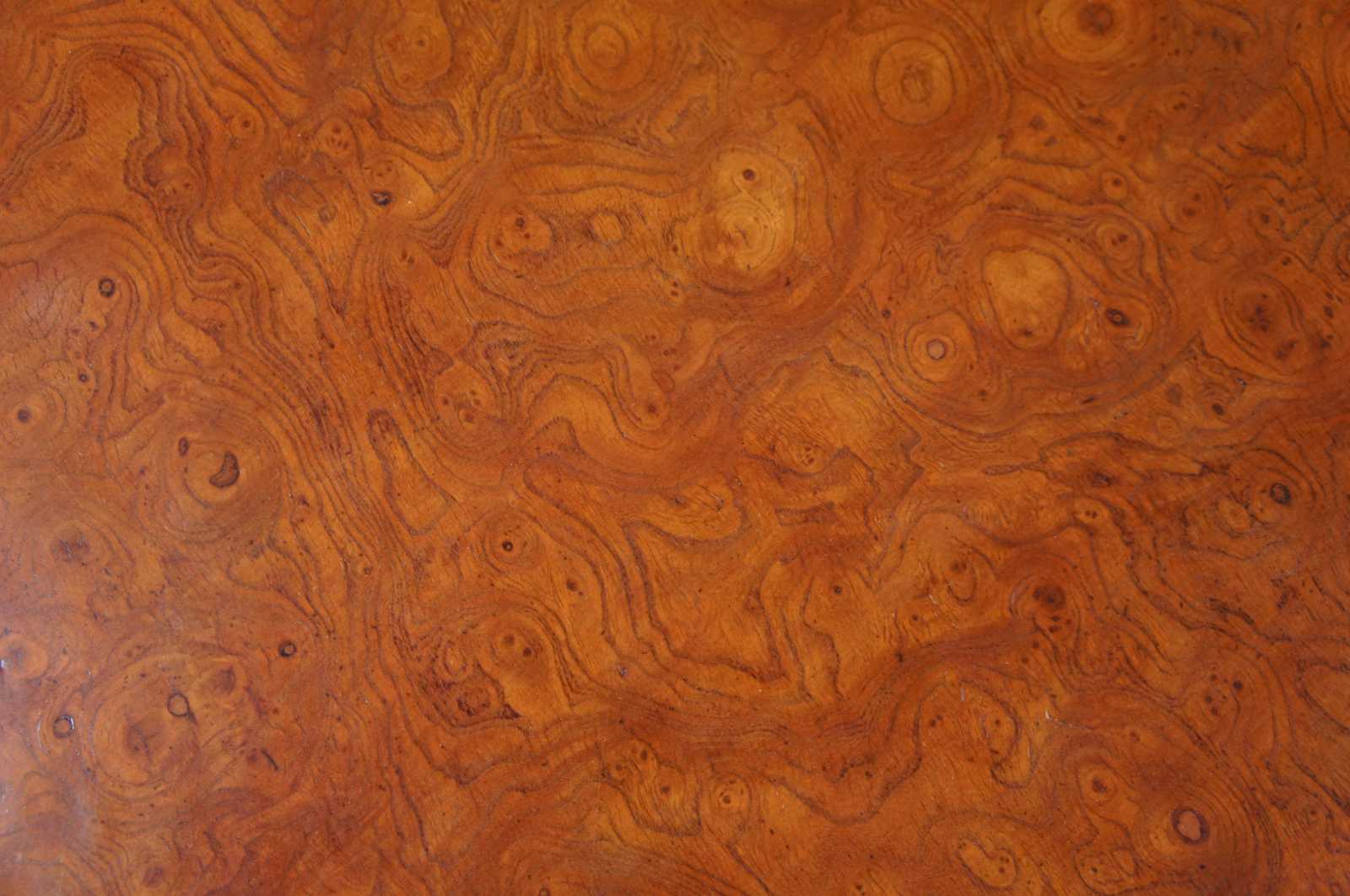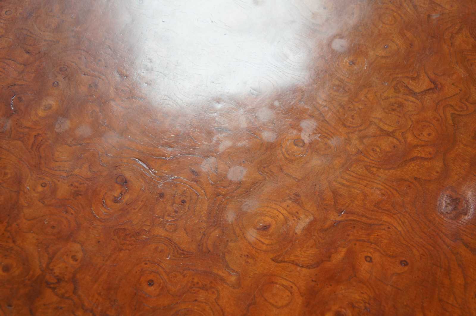Late 20th century olive burl and scrolled brass side table. Featuers a round top supported by three elegent brass scrolls over a tripod form base. Signed along underside.