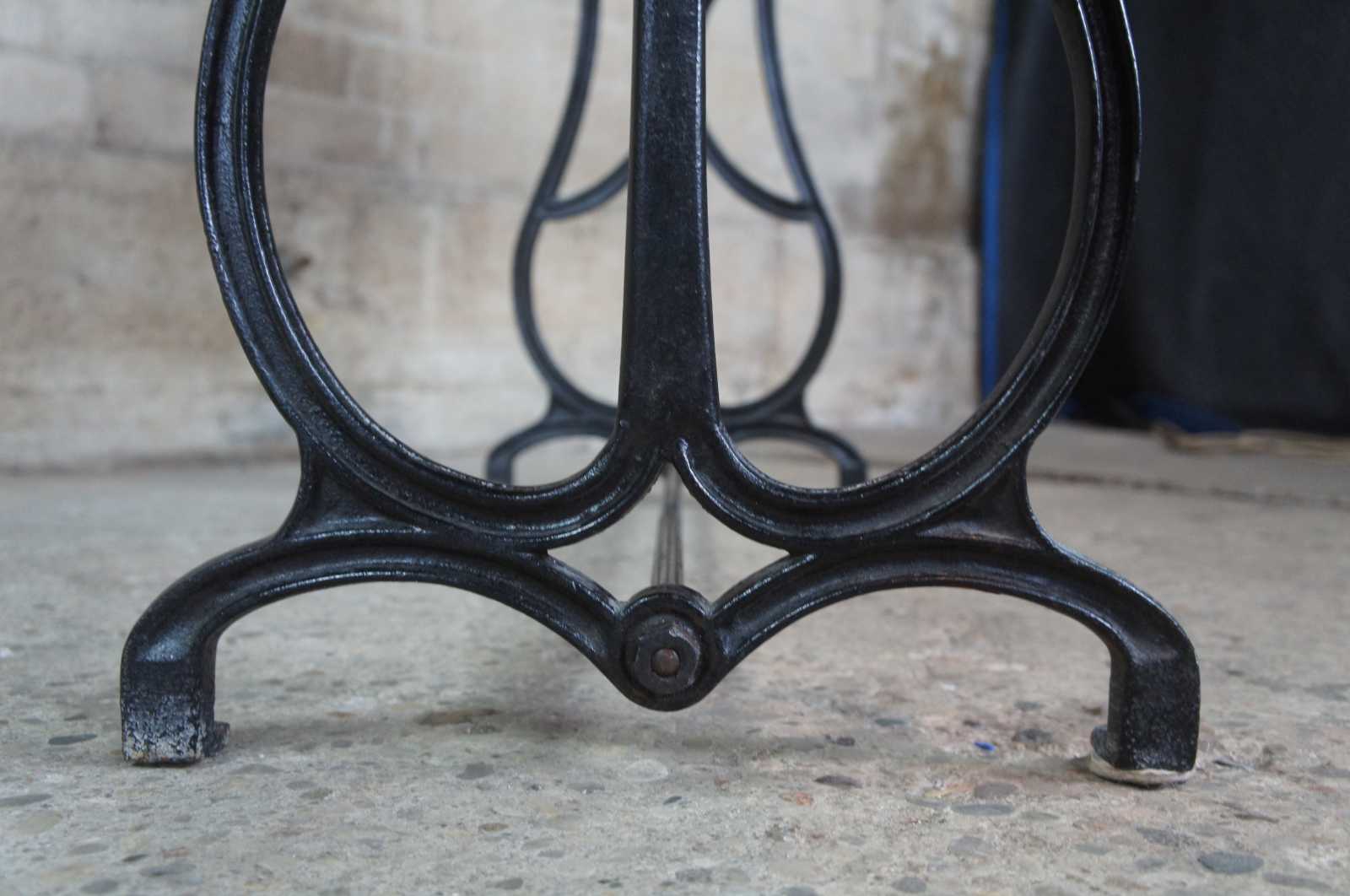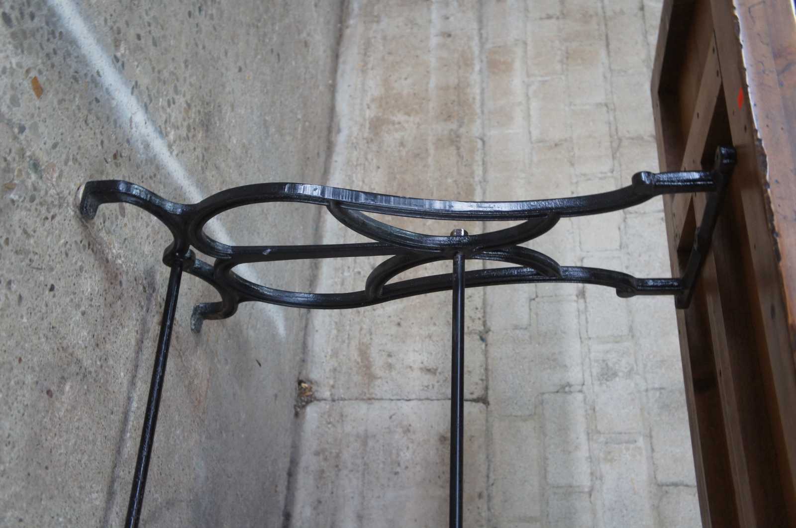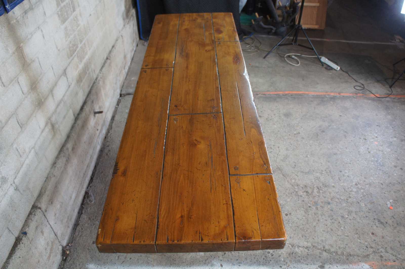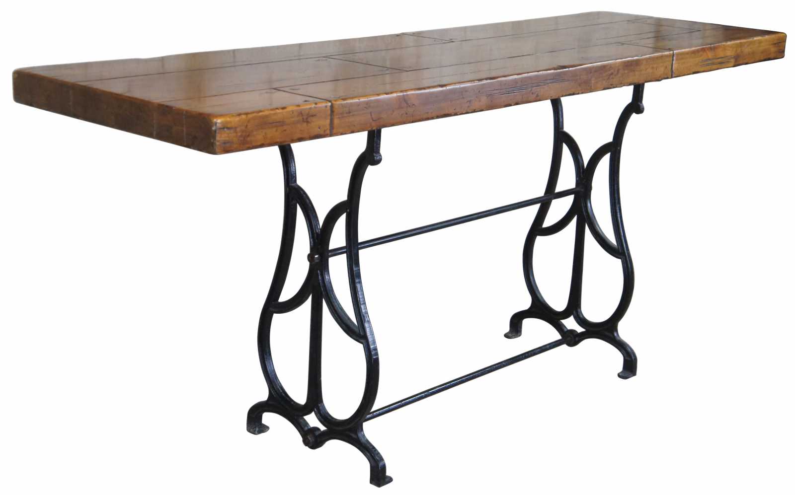 A unique pairing of transitional and antique styling. Features a Century Furniture disressed pine plank top over an antique Iron base. Great for use in an entry console, hallway or sofa table. The top is from 2005 while the base is from the early 20th century.