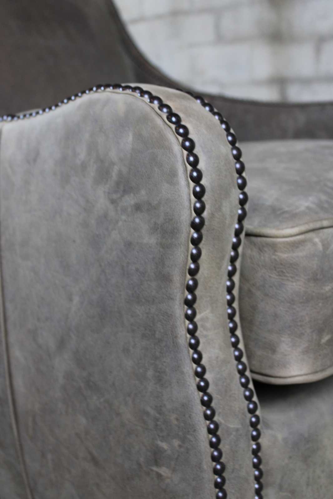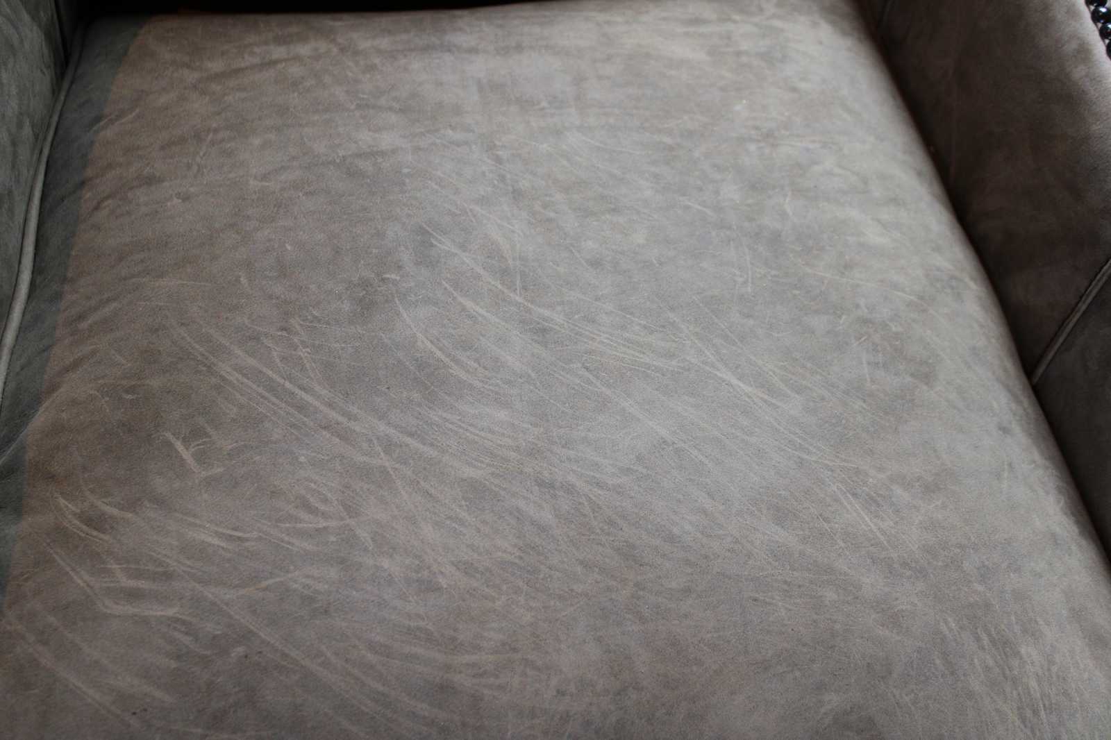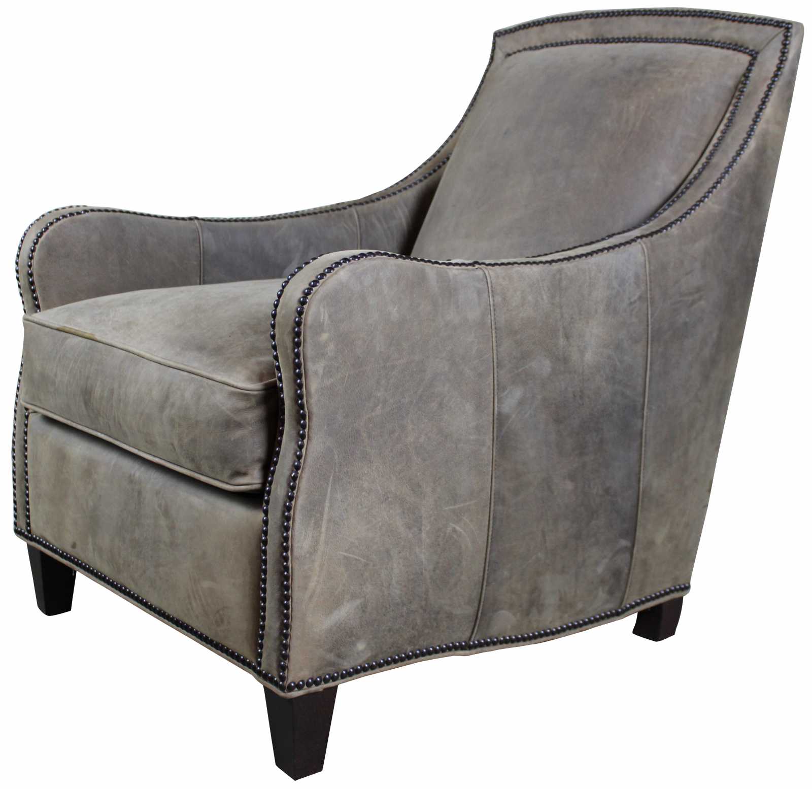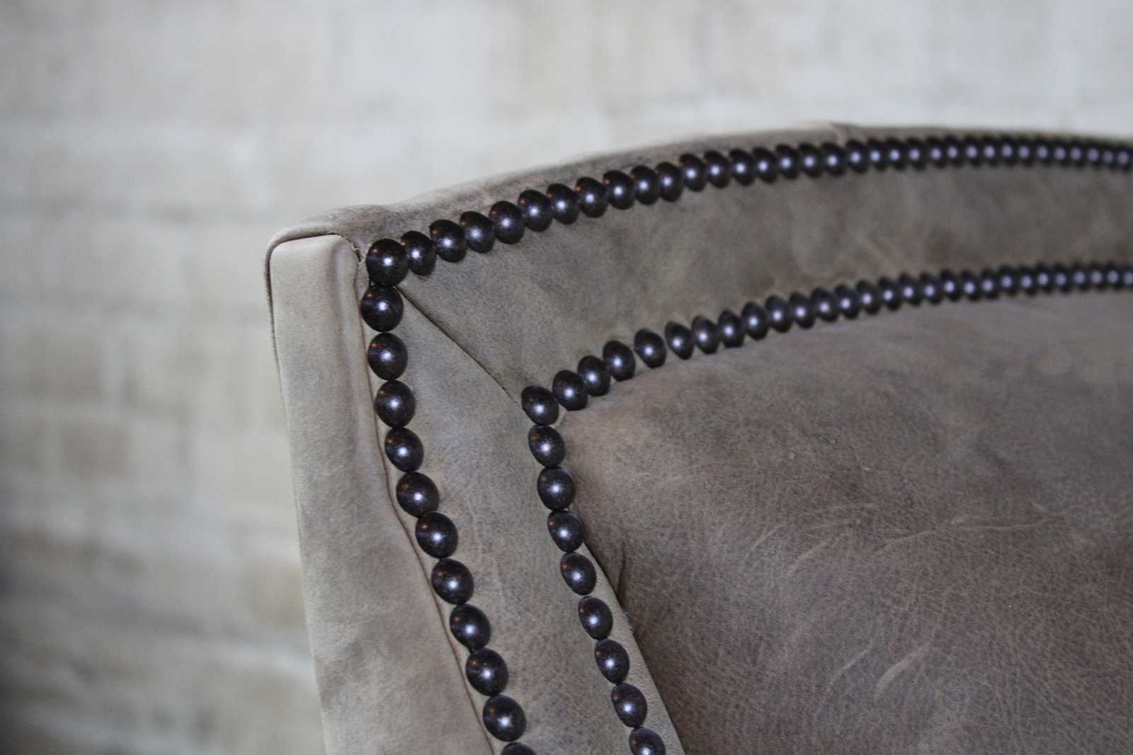 Pair of two Arhaus Furniture Dunbar arm chairs. Features a scrolled arm with gray suede upholstery accented with nailhead trim.
