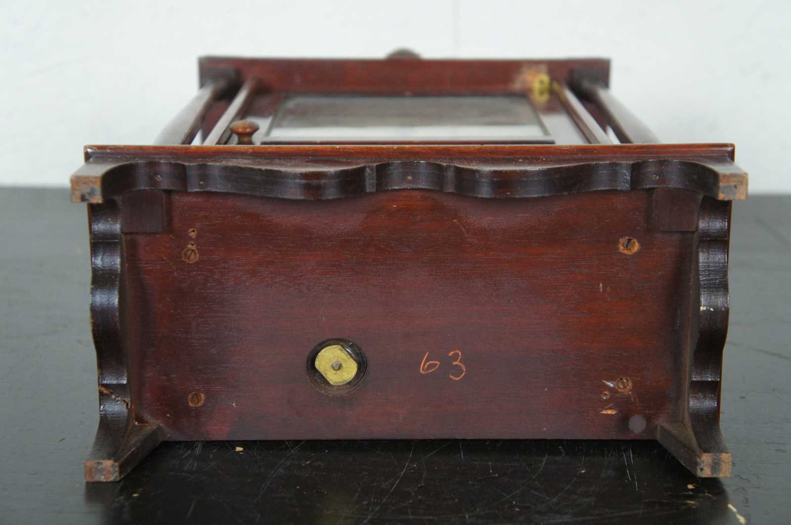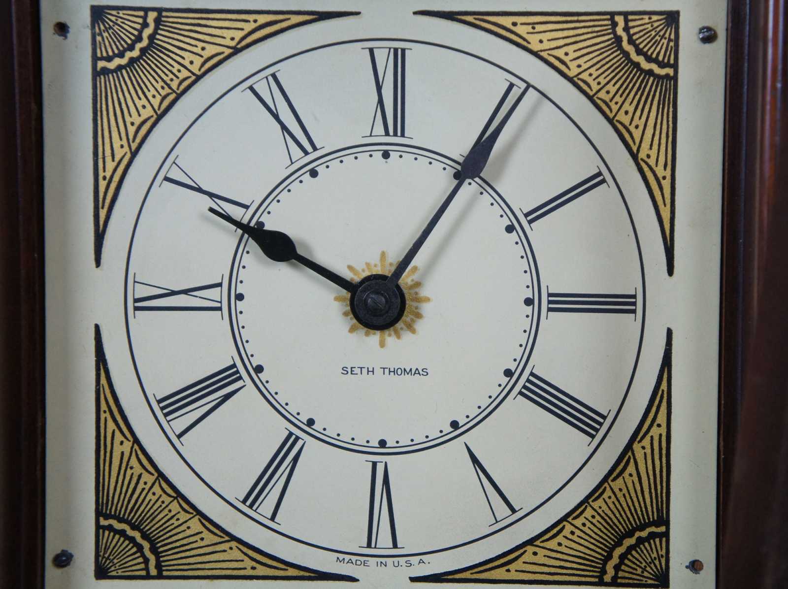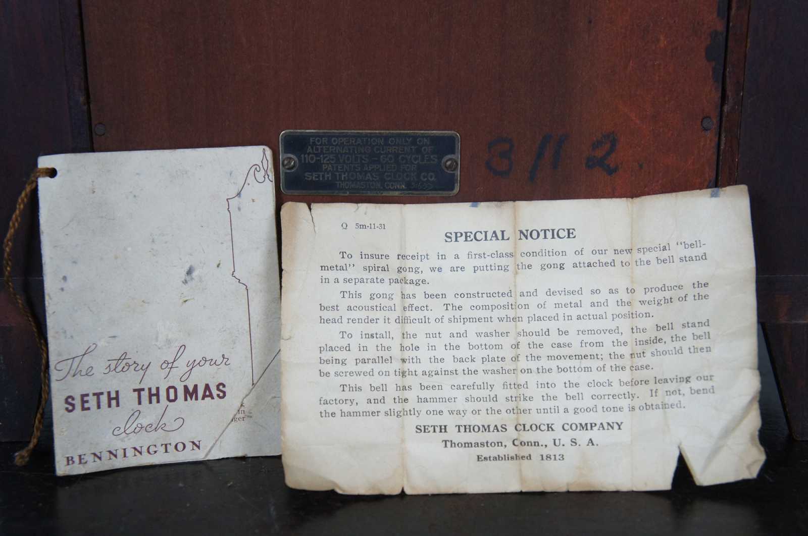 Antique circa 1930s Seth Thomas Kingsbury mahogany electric mantel or shelf clock. A special order as the majority of these clocks are winding. Features a pillar and scroll styling and mansion house reverse painted landscape on the door and bronze finials with open pediment scroll work.