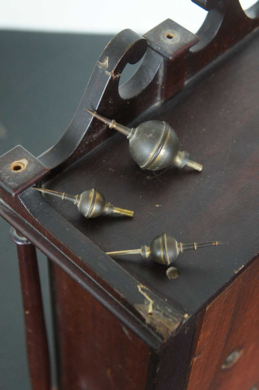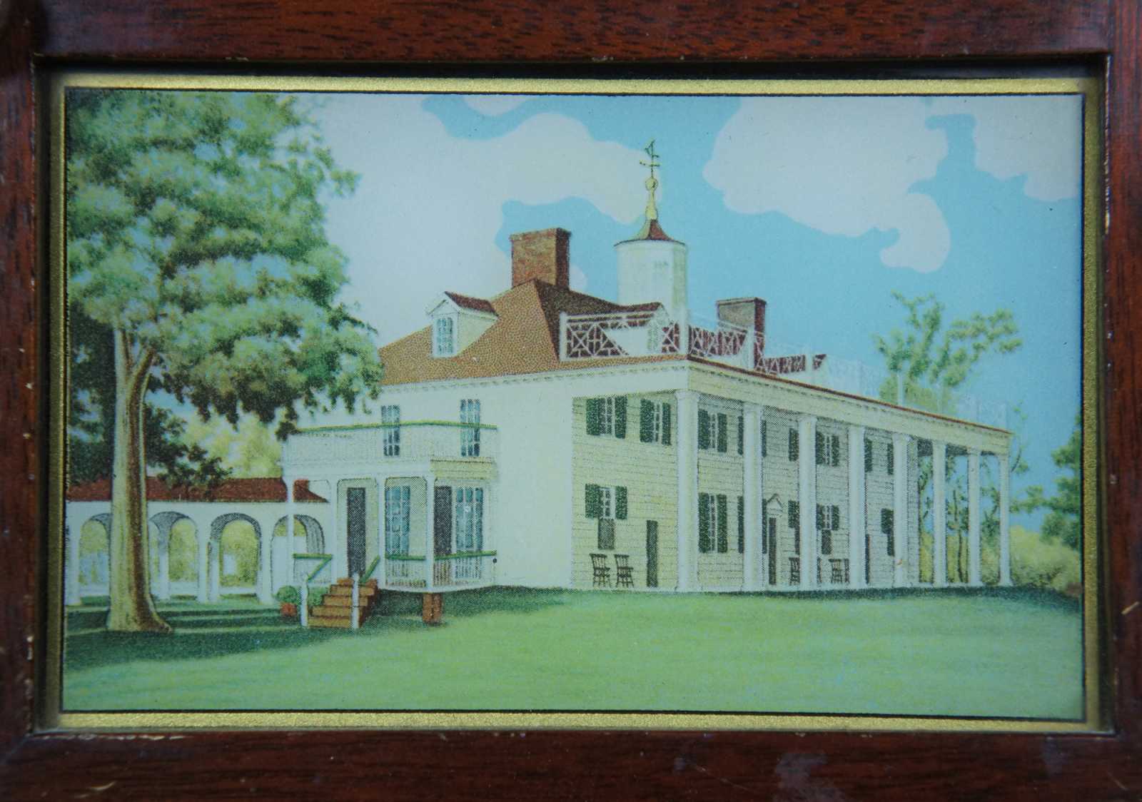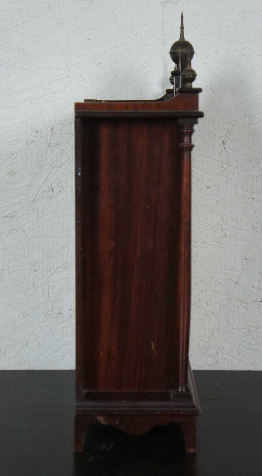 Antique circa 1930s Seth Thomas Kingsbury mahogany electric mantel or shelf clock. A special order as the majority of these clocks are winding. Features a pillar and scroll styling and mansion house reverse painted landscape on the door and bronze finials with open pediment scroll work.