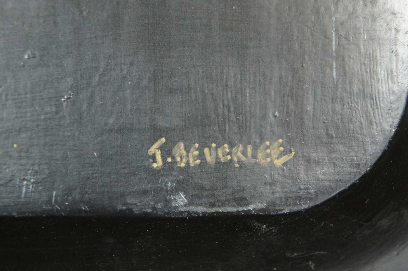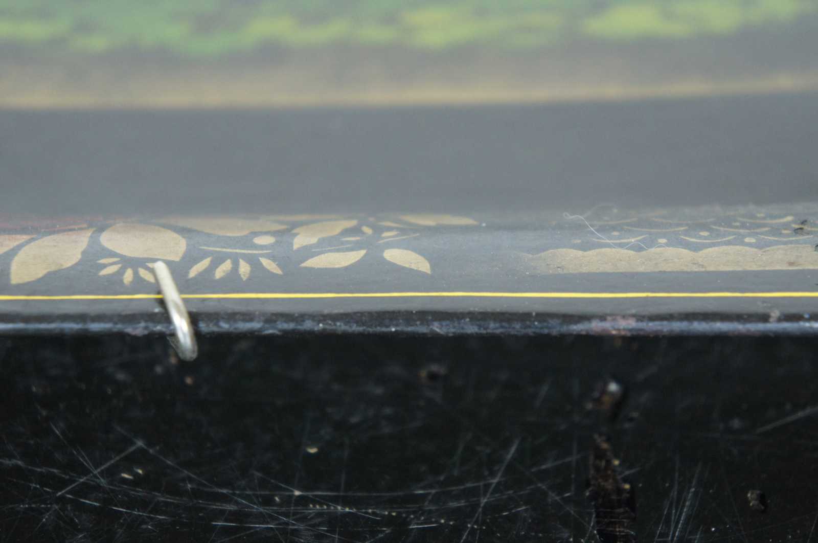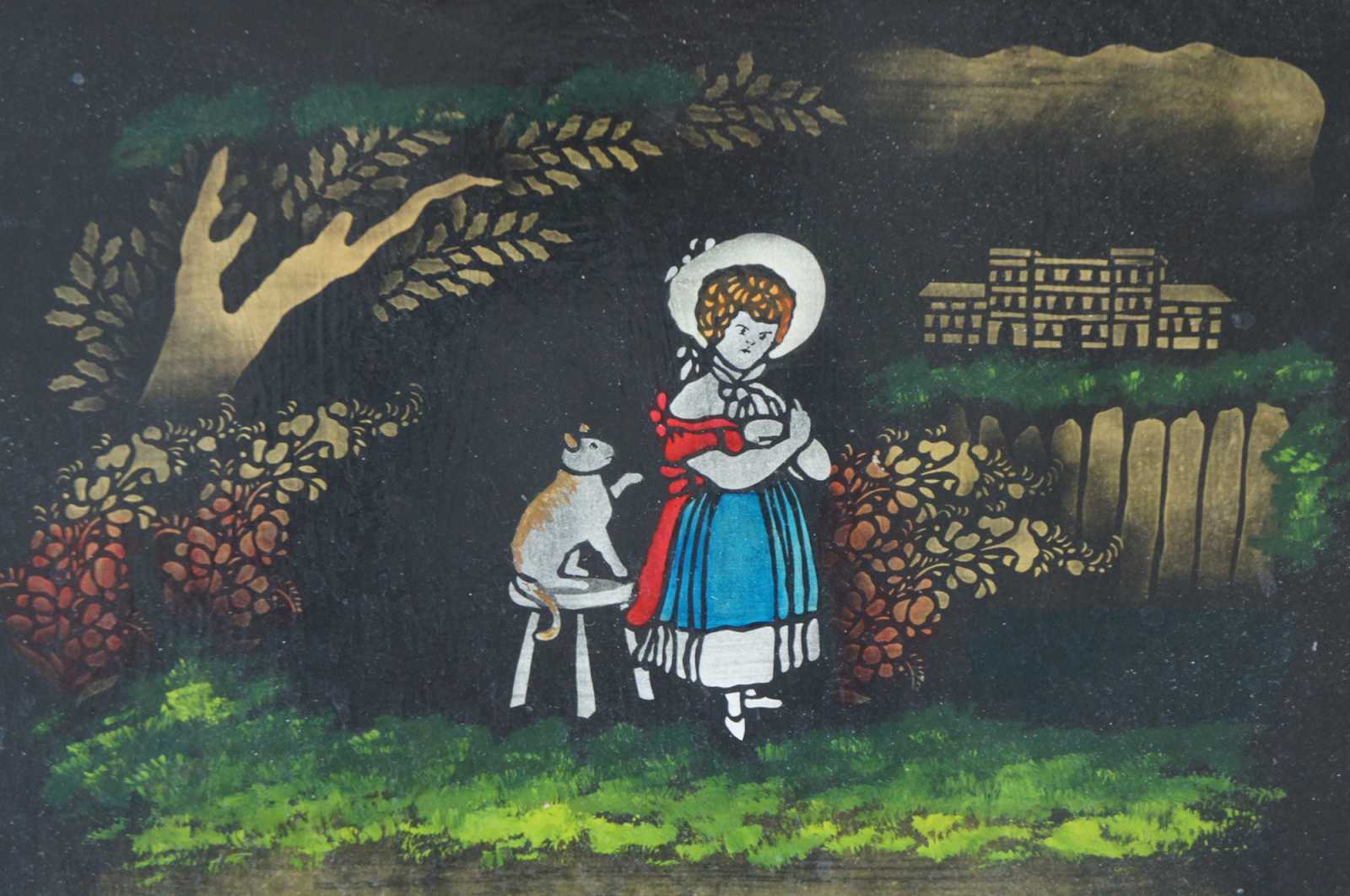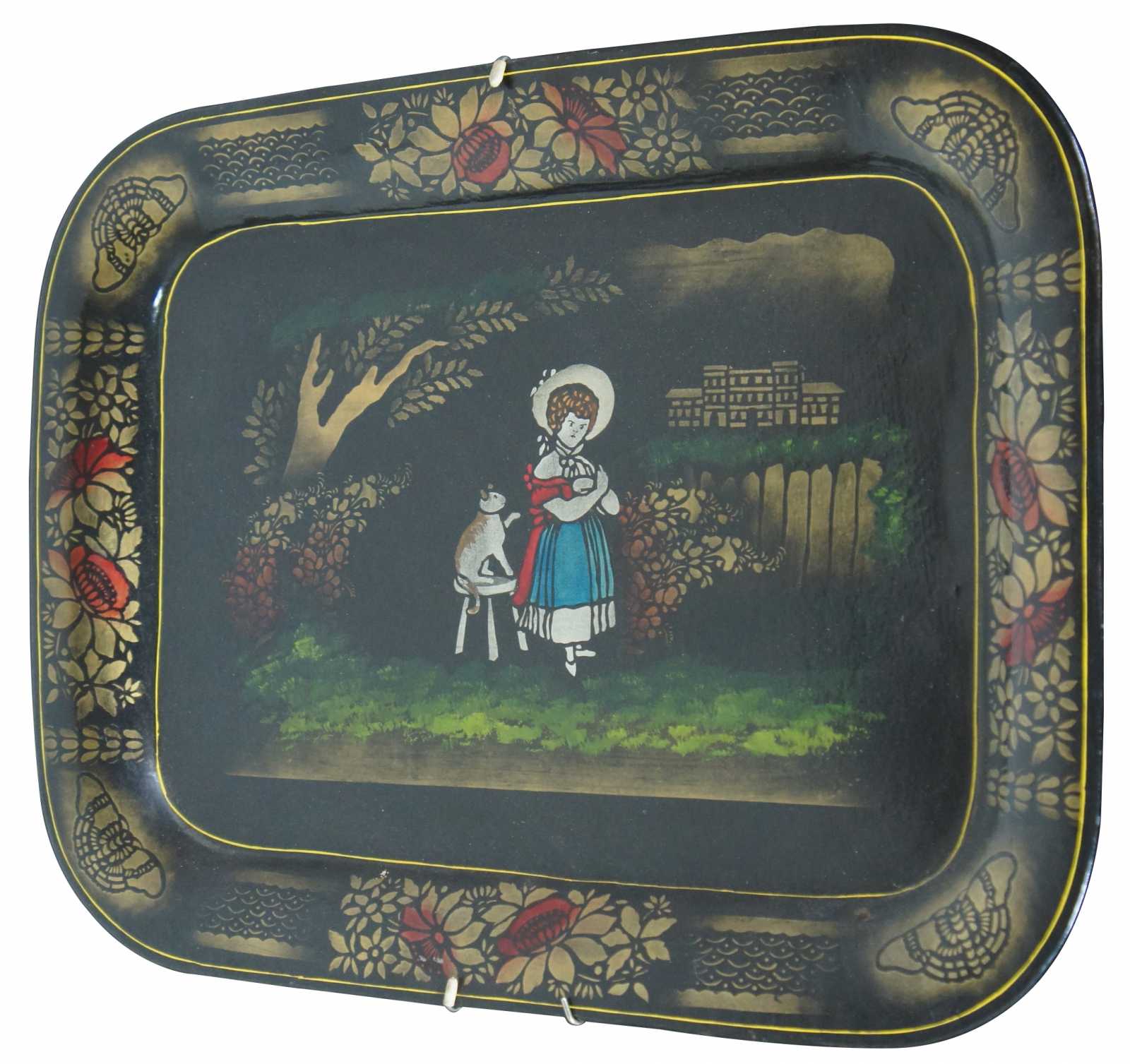 Vintage Americana folk art Toleware tray hand painted portrait on metal with a stenciled pastoral landscape featuring a grumpy young girl and a cat on stool, centered between a tree and fence with a grand house in the background. Detailed with floral adn butterfly design on border. Signed J. Beverlee on the reverse. Includes bracket for hanging on the wall.