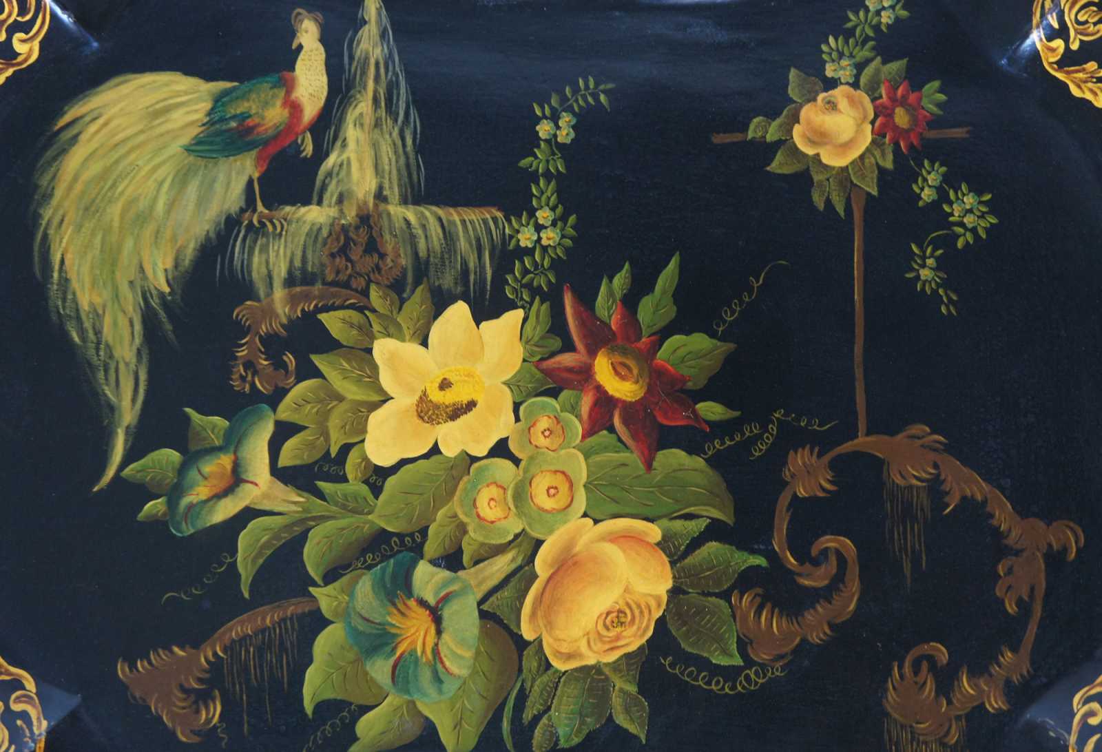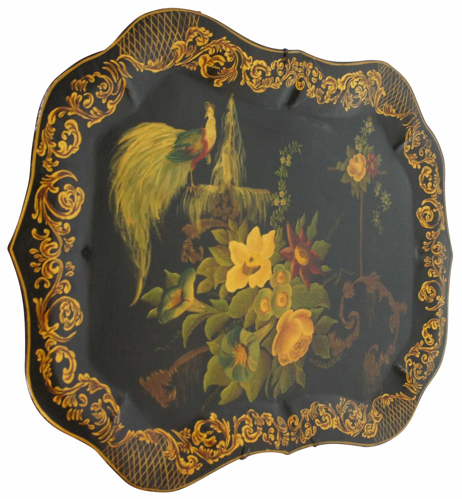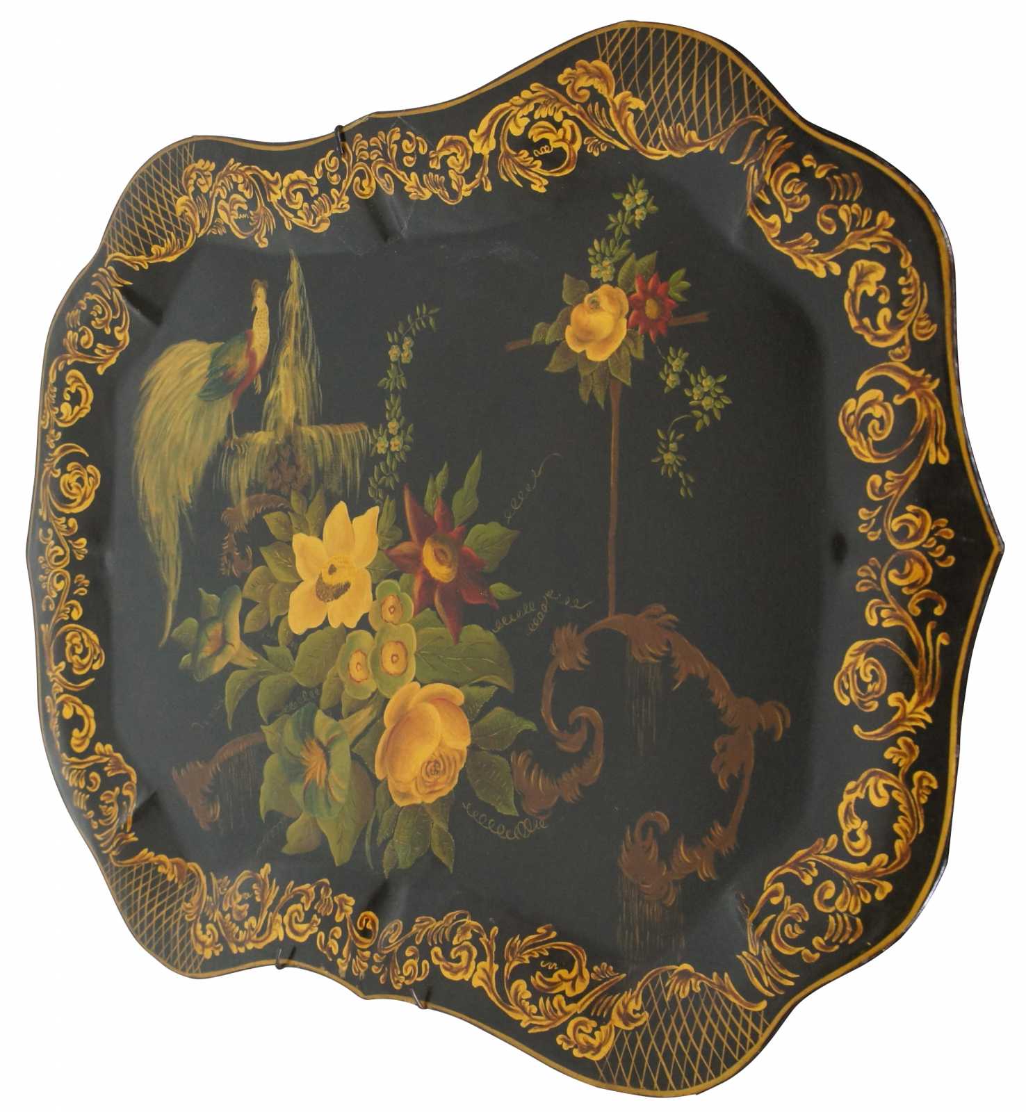 Vintage 1951 mid century scalloped Americana folk art toleware tray featuring a gold leaf border, an array of flowers, and a bird (Peacock) with long tail feathers perched on a fountain. Signed on backside, Betty Johnson. Attributed to Wingcraft.