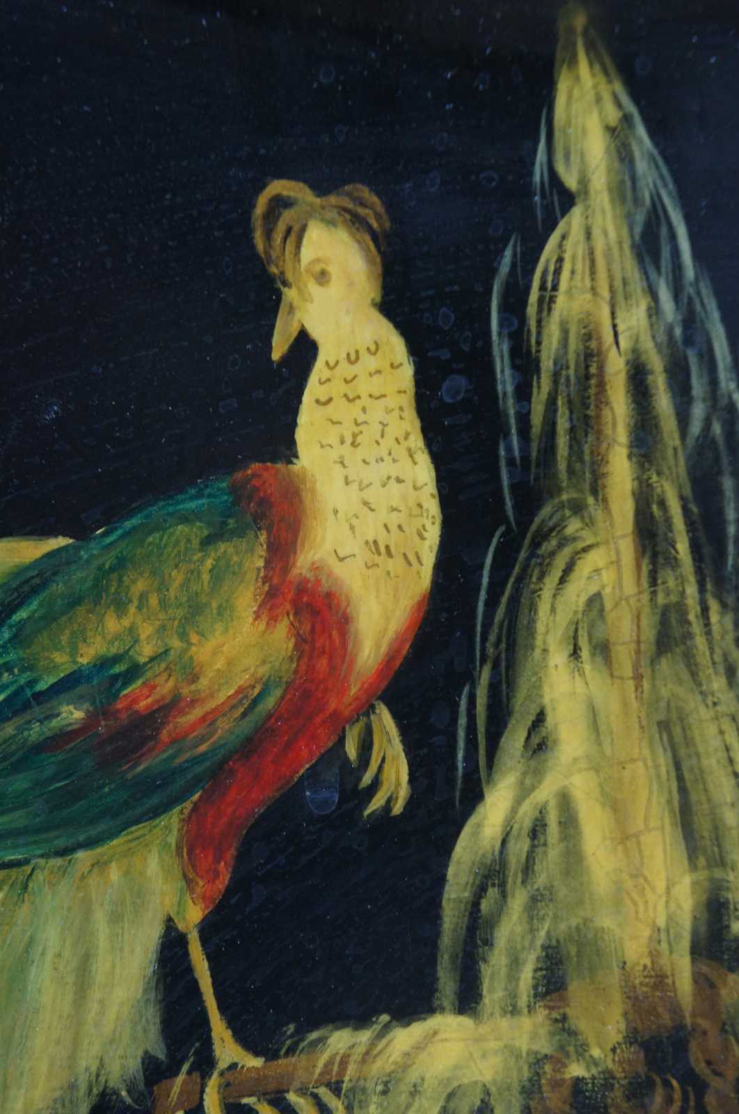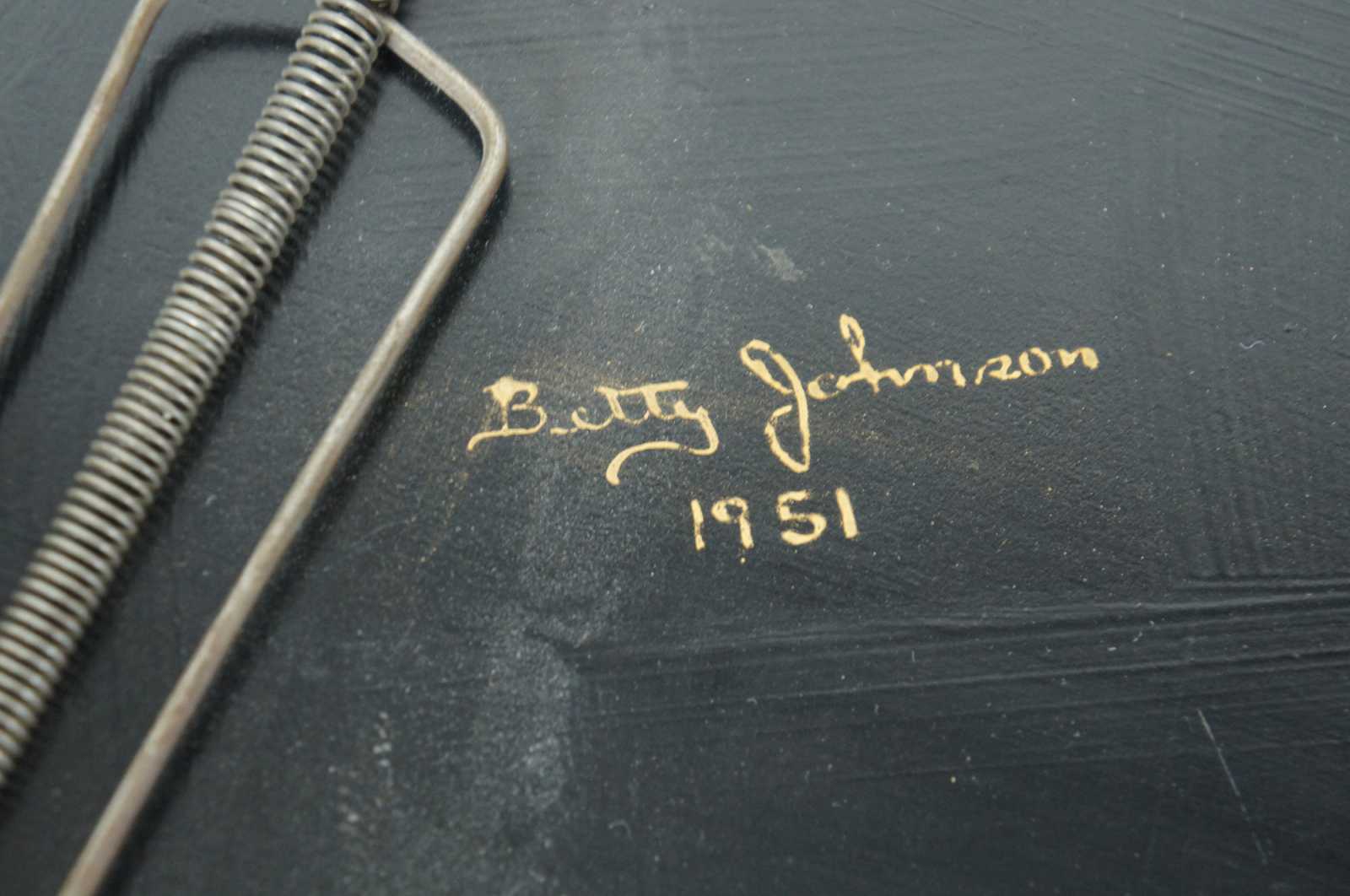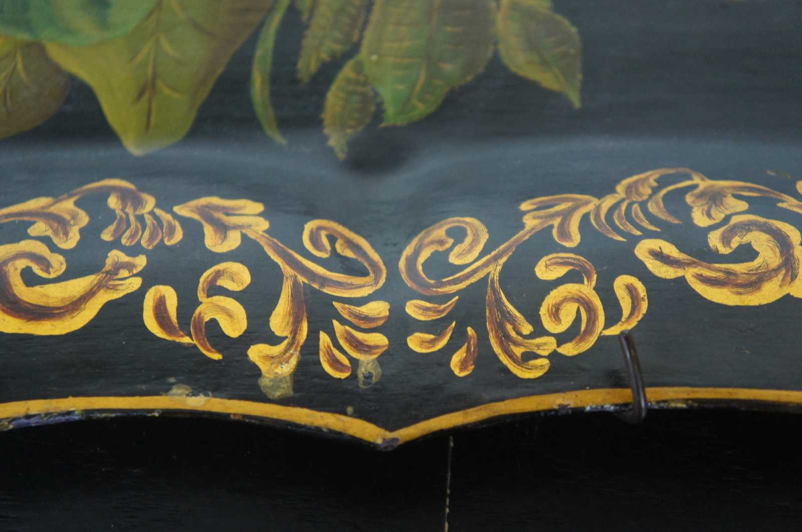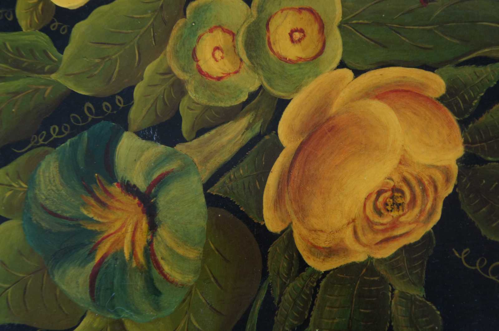 Vintage 1951 mid century scalloped Americana folk art toleware tray featuring a gold leaf border, an array of flowers, and a bird (Peacock) with long tail feathers perched on a fountain. Signed on backside, Betty Johnson. Attributed to Wingcraft.