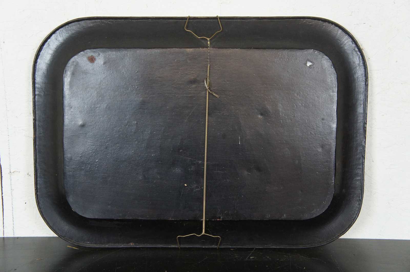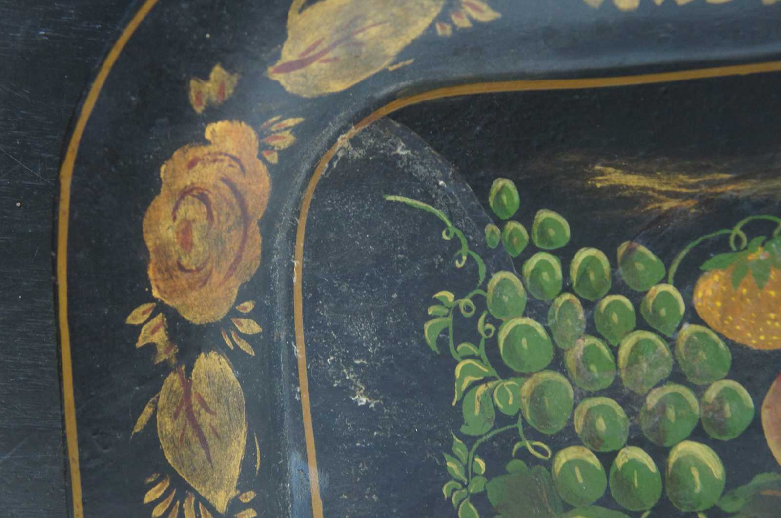 Large Americana folk art toleware tray, hand painted in black with gold floral border and a still life of a peacock (bird) surrounded by fruit. Includes bracket for hanging on the wall.