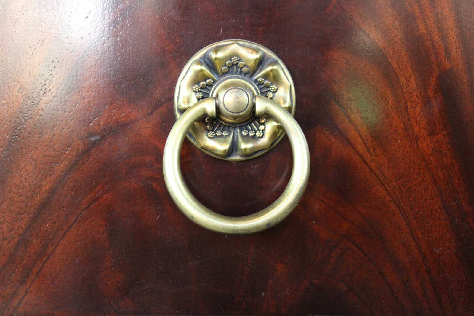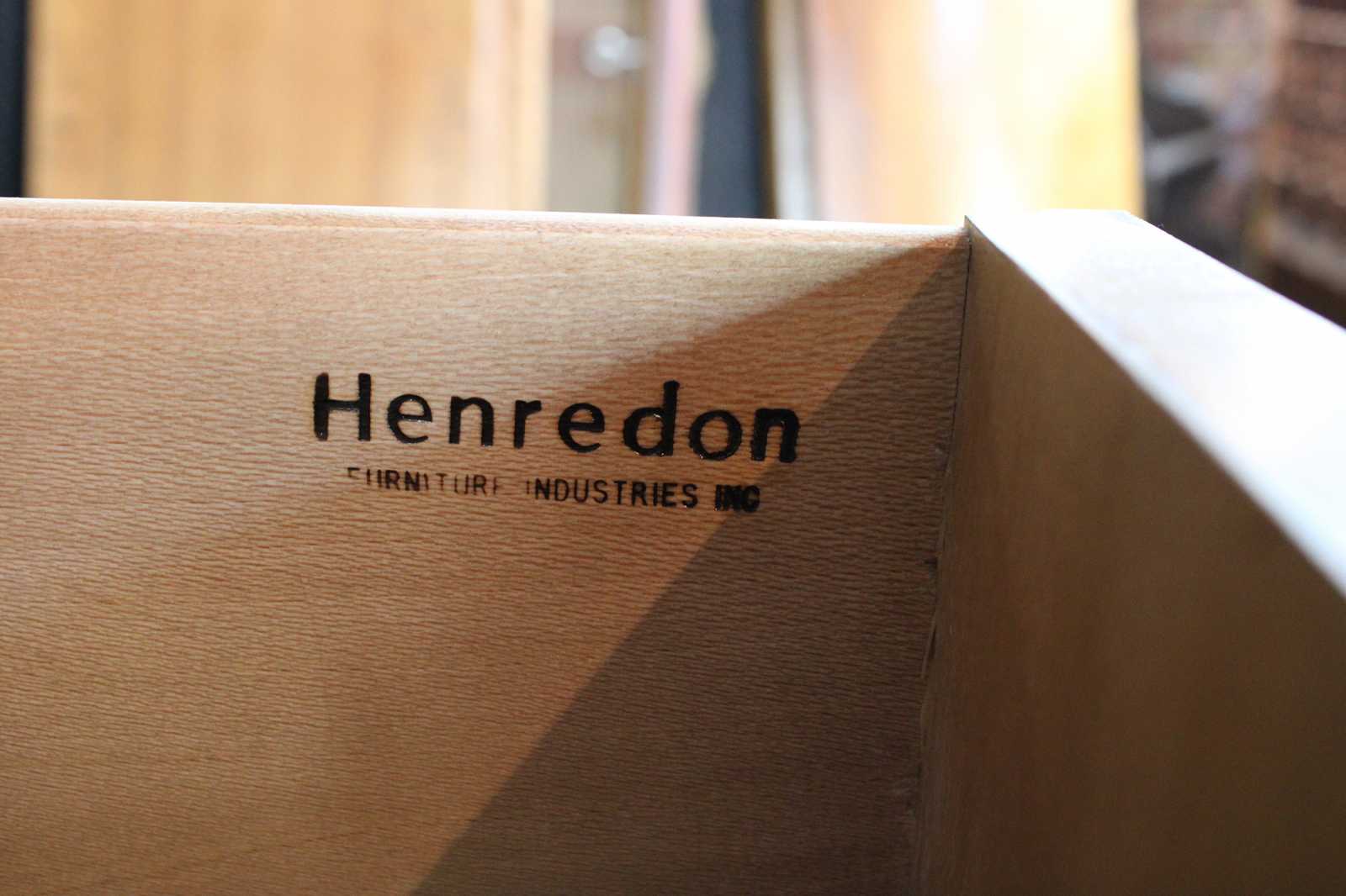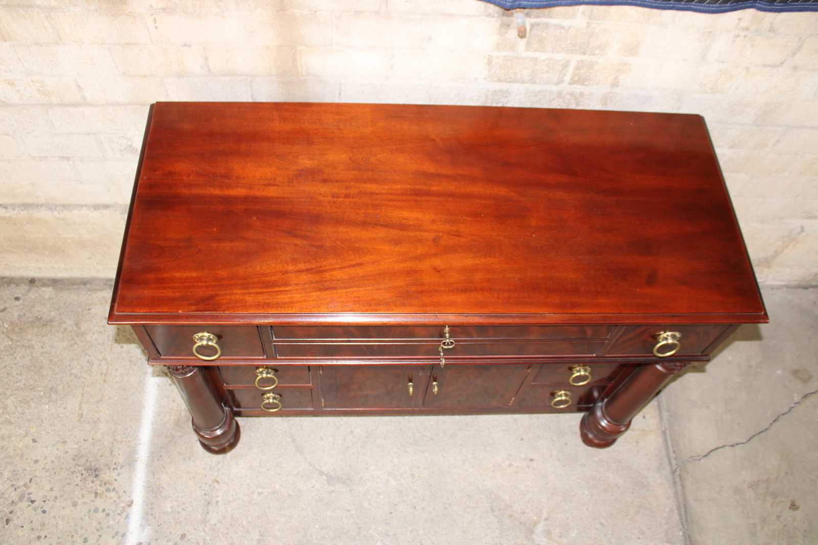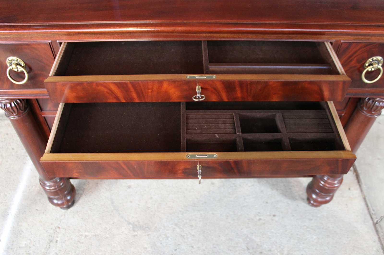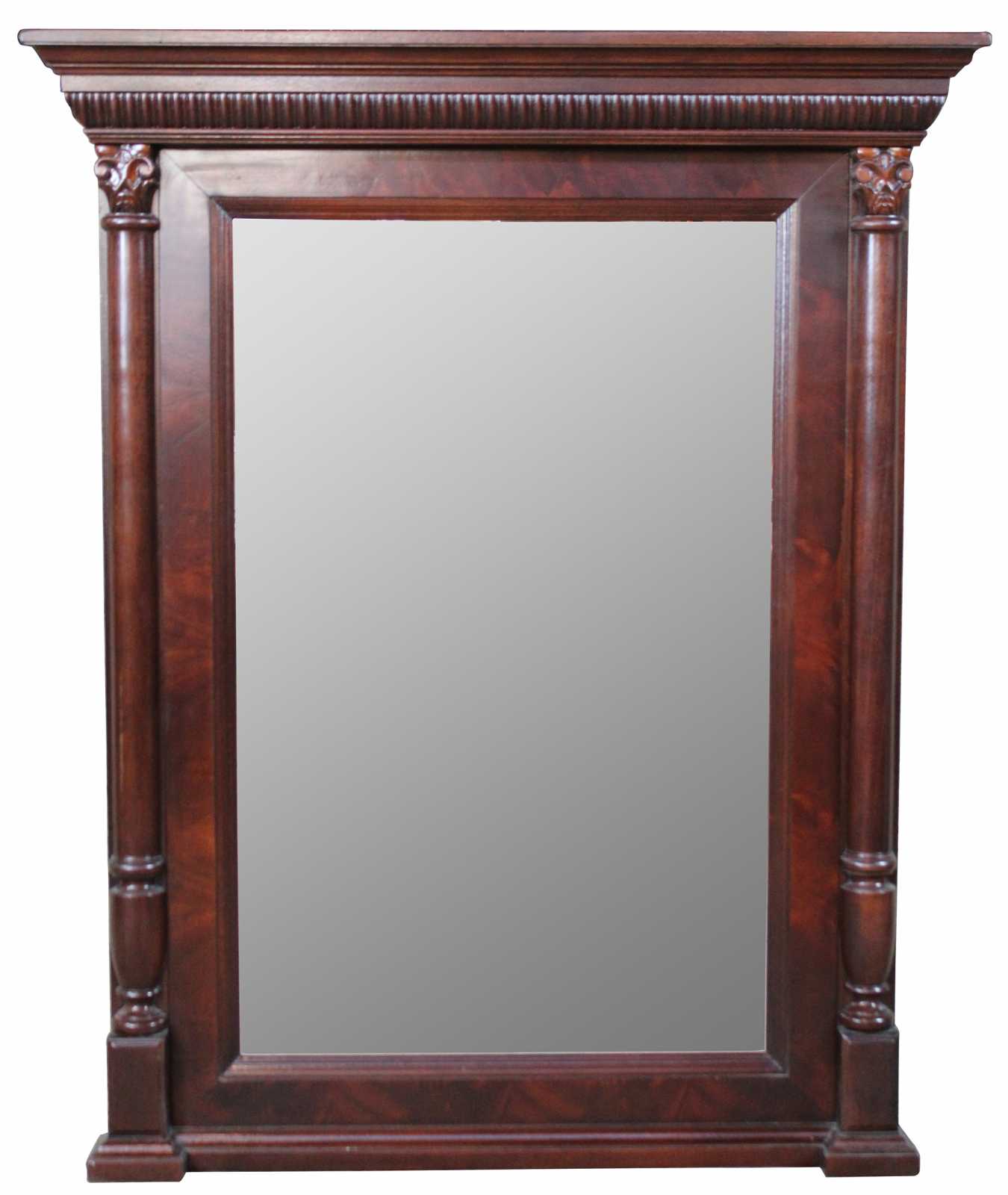 An exceptional example of French Empire styling by Henredon Industries. Made from crotch mahogany with ten drawers and and lower cabinet for storage. Includes beautifully turned and carved columns, a beveled hanging mirror, brass knocker pulls and two lockable felt lined jewelry drawers.