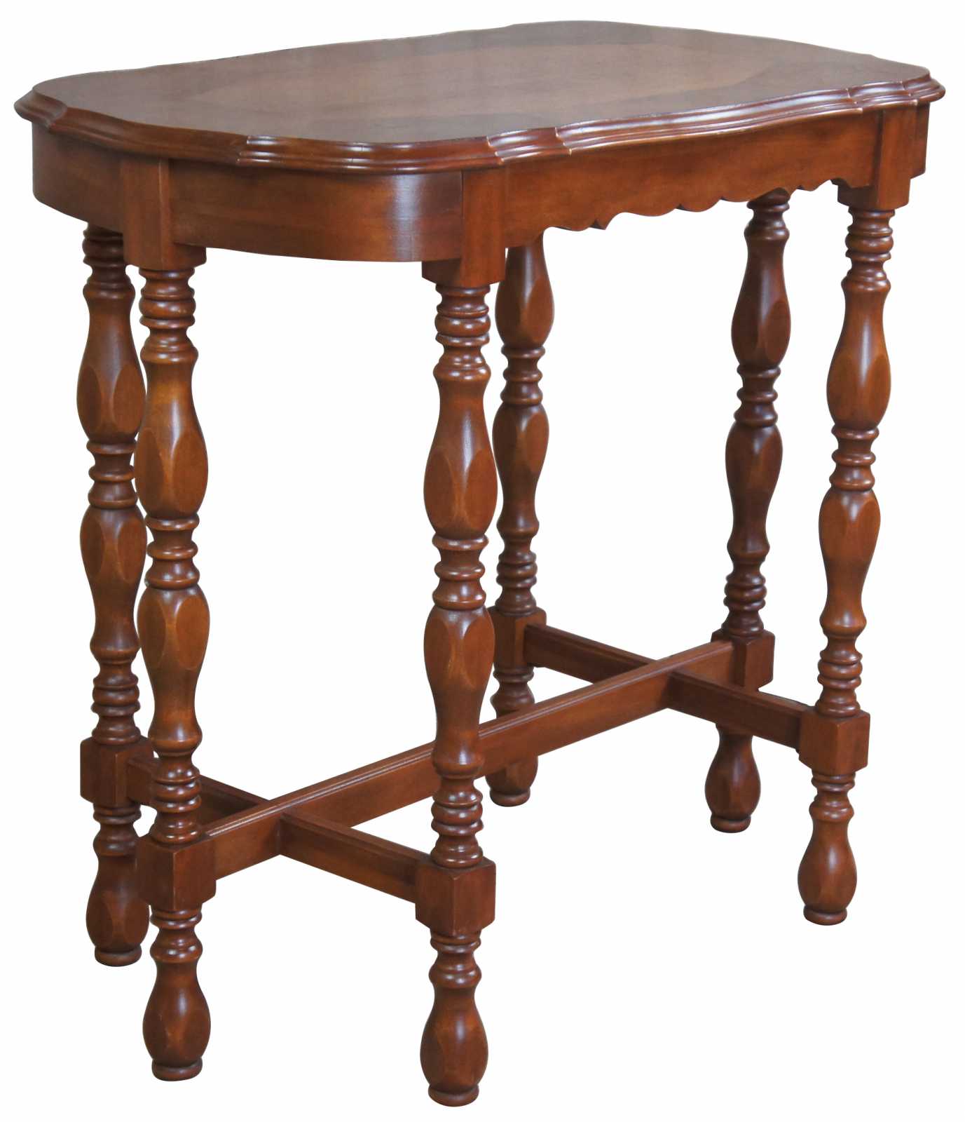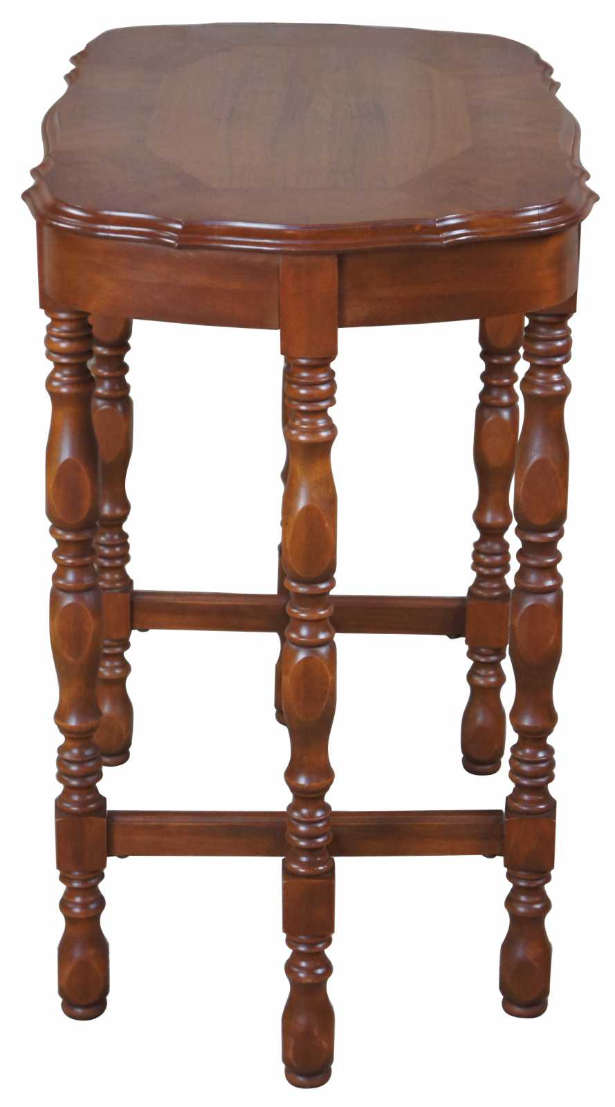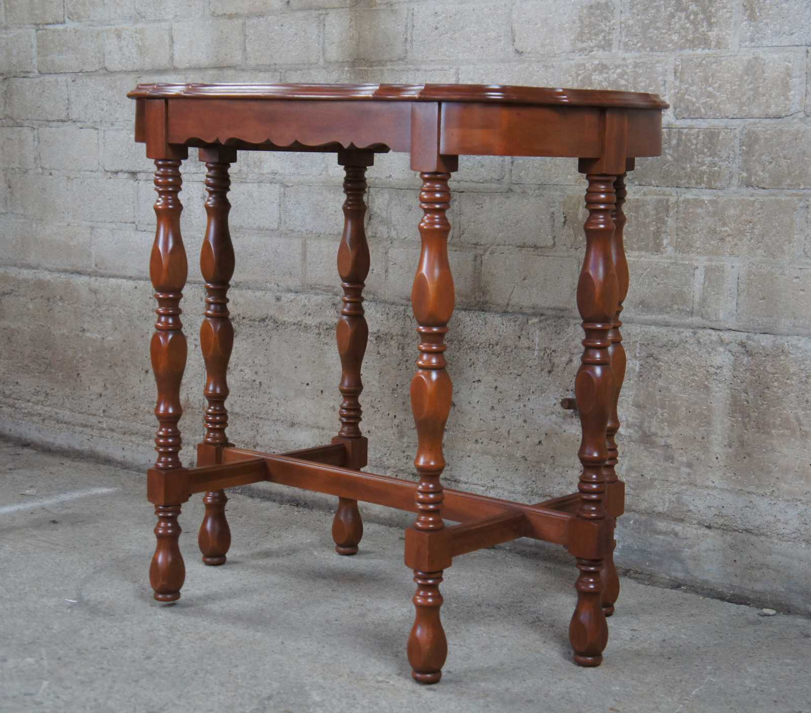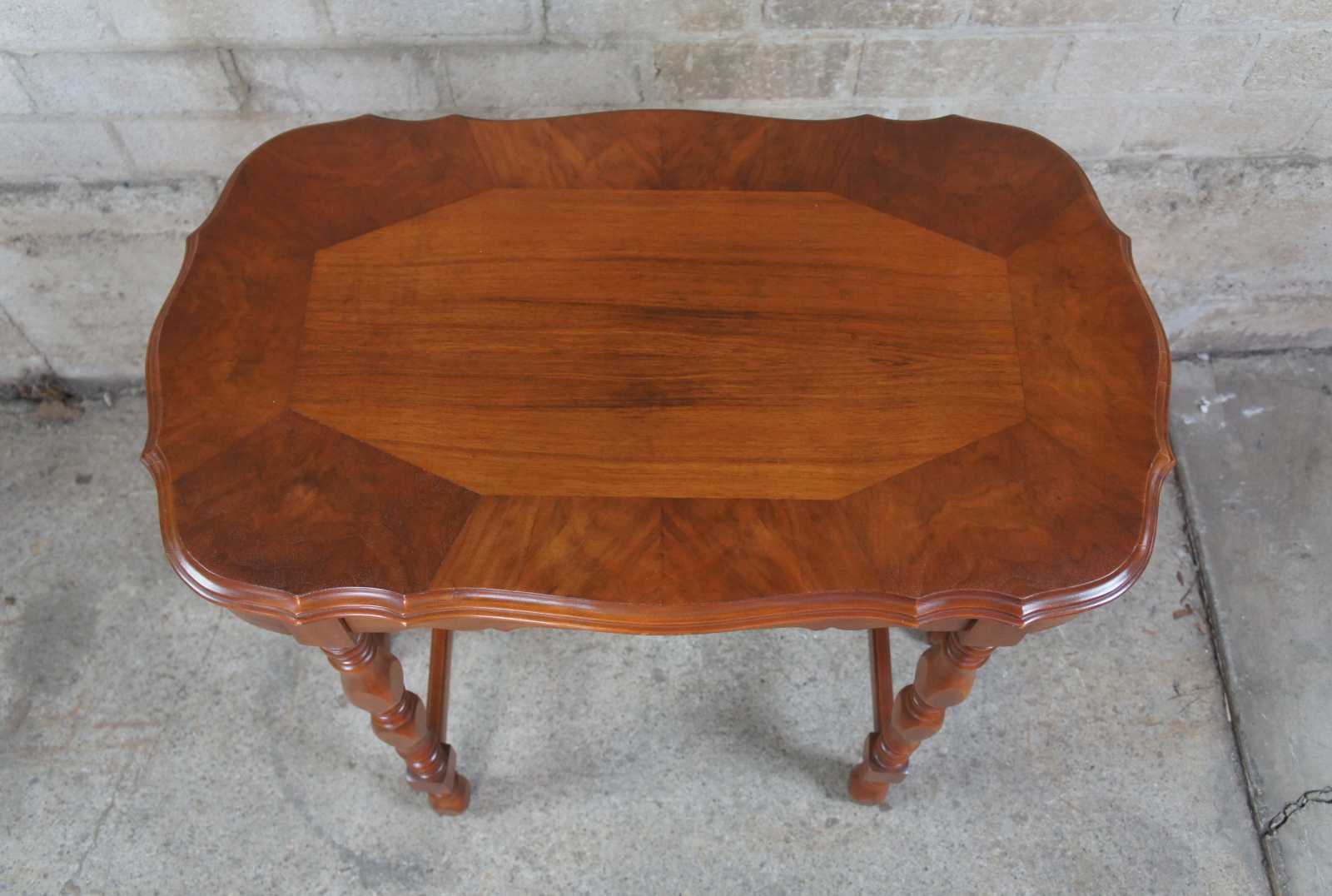 Vintage Jacobean side table. Made of walnut with a matchbook veneered top and scalloped serpentine shape supported by six turned legs and nubby feet.