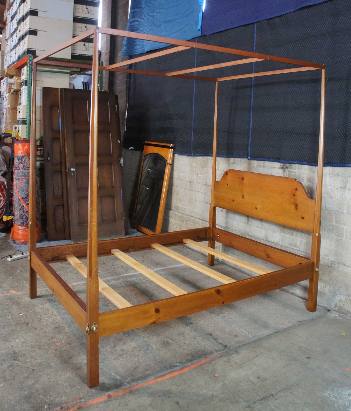 Early American pine full size pencil post canopy bed by David T Smith, Circa 1987. A style popularized in the late 1700s. Features a covered canopy, pencil posts and colonial hardware.