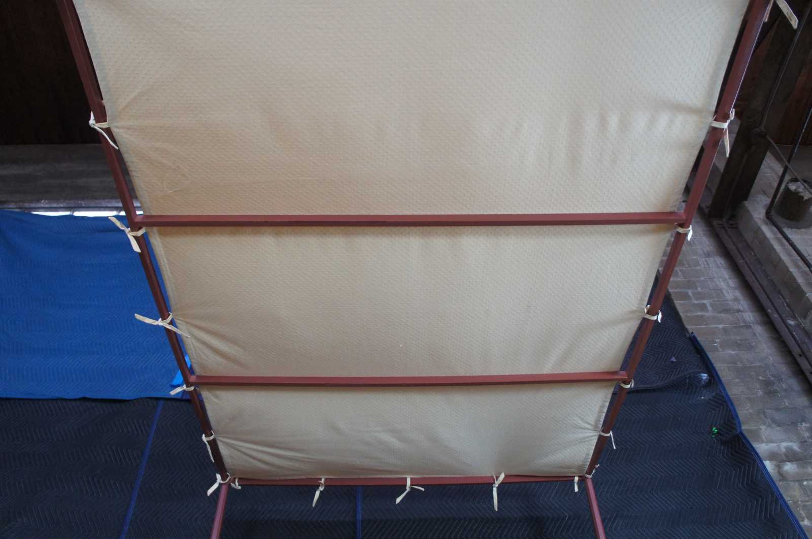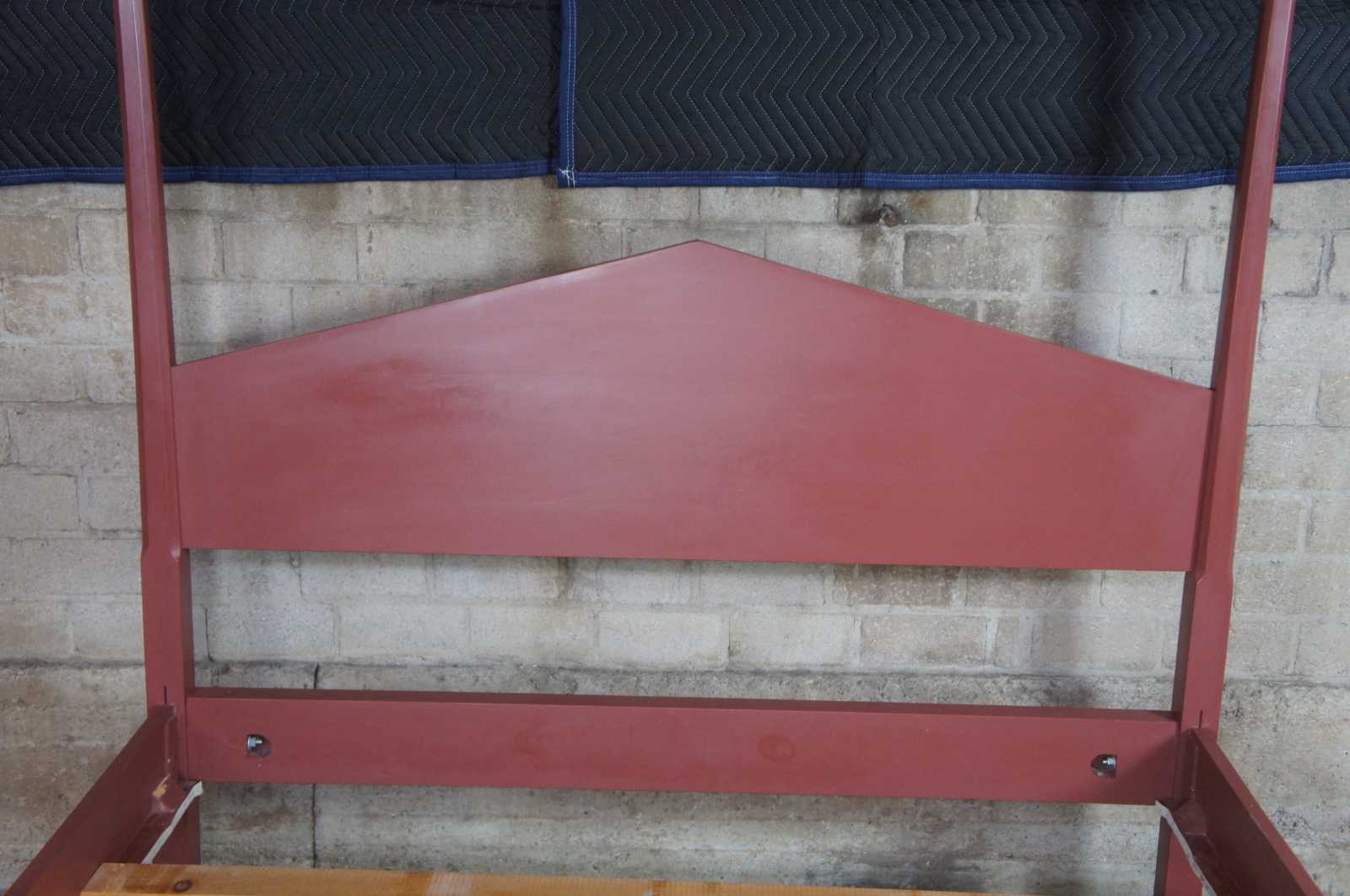 Early American painted pine full size pencil post canopy bed by David T Smith, Circa 1987. A style popularized in the late 1700s. Features a canopy with fabric, pencil posts and colonial hardware. Finished in Old Red.
