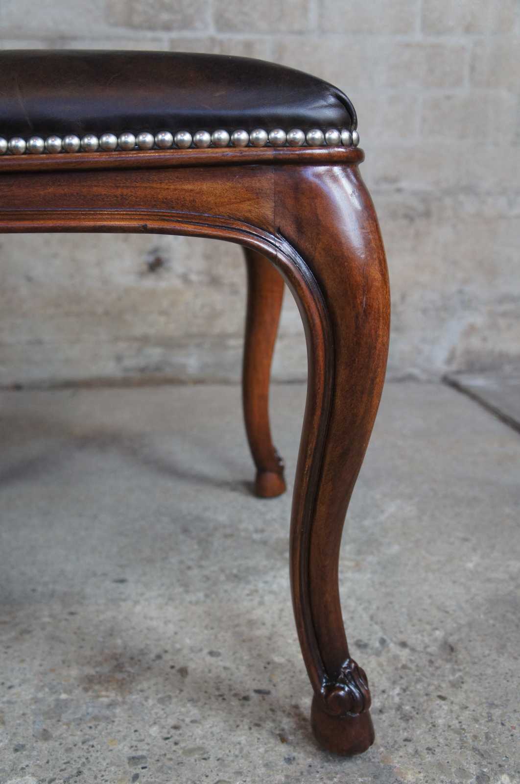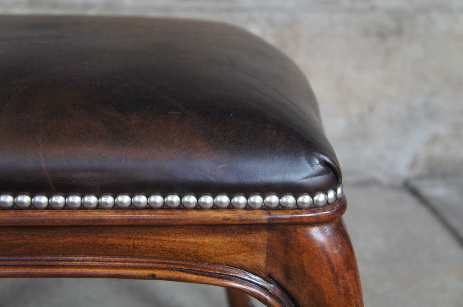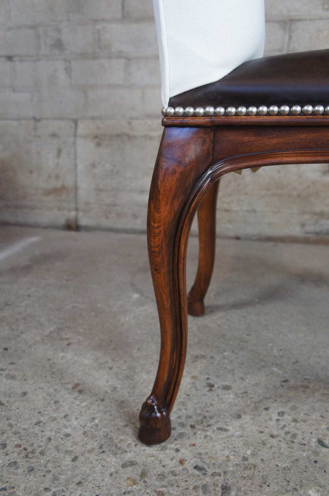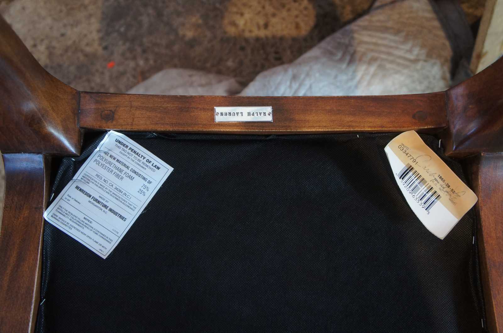 The Henredon Ralph Lauren Duke chair evokes traditional styling. Made from mahogany with leather seat and upholstered back. Features cabriole legs that lead to a hoof foot. Marked on underside. 1865-28-50