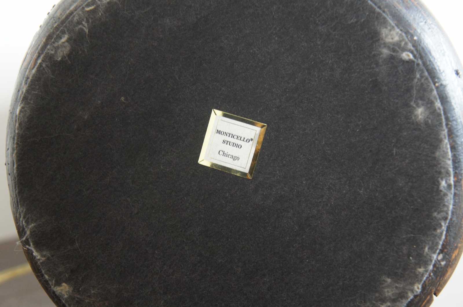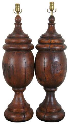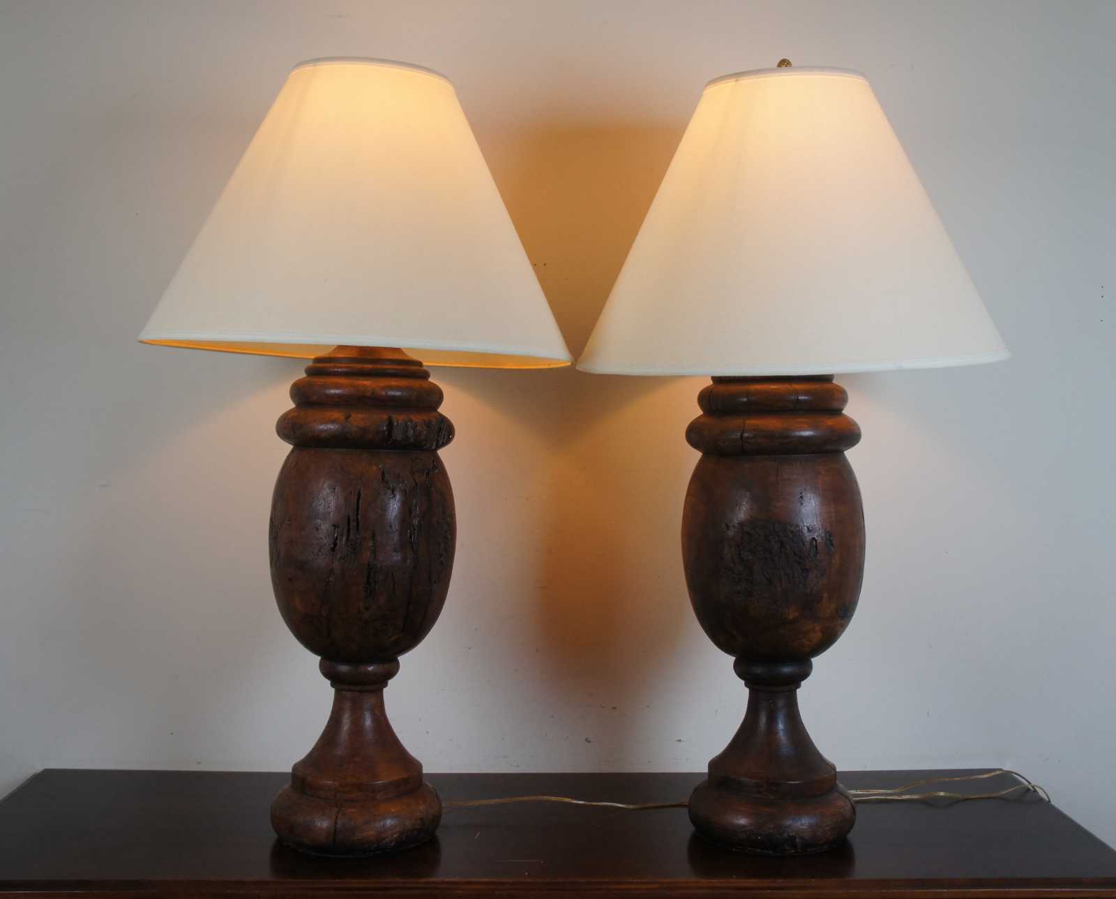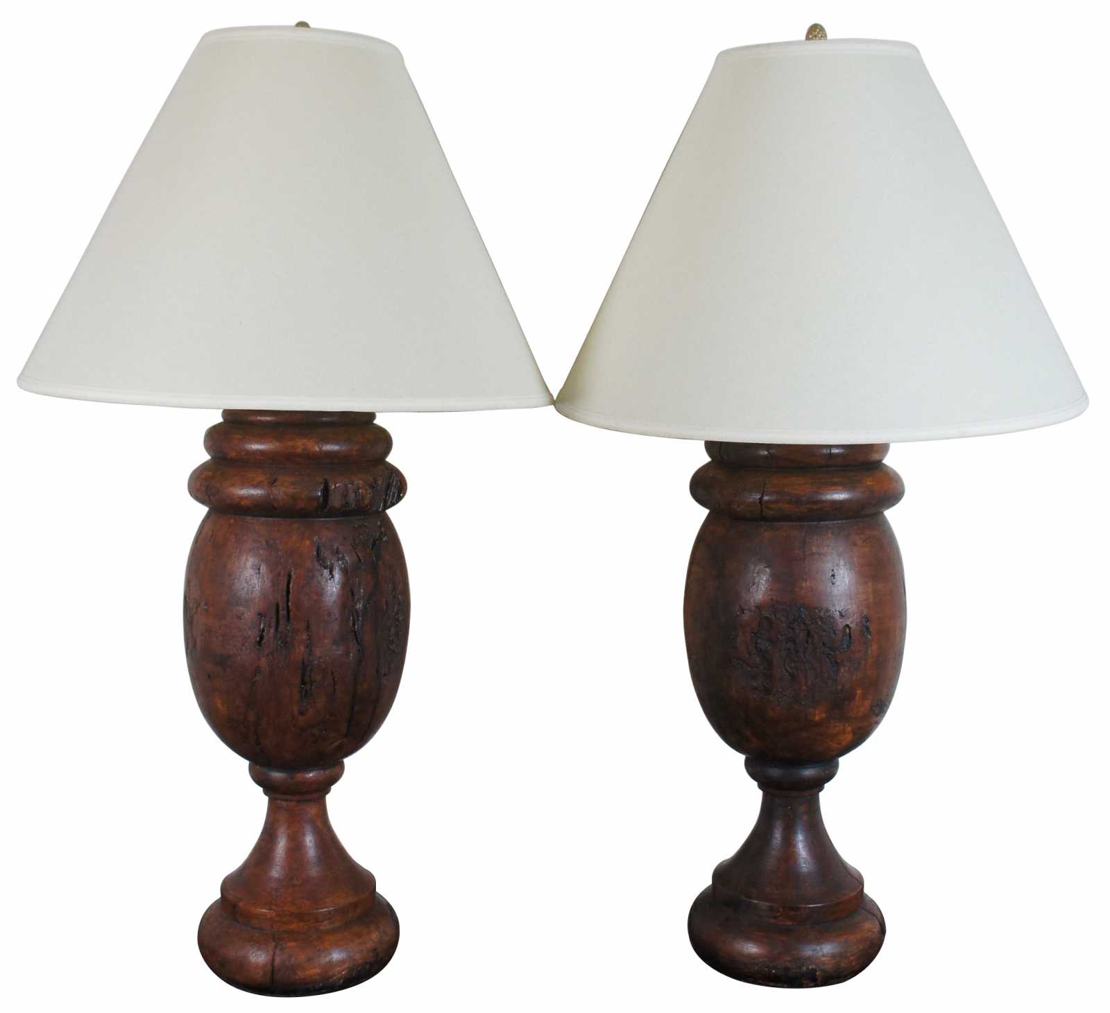 Two oversize table lamps by Monticello Studio, Chicago, marked at the bottom edge with the year, 1998, and 397. Made of ceramic, expertly molded and painted to resemble carved aged wood. Includes white shades and acorn finials.