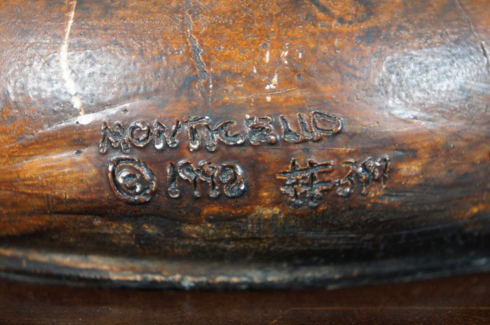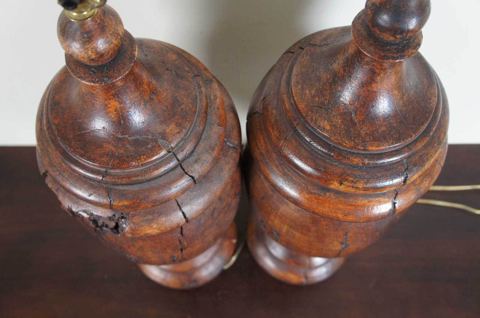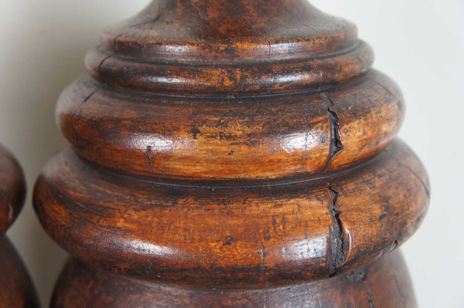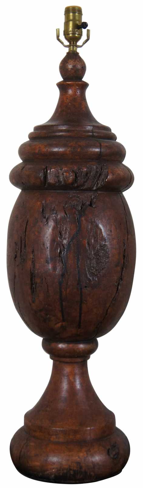 Two oversize table lamps by Monticello Studio, Chicago, marked at the bottom edge with the year, 1998, and 397. Made of ceramic, expertly molded and painted to resemble carved aged wood. Includes white shades and acorn finials.